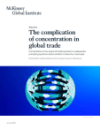 Global flows The complication of concentration in global trade Concentration in the origins of traded products is widespread, prompting questions about whether to diversify or decouple. By Olivia White, Jonathan Woetzel, Sven Smit, Jeongmin Seong, and Tiago Devesa PLACEHOLDER ONLY! Use Secondary image with Color adjustment treatment, following guidelines. © Fanatic Studio/Getty Images January 2023 At a glance — No region is close to being self-sufficient. Every region relies on trade with others for more than 25 percent of at least one important type of good. — About 40 percent of global trade is “concentrated.” Importing economies rely on three or fewer nations for this share of global trade (Exhibit). — Three-quarters of this concentration comes from economy-specific choices. In these cases (30 percent of global trade), individual countries source a product from only a few nations, even when global supply options are diversified. — Over the past five years, the largest economies have not systematically diversified the origins of imports. All have vulnerabilities, some more than others. — Informed reimagination of global trade requires a granular approach, both in mapping concentrated trade relationships and in deciding on action—whether to double down, decouple, or diversify. Web <year> <Title> Exhibit About 40 percent of global trade is ‘concentrated,’ mainly due to economy-specific factors Global trade value by type of concentration, 2021 Total goods trade Proportion by type of concentration, % Diversified trade Concentrated trade Importers depend on three or fewer nations1 Examples 60 40 10 30 Global concentration Few supplying economies, on which most importers rely Economy-specific concentration Many supplying economies exist, but each importer relies on only a few of them Iron ore Natural gas (pipeline) Airplanes Laptops Memory chips Diamonds Soybeans Vaccines Maize (corn) Concentration refers to the product-level concentration for the importing economy. In the underlying analysis, “concentrated trade” is defined as all imports with a Herfindahl-Hirschman Index (HHI) over 3,000; this approximately represents cases where a product is supplied to an importer by three or fewer economies. The 10% of trade corresponding to “few supplying economies” is defined as all products with a global export market HHI over 3,000. 2 Non-exhaustive. Examples given are the largest, ordered by total value of concentrated trade, across a range of sectors. Source: UN Comtrade, 2021; McKinsey Global Institute analysis 1 McKinsey & Company McKinsey Global Institute | The complication of concentration in global trade 1 We live in a highly interconnected world. Every region relies on imports for more than 25 percent of at least one important type of good, according to recent McKinsey Global Institute (MGI) research.1 Interconnections have created broad benefits over time, improving efficiency, increasing global product availability, and fostering economic growth. But recent supply chain disruptions, Russia’s invasion of Ukraine, and rising tensions between China and the United States have highlighted the importance of resilience. Firms and policy makers alike are examining where inputs come from, and, in some cases, contemplating reconfiguring or even breaking certain long-standing trade ties. Concentrated global trade creates complications. On the one hand, concentrated trade relationships can reflect and drive efficiency gains. On the other, interruption of concentrated trade flows can be particularly disruptive if products are harder to replace on short notice due to a lack of visibility and alternatives. Where do concentrated trading relationships exist across products and between countries? In the face of new disruptions, how should companies and countries adjust these relationships, if at all? To examine these questions, this article builds on the findings of MGI’s recent research on global flows, analyzing concentration across more than 120 countries, roughly 6,000 products, and eight million individual trade corridors.2 About 40 percent of global trade is ‘concentrated,’ mainly due to economy-specific factors For many products, countries rely on a diversified pool of trade partners. This is particularly true for larger economies. For example, China imports crude oil from more than 40 economies, and the United States imports cars from more than 25 nations. However, a significant portion of global trade is concentrated in the sense that an economy relies on only a handful of nations to source almost all of its imports of a specific product. Indeed, 40 percent of the value of global goods trade corresponds to cases 1 2 where the importing economy relies on three or fewer nations for the supply of a given manufactured good or resource (Exhibit 1). Narrowing the focus further, about 15 percent of global goods trade corresponds to cases where the importing economy relies on only two or fewer nations. In some instances, concentration arises because only relatively few economies export a given product, defined here as “global concentration.” Soybeans are an example (see Box 1, “A tale of two commodities: Global versus economy-specific concentration in soybeans and wheat”). However, such cases account for a relatively small share of total concentrated trade. Most concentration is due not to a lack of supplier economies. Instead, concentration arises because of specific choices to source products from only a few countries despite the fact that other potential supplying countries are available. In this research, this type of concentration is described as “economy-specific concentration.” Of the 40 percent of global trade value that relies on three or fewer supplier economies, about three-quarters corresponds to economy-specific concentration. In 40 percent of global trade in products (by value), the importing economy relies on three or fewer nations for the sup