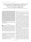 IEEE TRANSACTIONS ON INDUSTRIAL ELECTRONICS, VOL. 58, NO. 6, JUNE 2011 2531 A Fully Integrated HF-Band Passive RFID Tag IC Using 0.18-μm CMOS Technology for Low-Cost Security Applications Jong-Wook Lee, Senior Member, IEEE, Duong Huynh Thai Vo, Quoc-Hung Huynh, and Sang Hoon Hong Abstract—We present a fully integrated small-size HF-band passive RF identification (RFID) tag chip with authentication and security functions. The design of the RF transceiver and digital control of the tag IC is based on the International Organization for Standardization-14443 type-B protocol. The design of the key analog part of the tag IC is presented, which includes a robust demodulator for 10% amplitude shift keying envelope detection, a high-quality random number generator, and a voltage regulator that can handle a range of output load currents. To implement the secure data transaction with a reader, a 128-b advanced encryption standard (AES) with a new cyclic key generation is used for the data encryption and decryption. An on-chip 4-kb electrically erasable programmable ROM (EEPROM) is used to support the AES operation, tag identification, and tag self-destruction. The read and write accesses of the EEPROM are performed using a 128-b wide buffer with self-timed bursts. The tag chip is fabricated in a one-poly six-metal low-power 0.18-μm CMOS process with a CoSi2 Schottky diode and EEPROM process. Using the scaled-down CMOS technology, the size of the tag chip is only 1.1 × 1 mm2 , providing a cost-effective solution for everyday RFID applications. Index Terms—CMOS, HF band, radio frequency identification (RFID), Schottky, tag IC. I. I NTRODUCTION R ADIO FREQUENCY IDENTIFICATION (RFID) is a technology which is widely used in applications such as supply chain management, logistics, building/house access control, and traffic toll collections [1]–[4]. One important advantage of the RFID technology is its inherent security and reliability. By employing the authentication and security functions available from the RFID tag IC, intentional deception and false modification of the product identification are effectively prevented. Utilizing the reliable security measure, the RFID technology is increasingly adopted for high-cost products, such as Manuscript received February 18, 2010; revised May 19, 2010 and June 13, 2010; accepted July 11, 2010. Date of publication August 3, 2010; date of current version May 13, 2011. This work was supported by the Korean Government (Ministry of Education, Science, and Technology) through the Mid-Career Researcher Program under the National Research Foundation of Korea Grant 2009-0078157. J.-W. Lee and S. H. Hong are with the School of Electronics and Information, Kyung Hee University, Suwon 446-701, Korea (e-mail: daniel@khu.ac.kr). D. H. T. Vo and Q.-H. Huynh are with the School of Electronics and Information, Kyung Hee University, Suwon 446-701, Korea, and also with Silicon Design Solutions, Milpitas, CA 95035 USA. Color versions of one or more of the figures in this paper are available online at http://ieeexplore.ieee.org. Digital Object Identifier 10.1109/TIE.2010.2060460 liquor and jewelry, in order to guarantee the quality of genuine items. The HF-band RFID technology has inherent advantages in terms of security and reliability due to the close contact operation. Because a barcode identification system is very cheap, low cost is essential in order to extend the use of the RFID technology to everyday low-cost items. Previously, a few HF-band tag ICs were reported [5]–[8]. These were implemented based on the International Organization for Standardization (ISO)/International Electrotechnical Commission (IEC)-14443 type-B protocol [9] and ISO/ IEC-15693 [10]. The work in [6] had a built-in Digital Encryption Standard block to provide the security functions through authentication and encryption. Previous works were designed using 0.8- and 0.6-μm CMOS technology in [5] and [6], respectively. The sizes of these tag chips were quite large, i.e., 11 and 8 mm2 , respectively, in view of the current CMOS technology. In addition, the power consumptions of these tag chips were more than 2 mW due to high supply voltages. Recently, an RFID tag IC with a ferroelectric random access memory (FeRAM) using 0.35-μm CMOS technology has been reported [8]. Since the FeRAM has a lower programmable voltage than the electrically erasable programmable ROM (EEPROM), the use of the FeRAM can provide advantages in terms of the operating distance and the tag read/write speed. However, implementing a security function in an RFID tag using the FeRAM is difficult because of its limited endurance and lifetime for data storage. In this paper, we present a fully integrated RFID tag chip solution for cost-effective applications. Compared to the previously reported tag ICs [5]–[8], our design is based on a scaled-down low-power 0.18-μm CMOS process. The use of advanced technology and new circuit design techniques has allowed a significant reduction in the chip size. The size of the tag IC is just 1.1 mm2 , which is the smallest of all of the HF-band RFID tag ICs reported to date. Furthermore, the power consumption is as low as 360 μW, which is a factor of five times lower than the previously reported data in [5] and [6]. The low power consumption allows a tag IC to be used with a smaller tag antenna. The ISO-14443 type-B standard uses 10% amplitude shift keying (ASK) modulation for its reader-totag communication. The detection of small amplitude changes due to temperature and process variations is challenging. In this paper, a new voltage mode demodulator is proposed, and a detailed design technique is presented for reliable data 0278-0046/$26.00 © 2010 IEEE 2532 IEEE TRANSACTIONS ON INDUSTRIAL ELECTRONICS, VOL. 58, NO. 6, JUNE 2011 Fig. 1. Functional block diagram of analog part of tag IC. Fig. 2. Circuit schematic of the RF limiter with rectifier and reader-to-tag interface model. demodulatio