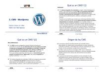 Qué es un CMS? (1) Definición: “Un sistema de gestión de contenidos (en inglés: Content Management System, más conocido por sus siglas CMS) es un programa informático que permite crear una estructura de soporte (framework) para la creación y administración de contenidos, principalmente en páginas web, por parte de los administradores, editores, participantes y demás usuarios. Consiste en una interfaz que controla una o varias bases de datos donde se aloja el contenido del sitio web. El sistema permite manejar de manera independiente el contenido y el diseño. Así, es posible manejar el contenido y darle en cualquier momento un diseño distinto al sitio web sin tener que darle formato al contenido de nuevo, además de permitir la fácil y controlada publicación en el sitio a varios editores. Un ejemplo clásico es el de editores que cargan el contenido al sistema y otro de nivel superior (moderador o administrador) que permite que estos contenidos sean visibles a todo el público (los aprueba)”. 2. CMS - Wordpress Cómo crear un sitio Web con Wordpress Fuente: https://es.wikipedia.org/wiki/Sistema_de_gesti%C3%B3n_de_contenidos Curso 2022-23 Qué es un CMS? (2) 2 Origen de los CMS Otras definiciones: “Un CMS (content management system) Sistema de Gestión de Contenidos en español, es una aplicación web a la que podremos acceder a través de una navegador tras ser instalada en un servidor. A través de su panel de administración podremos crear, eliminar, modificar y en definitiva, gestionar el contenido de la “página web” (sitio web). Por lo que también podríamos definirlo como una herramienta que nos permite la creación de una “página web” (sitio web) y su gestión por perfiles no técnicos”. Fuente: Joaquín Barberá. “Un sistema de gestión de contenidos o CMS es un programa que permite crear una estructura de soporte (framework) para la creación y administración de contenidos en una página web por parte de los administradores, editores, y otros usuarios de la aplicación”. Fuente: Víctor López 2. CMS - WordPress 2. CMS - WordPress 3 Los primeros sistemas de administración de contenidos fueron desarrollados por organizaciones que publicaban una gran cantidad de contenido en Internet, y necesitaban de continuas actualizaciones; como revistas en línea, periódicos y publicaciones corporativas. En 1995, el sitio de noticias tecnológicas CNET sacó su sistema de administración de documentos y publicación y creó una compañía llamada Vignette, pionero de los sistemas de administración de contenido comerciales. La evolución de Internet hacia portales con más contenido y la alta participación de los usuarios directamente, a través de blogs y redes sociales, ha convertido a los gestores de contenidos en una herramienta esencial en Internet, tanto para empresas e instituciones como para personas. 2. CMS - WordPress 4 Entornos Front-end / Back-end (1) Entornos Front-end / Back-end (2) El concepto “Back-end” se refiere al apartado de administración de una web (gestión), mientras que “Front-end” se refiere a la parte que ve el usuario. Los CMS se caracterizan por tener dos entornos: a) El Front-end: es la parte pública del sitio web, a la que accedemos escribiendo la URL del sitio en la barra de direcciones del navegador web www.lapaginaquesea.com b) El Back-end: es la parte privada de la página web (sitio web) o lo que también se conoce como el panel de administración del sitio web. Desde aquí se puede gestionar el contenido del sitio web, su estructura, diseño y los diferentes elementos de configuración. Para acceder al Back-end de un CMS hay que escribir una url especial que dependerá del CMS utilizado. En el caso de WordPress hay que añadir al nombre de dominio la palabra “/wp-admin”, por ejemplo: www.lapaginaquesea.com/wp-admin Front-end Back-end 2. CMS - WordPress 5 Perfiles de usuario de un CMS (1) 6 Perfiles de usuario de un CMS (2) Hay que diferenciar la programación/diseño de una web/blog, de su mantenimiento y de la creación de contenidos. Perfil de Webmaster: El mantenimiento puede ser realizado por alguno de los perfiles de programador/Diseñador anteriormente mencionados, o bien por los creadores de contenidos, si tienen cierto conocimiento del funcionamiento del CMS (Back-end y Dashboard) Perfil de Programador/Diseñador: En la programación/diseño de la web/blog hay dos tipos de perfiles de desarrollador: Site builders: usuarios que pueden instalar plataformas, plantillas, módulos, plugins, pero que no tocan código, ni tienen necesariamente conocimientos de programación en PHP. Aquí se encuentran los diseñadores gráficos, maquetadores web y otros perfiles profesionales vinculados con el sector publicitario, responsables de comunicación online y Marketing. Programadores PHP: pueden programar módulos, retocar el código de webs ya existentes, de plantillas, etc. También son los que forman la comunidad de desarrolladores de cada CMS, que continuamente crean plugins, extensiones y demás y contribuyen a las nuevas versiones de los productos de programario libre. 2. CMS - WordPress 2. CMS - WordPress 7 Perfil de Content Generator: La creación de contenidos, totalmente independiente del diseño y el mantenimiento, puede realizarla cualquier usuario. No son necesarios conocimientos del CMS Back-end sino solamente del Dashboard. 2. CMS - WordPress 8 CMS Software libre vs privativo Búsquedas en Google Sobre CMS Hoy en día existen sistemas desarrollados en software libre y software privativo. En ambos casos es necesaria una implantación para adaptar el gestor de contenidos al esquema gráfico y funcionalidades deseadas. Para ciertos gestores existen muchas plantillas disponibles que permite una sencilla implantación de la parte estética por parte de un usuario sin conocimientos de diseño. Algunos ejemplos de Open Source desarrollados en PHP son Wordpress, Joomla! y Drupal. Para los dos primeros 