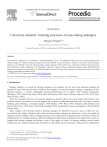 Available online at www.sciencedirect.com Procedia Social and Behavioral Sciences 2 (2010) 4098–4108 WCES-2010 University students’ learning processes of note-taking strategies Duygu Çetingöza * a Dokuz Eylül Üniversitesi, øzmir, 35150, Turkey Received November 2, 2009; revised December 10, 2009; accepted January 18, 2010 Abstract This research, conducted on the History of Turkish Republic Lesson , investigated a)when University students learned note taking strategies b) which note-taking strategies have been difficult to learn for them c) whether or not they learned strategies which are not included in the note taking strategy learning program. The research was conducted at Dokuz Eylul University, Buca Education Faculty, Department of Elementary Education, Social Sciences Education program during 2004-2005 Fall semester on students who took History of Turkish Republic Lesson. The data of the research was collected through Note Taking Strategy Performance Evaluation Form. © 2010 Elsevier Ltd. Open access under CC BY-NC-ND license. Keywords: Learning strategy; strategy instruction; note-taking strategy; learning processes; university students. 1. Introduction Strategy teaching is to teach the learning strategies to the students. By the end of the education students are expected to know how and when they would use the strategies, to make the strategic learning a component of their learning schema’s, to achieve independent learning characteristic and to improve their learning performance (Beckman, 2002; Chamot and others, 2003; Duke and Pearson, 2003; Jones, Palincsar, Ogle and Carr, 1987; Paris, 1988; Pressley, 1995). There are researches that show the strategy teaching has positive effects on several student characteristics like academic success, motivation to succeed, keeping sth. in mind, to understand what they read, self respect, creative thinking, critical thinking, to transfer (AçÕkgöz, 1984; BjerklÕe, 1994; Block, 1993; Ferguson, 2001; Palinscar and Brown, 1983; Perry, 1996; Perez, 1998; Rich and Blake, 1994; Vanderstoep, Pintrich and Fagerlin, 1996; Ward and Rosetta, 2001). Some students can’t develop effective learning strategies by themselves however some of them are very successful in this subject. Students who cannot develop learning strategies by themselves, need to be taught the strategies clearly (AçÕkgöz, 2003). Strategy teaching can be configured as programmes that are linked to courses or prepared apart. For example Beckman (2002) has emphasized that strategy teaching and the taught of the course are engaged and strategy teaching has become a part of the taught of course. In strategy teaching, teacher makes explanations, be a model and encourage the students to make them use more strategies. This process is supported by * Duygu Çetingöz. Tel.:+90 0232 4204882 fax: +90 0232 4640284 E-mail address: duygu.cetingoz@deu.edu.tr 1877-0428 © 2010 Published by Elsevier Ltd. Open access under CC BY-NC-ND license. doi:10.1016/j.sbspro.2010.03.647 Duygu Çetingöz / Procedia Social and Behavioral Sciences 2 (2010) 4098–4108 4099 a lot of researchers and affirmed as a functional step (Arthur, 2003; Beckman, 2002; Duke and Pearson, 2003; Jones, Palincsar, Ogle and Carr, 1987; Pressley, 1995; Rosenshine, 1996; Wang and Palincsar, 1990). First step of the education is definition. Here teacher tells what the name of the strategy is. At the second step of the education, the aim of the strategy is explained. Benefits of learning the strategy (academical success, keeping sth. in mind etc.) and the importance of strategy are explained. Where we will use the strategy is explained at the third step. Places to use the strategy (while listening the explanation of the topic, while reading the passage, after reading the passage etc.) are explained. How the strategy will be used is explained at the fourth step. The characteristics that we should pay attention to are expressed. Fifth step is the step of being a model. This step is more important for the students like active learners who cannot talk to himself/herself at the education period. Teacher shows how the strategy will be used and thinks aloud. For this teacher should externalize the processes that are internal in general at the cognitive area (AçÕkgöz, 2002). Sixth step is making them to do practice. At this step students find opportunity to apply what they learn about the strategy on a model. By this trial stage students find the opportunity to arrange their abilities by using the process of thinking on their own before making an application at the real class atmosphere. Also student notices the problems that can be appear while doing that work and the things that he/she misses before. For example, what the note taking is and how it is done can be understand more clear while taking note (AçÕkgöz, 2002). Seventh step is the group discussion and evaluation. Group make a discussion and an evaluation about what they do true and wrong at sixth step. Students are canalized to observe and evaluate their usage of strategies. They are encouraged to use strategies. When we look at the strategy teaching processes, we see that firstly student observes teacher and then teacher cut back his support to student for doing that work and at the end of the process student can do the work by himself (AçÕkgöz, 2002). It is determined by the experimental studies that strategy usage helps students to overcome the learning problems(AçÕkgöz, 2003). The qualities and quantities of abilities and information that students learn by the strategy teaching process effects the students while overcoming the learning problems. That is to say students learning categories quality would increase according to the level that how active is the student in strategy teaching process on strategy usage. So that, to take information about strategy teaching process is very important to develop a beter strategy teaching process and to take information