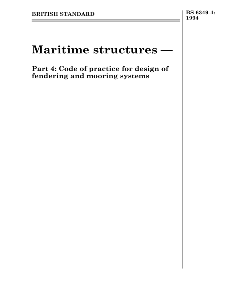 BRITISH STANDARD Maritime structures — Part 4: Code of practice for design of fendering and mooring systems BS 6349-4: 1994 BS 6349-4:1994 Committees responsible for this British Standard The preparation of this British Standard was entrusted by Technical Committee B/525, Building and civil engineering structures, to Subcommittee B/525/11, Maritime structures, upon which the following bodies were represented: Association of Consulting Engineers British Steel Industry Concrete Society Federation of Civil Engineering Contractors Health and Safety Executive Institution of Civil Engineers Institution of Structural Engineers Oil Companies International Marine Forum Permanent International Association of Navigation Congresses TBV Consult (formerly Department of the Environment, Property Services Agency) This British Standard, having been prepared under the direction of the Technical Sector Board for Building and Civil Engineering (B/-), was published under the authority of the Standards Board and comes into effect on 15 October 1994 © BSI 12-1998 First published March 1985 Second edition October 1994 The following BSI references relate to the work on this standard: Committee reference B/525/11 Draft for comment 92/10817 DC ISBN 0 580 22653 0 Amendments issued since publication Amd.No. Date Comments BS 6349-4:1994 Contents Committees responsible Foreword Page Inside front cover iv Section 1. General 1 Scope 2 Definitions 3 Symbols Section 2. Fendering 4 General principles 4.1 Provision of fendering 4.2 Principles of berthing 4.3 Overall design 4.4 Materials and workmanship 4.5 Vessel size 4.6 Berthing velocities 4.7 Berthing energies 4.8 Berthing reactions and load distribution 4.9 Factors of safety and design stresses 4.10 Mounting and suspension 4.11 Application of fender layout for berths 5 Types of fender 5.1 Fenders using elastomeric units 5.2 Pneumatic and foam-filled fenders 5.3 Flexible dolphins 5.4 Fender piles 5.5 Gravity fenders 5.6 Timber fenders 5.7 Mechanical fenders 5.8 Miscellaneous types 5.9 Advantages and disadvantages of fender types 5.10 Areas of applicability of fender types 6 Special considerations in the provision of fendering 6.1 Vessels with bulbous bows 6.2 Belting Section 3. Mooring 7 Principles of good mooring 8 Mooring patterns 8.1 General 8.2 Breast lines 8.3 Spring lines 8.4 Head and stern lines 9 Forces acting on the moored ship 9.1 General 9.2 Wind and currents 9.3 Off-quay hydrodynamic force and hydrodynamic interference from passing ships 9.4 Waves 9.5 Tidal rise and fall and change in draught or trim due to cargo operations © BSI 12-1998 1 1 1 2 2 2 2 4 4 4 4 7 8 11 11 17 17 17 24 25 25 25 26 26 26 29 29 29 29 31 31 31 31 32 34 34 34 34 34 34 34 i BS 6349-4:1994 9.6 10 10.1 10.2 11 11.1 11.2 11.3 11.4 11.5 11.6 11.7 11.8 Page 34 35 35 35 35 35 35 36 36 36 36 36 36 Ice Loads on mooring points Vessels up to 20 000 t displacement Vessels over 20 000 t displacement On-shore mooring equipment General Materials Mounting and fixing Bollards Quick release mooring hooks Mooring rings Capstans Safety precautions Annex A Gross registered tonnage, deadweight tonnage and displacement Annex B Selection of mooring lines on vessels Annex C Reference and bibliography 40 40 40 Figure 1 — Design berthing velocity as function of navigation conditions and size of vessel Figure 2 — Geometry of vessel approach to berth Figure 3 — Ferry and Ro-Ro vessel berthing Figure 4 — Hull and fender geometry at impact Figure 5 — Plan showing hull and cope geometry at impact Figure 6 — Plan showing angled fender units Figure 7 — Continuous fender facing Figure 8 — Fender layout on a continuous quay Figure 9 — Plan of single island berth Figure 10 — Plan of three-island berth Figure 11 — Plan of five-island berth Figure 12 — Lead-in jetty layout Figure 13 — Plan showing geometry of vessel with bulbous bow Figure 14 — Typical mooring patterns Figure 15 — Optimum angles of mooring lines for island tanker berth Figure 16 — Vessel under influence of stand-off force Figure 17 — Effect of tidal rise and fall and change in draught or trim Figure 18 — Quick release mooring hooks Figure 19 — Mooring rings 4 5 9 13 14 14 15 15 16 16 17 22 30 32 32 33 33 38 39 Table 1 — Typical categories of berth location Table 2 — Vessel categories Table 3 — Typical range of Cb Table 4 — Coefficients of friction of fender facing materials in dry conditions Table 5 — Elastomeric units: types and characteristics Table 6 — Pneumatic fenders: types and characteristics Table 7 — Mooring point loads for general cargo vessels and bulk carriers Table 8 — Mooring bollards Table 9 — Sizes of synthetic mooring ropes normally carried by vessels, and the breaking load of these ropes Table 10 — Sizes of galvanized steel wire ropes normally carried by vessels, and the breaking load of these ropes List of references ii 2 3 6 8 18 23 35 37 41 42 Inside back cover © BSI 12-1998 BS 6349-4:1994 Foreword This Part of BS 6349 has been prepared under the direction of the Technical Sector Board for Building and Civil Engineering (B/-) and supersedes BS 6349-4:1985 which is withdrawn. This edition introduces technical changes but it does not reflect a full review or revision of the standard, which will be undertaken in due course. Following suggestions from the Maritime and Waterways Board of the Institution of Civil Engineers, the Standards Committee for Civil Engineering Codes of Practice set up an ad hoc panel to make further studies. The panel’s report, presented in 1975, concluded that existing British codes were inadequate for the special aspects of maritime structures and that there was a need for such a code. A format was proposed that divided the work into two distinct stages. It has been assumed in the drafting of this British Standard that the execution of its provisions is entrusted to appropriately qualified and experienced people. The standard is issued in seven Parts