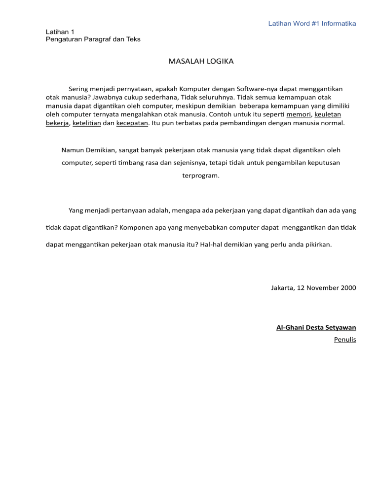 Latihan Word #1 Informatika Latihan 1 Pengaturan Paragraf dan Teks MASALAH LOGIKA Sering menjadi pernyataan, apakah Komputer dengan Software-nya dapat menggantikan otak manusia? Jawabnya cukup sederhana, Tidak seluruhnya. Tidak semua kemampuan otak manusia dapat digantikan oleh computer, meskipun demikian beberapa kemampuan yang dimiliki oleh computer ternyata mengalahkan otak manusia. Contoh untuk itu seperti memori, keuletan bekerja, ketelitian dan kecepatan. Itu pun terbatas pada pembandingan dengan manusia normal. Namun Demikian, sangat banyak pekerjaan otak manusia yang tidak dapat digantikan oleh computer, seperti timbang rasa dan sejenisnya, tetapi tidak untuk pengambilan keputusan terprogram. Yang menjadi pertanyaan adalah, mengapa ada pekerjaan yang dapat digantikah dan ada yang tidak dapat digantikan? Komponen apa yang menyebabkan computer dapat menggantikan dan tidak dapat menggantikan pekerjaan otak manusia itu? Hal-hal demikian yang perlu anda pikirkan. Jakarta, 12 November 2000 Al-Ghani Desta Setyawan Penulis Latihan Word #1 Informatika Latihan 1 Pengaturan Paragraf dan Teks Samarinda, 12 Juni 2003 Hal : Permohonan Kepada Yth. Bapak Kepala Dinas Pendidikan Nasional Provinsi Kalimantan Timur Jl. Basuki Rahmat di Samarinda Dengan hormat, Saya yang bertanda tangan di bawah ini : Nama : Al-Ghani Desta Setyawan, S.Pd Tempat dan Tanggal Lahir : Jakarta, 16 Agustus 1971 Jenis Kelamin : Laki-laki Status Perkawinan : Belum Kawin Alamat : Jl. Merah Delima No. 12 RT 15 Kelurahan Pasar Pagi Samarinda (0541) 735263 Pendidikan Terakhir : Sarjana Pendidikan (Bahasa Inggris) Universitas Pendidikan Indonesia Bandung Dengan ini mengajukan permohonan kepada Bapak, kiranya dapat diangkat menjadi tenaga Pengajar pada SMU di mana saja dalam wilayah Provinsi Kalimantan Timur. Sebagai pertimbangan Bapak, maka bersama ini saya lampirkan sebagai berikut: 1. 2. 3. 4. Daftar Riwayat Hidup Fotokopi ijazah terakhir Surat Keterangan Kelakuan Baik Pasfoto ukuran 3 x 4 cm (3 lembar) Demikian permohonan ini saya buat dengan sesungguhnya, dan atas pertimbangan Bapak, Saya ucapkan terimakasih. Latihan Word #1 Informatika Latihan 1 Pengaturan Paragraf dan Teks