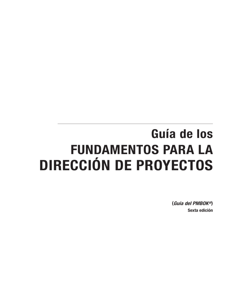 Guía de los FUNDAMENTOS PARA LA DIRECCIÓN DE PROYECTOS (Guía del PMBOK ®) Sexta edición Datos de Catalogación en Publicación de la Biblioteca del Congreso. Nombres: Project Management Institute, Inc., editor. Título: La guía de los fundamentos para la dirección de proyectos (Guía del PMBOK) / Project Management Institute. Otros títulos: Guía del PMBOK Descripción: Sexta edición. | Newtown Square, PA: Project Management Institute, 2017. | Serie: Guía del PMBOK | Incluye referencias bibliográficas y un índice. Identificadores: LCCN 2017032505 (print) | LCCN 2017035597 (ebook) | ISBN 9781628253900 (ePUP) | ISBN 9781628253917 (kindle) | ISBN 9781628253924 ( Web PDF) | ISBN 9781628251845 (paperback) Áreas temáticas: LCSH: Project management. | BISAC: BUSINESS & ECONOMICS / Project Management. Clasificación: LCC HD69.P75 (ebook) | LCC HD69.P75 G845 2017 (print) | DDC 658.4/04--dc23 Registro de LC disponible en https://lccn.loc.gov/2017032505 ISBN: 978-1-62825-194-4 Publicado por: Project Management Institute, Inc. 14 Campus Boulevard Newtown Square, Pennsylvania 19073-3299 EE.UU. Teléfono +1-610-356-4600 Fax: +1-610-356-4647 Correo electrónico: customercare@pmi.org Sitio web: www.PMI.org ©2017 Project Management Institute, Inc. Todos los derechos reservados. El contenido del Project Management Institute, Inc. sujeto a derechos de autor está protegido por la ley de propiedad intelectual de los EE.UU. reconocida por la mayoría de los países. Para republicar o remprimir el contenido del PMI, deberá primero obtener nuestro permiso. Visite http://www.pmi.org/permissions para obtener más detalles. Para colocar una orden comercial u obtener información sobre precios, póngase en contacto con Independent Publishers Group: Independent Publishers Group Order Department 814 North Franklin Street Chicago, IL 60610 EE.UU. Teléfono +1-610-888-4741 Fax: +1-610337-5985 Correo electrónico: orders@ipgbook.com (para órdenes solamente) Para cualquier otra solicitud, póngase en contacto con PMI Book Service Center. PMI Book Service Center P.O. Box 932683, Atlanta, GA 31193-2683 EE.UU. Teléfono 1-866-276-4764 (desde EE.UU. o Canadá) o +1-770-280-4129 (resto del mundo) Fax: +1-610-280-4113 Correo electrónico: info@bookorders.pmi.org Impreso en los Estados Unidos de América. Ninguna parte de esta obra puede ser reproducida o transmitida en forma alguna ni por ningún medio, ya sea éste electrónico, manual, fotocopia o grabación, ni por ningún sistema de almacenamiento y recuperación de información, sin permiso previo y por escrito del editor. El papel utilizado en este libro cumple con la norma Z 39.48 — 1984 (Permanent Paper Standard) publicada por NISO (National Information Standards Organization). PMI, el logotipo de PMI, PMBOK, OPM3, PMP, CAPM, PgMP, PfMP, PMI-RMP, PMI-SP, PMI-ACP, PMI-PBA, PROJECT MANAGEMENT JOURNAL, PM NETWORK, PMI TODAY, PULSE OF THE PROFESSION y el eslogan MAKING PROJECT MANAGEMENT INDISPENSABLE FOR BUSINESS RESULTS. son todas marcas registradas de Project Management Institute, Inc.Para obtener una lista completa de las marcas comerciales de PMI, póngase en contacto con el Departamento legal de PMI. Todas las otras marcas comerciales, marcas de servicio, nombres e imágenes comerciales, nombres de productos y logotipos que aparecen en el presente documento son propiedad de sus respectivos dueños. Quedan reservados todos los derechos que no estén expresamente cedidos en el presente documento. 10 9 8 7 6 5 4 3 2 1 AVISO Las publicaciones de normas y guías de Project Management Institute, Inc. (PMI), una de las cuales es el presente documento, se elaboran mediante un proceso de desarrollo de normas por consenso voluntario. Este proceso reúne a voluntarios y/o procura obtener las opiniones de personas que tienen interés en el tema objeto de esta publicación. Si bien PMI administra el proceso y establece reglas para promover la equidad en el desarrollo del consenso, PMI no redacta el documento y no prueba, evalúa, ni verifica de manera independiente la exactitud o integridad de ninguna información ni la solidez de ningún juicio contenidos en sus publicaciones de normas y guías. PMI no asume responsabilidad alguna por cualesquiera daños personales, a la propiedad u otros daños de cualquier naturaleza, ya sean especiales, indirectos, consecuentes o compensatorios, que resulten directa o indirectamente de la publicación, uso o dependencia de este documento. PMI no se hace responsable ni proporciona garantía alguna, expresa o implícita, con respecto a la exactitud o integridad de cualquier información publicada aquí, y no se hace responsable ni proporciona garantía alguna de que la información incluida en este documento satisfaga cualquiera de sus objetivos o necesidades particulares. PMI no se compromete a garantizar el desempeño de los productos o servicios de cualquier fabricante o vendedor individual en virtud de esta norma o guía. Al publicar y hacer disponible este documento PMI no se compromete a prestar servicios profesionales o de otro tipo para o en nombre de ninguna persona o entidad, ni asume ninguna obligación adquirida por una persona o entidad hacia otra. Cualquiera que use este documento lo hará bajo su propio criterio independiente o, según corresponda, buscará el consejo de un profesional competente a la hora de determinar las precauciones razonables a aplicar en cualesquiera circunstancias dadas. Tanto información como otras normas relativas al tema objeto de esta publicación pueden estar disponibles en otras fuentes, que el usuario podrá consultar para ampliar con opiniones e informaciones adicionales las ofrecidas por esta publicación. PMI no tiene el poder para, ni se compromete a vigilar o hacer cumplir el contenido de este documento. PMI no certifica, prueba ni inspecciona aspectos de seguridad y salud de productos, diseños o instalaciones. Cualquier certificación u otra declaración de conformidad co
