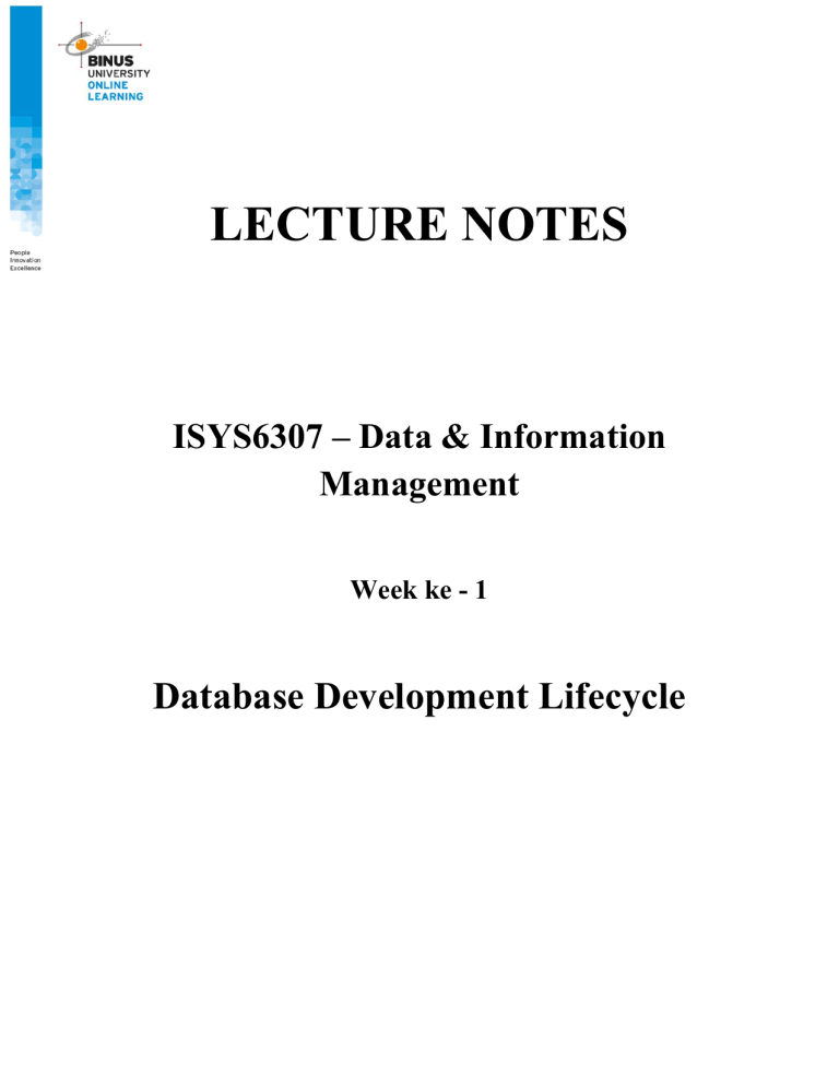 LECTURE NOTES ISYS6307 – Data & Information Management Week ke - 1 Database Development Lifecycle LEARNING OUTCOMES LO1: Sketch Database Development Life Cycle on Development Application OUTLINE MATERI : 1. Introduction 2. Database Development LifeCycle 3. Database Planning 4. Database Design 5. DBMS Selection 6. System Definition 7. Application Design 8. Prototyping 9. Implementation ISYS6307 – Data and Information Management ISI MATERI A. Introduction Perangkat lunak telah melampaui kemajuan perangkat lunak, salah satu indikatornya adalah banyaknya sistem yang telah terkomputerisasi. Mulai dari aplikasi sederhana hingga aplikasi yang kompleks. Supaya kinerja dari setiap aplikasi dapat terjaga, maka diperlukan adanya pemeliharaan sistem yang berkelanjutan. Pemeliharaan tersebut seperti mengkoreksi kesalahan, menerapkan role untuk user baru, update ke sistem yang baru. Pada sisi lainnya banyak pengembangan aplikasi yang terhambat karena proses migrasi ke sistem baru yang lambat, biaya operasional dan pemeliharaan yang tinggi serta kinerja sistem yang buruk. Sebagai solusinya diusulkan Software Development Life Cycle (SDLC) dan pada sisi database diusulkan Database Development Life Cycle (DSDLC). Basis data adalah bagian fundamental dari sistem informasi dan pengembangan serta penggunaannya harus dilihat dari perspektif persyaratan organisasi yang lebih luas. Biasanya, tahapan dalam siklus hidup sistem informasi meliputi: perencanaan, pengumpulan dan analisis persyaratan, desain, pembuatan prototipe, implementasi, pengujian, konversi, dan pemeliharaan operasional. Sehingga kita melihat fase-fase ini dari perspektif pengembangan sistem database. B. Database Development LifeCycle Tahapan siklus pengembangan sistem database ditunjukkan pada Gambar 1.1. Penting diketahui bahwa fase siklus pengembangan sistem database tidak sepenuhnya berurutan, tetapi melibatkan beberapa pengulangan fase sebelumnya melalui putaran umpan balik. Ringkasan dari kegiatan utama yang terkait dengan setiap fase dari siklus pengembangan sistem basis data dijelaskan pada Tabel 1.1. secara lebih rinci aktivitas utama yang terkait dengan setiap fase siklus pengembangan sistem database. ISYS6307 – Data and Information Management Gambar 1.1 Database Development Lifecycle (Connolly, 2015) ISYS6307 – Data and Information Management Tabel 1.1. Ringkasan kegiatan utama yang terkait dengan setiap fase siklus pengembangan sistem database (sumber: Connolly, 2015) Stage Main Activities Database planning merencanakan bagaimana tahapan siklus hidup dapat direalisasikan dengan paling efisien dan efektif. System definition Menentukan ruang lingkup dan batasan sistem database, termasuk tampilan pengguna utama, pengguna, dan area aplikasi. Requirements collection and mengumpulkan dan analisis persyaratan untuk sistem database baru. analysis Database design Mendesain konseptual, logis dan fisik dari database. DBMS selection Memilih DBMS yang cocok untuk sistem database. Application design Merancang antarmuka pengguna dan program aplikasi yang menggunakan dan mengolah database. Prototyping (optional) Membangun model kerja dari sistem database yang memungkinkan perancang atau pengguna untuk memvisualisasikan dan mengevaluasi bagaimana sistem akhir akan terlihat dan berfungsi. Implementation Membuat definisi database fisik dan program aplikasi. Data conversion and loading memuat data dari sistem lama ke sistem baru dan, jika memungkinkan, ubah aplikasi yang ada ke database baru. Testing Sistem database telah diuji kesalahannya dan divalidasi terhadap persyaratan yang ditentukan oleh pengguna. Operational maintenance Sistem database diimplementasikan sepenuhnya. Sistem terus dipantau dan dipelihara. Jika perlu, persyaratan baru dimasukkan ke dalam sistem database dengan tahapan siklus hidup sebelumnya. C. Database Planning Perencanaan database harus diintegrasikan dengan strategi SI organisasi secara keseluruhan. Ada tiga masalah utama yang terlibat dalam merumuskan strategi SI, yaitu: • identifikasi rencana dan tujuan bisnis dengan penentuan selanjutnya dari kebutuhan sistem informasi; • evaluasi sistem informasi saat ini untuk menentukan kekuatan dan kelemahan yang ada; • penilaian peluang TI yang dapat menghasilkan keunggulan kompetitif. ISYS6307 – Data and Information Management Langkah pertama yang penting dalam perencanaan database adalah mendefinisikan dengan jelas tujuan dari sistem database. Misi tersebut mendefinisikan tujuan utama dari sistem database. Mereka yang mengarahkan proyek database dalam organisasi (seperti direktur dan / atau pemilik) biasanya yang menentukan misi. Pernyataan misi membantu memperjelas tujuan sistem database dan memberikan jalur yang lebih jelas untuk membuat sistem database yang diperlukan secara efisien dan efektif. Setelah misi ditentukan, aktivitas selanjutnya termasuk mengidentifikasi tujuan misi. Setiap tujuan misi harus mengidentifikasi tugas tertentu yang harus didukung oleh sistem database. Asumsinya adalah jika sistem database mendukung tujuan misi, maka misi tersebut harus terpenuhi. Pernyataan misi dan tujuan dapat disertai dengan beberapa informasi tambahan yang merinci secara umum pekerjaan yang harus dilakukan, cara yang harus dilakukan, dan uang untuk mendanai semuanya. Perencanaan basis data juga harus mencakup pengembangan standar yang mengatur bagaimana data dikumpulkan, bagaimana format harus ditentukan, dokumentasi apa yang dibutuhkan dan bagaimana desain dan implementasi harus dilanjutkan. Standar bisa sangat memakan waktu untuk dikembangkan dan dipelihara, dan membutuhkan sumber daya untuk awalnya mengatur dan memeliharanya. Namun, seperangkat standar yang dirancang dengan baik memberikan dasar untuk pelatihan staf dan pengukuran kendali mutu, dan dapat memastikan bahwa pekerjaan berjalan sesuai dengan pola, terlepas dari keterampilan dan pengalaman staf. Misalnya, aturan tertentu dapat menentukan cara memberi nama item data di kamus data, yang pada gilirannya dapa