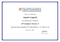 R This is to certify that Angela Coppola Has Satisfactorily Completed AP Computer Science A And has been awarded 32 Contact Hours / 3.2 CEUs’s on June 22nd, 2023 John Freeze- Director