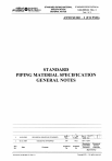 STANDARD PIPING MATERIAL SPECIFICATION GENERAL NOTES STANDARD SPECIFICATION No. 6-44-0005-A1 Rev. 3 Page 2 of 15 Abbreviations: PMS : Piping Material Specification Piping Standards Committee Convenor : Mr. Brahmanand Members : Mr. B. R. Bhatia Mr. P. K. Gupta Mr. R. Nanda Format No. 8-00-0001-F1 Rev. 0 Copyright EIL – All rights reserved STANDARD PIPING MATERIAL SPECIFICATION GENERAL NOTES STANDARD SPECIFICATION No. 6-44-0005-A1 Rev. 3 Page 3 of 15 CONTENTS Sl. No. Description Page No. 1.0 SCOPE 4 2.0 REFERRED CODES & STANDARDS 4 3.0 MATERIAL SPECIFICATIONS 4 4.0 CLASS DESIGNATION CODE 4 5.0 PIPES 5 6.0 FLANGES 5 7.0 FITTINGS 6 8.0 BENDS, MITRES & REDUCERS FABRICATED FROM PIPE 6 9.0 GASKETS 6 10.0 BOLTING 6 11.0 THREADS 7 12.0 VALVES 7 13.0 NDT SPECIFICATIONS 8 14.0 WELDING SPECIFICATIONS 8 15.0 CAUSTIC SODA SERVICE GRAPH 8 TABLE FOR MIDDLE NUMBER 9 TABLE FOR PRESSURE-TEMPERATURE RATING FOR BALL, PLUG AND BUTTERFLY VALVES 12 INSTRUCTIONS TO PROCESS USER 13 INSTRUCTION TO PIPING ENGINEERS FOR PREPARATION OF JOB SPECIFICATIONS 15 Format No. 8-00-0001-F1 Rev. 0 Copyright EIL – All rights reserved STANDARD PIPING MATERIAL SPECIFICATION GENERAL NOTES STANDARD SPECIFICATION No. 6-44-0005-A1 Rev. 3 Page 4 of 15 1.0 SCOPE 1.1 This specification (PMS) covers the various piping classes for Process and utility Piping. 1.2 Deviations from this specification may be necessary to conform to specific job requirements. 2.0 REFERRED CODES & STANDARDS 2.1 All Piping shall be designed in accordance with the Process Piping Code, ASME B31.3. A particular edition (indicated in Design Basis), once selected shall be followed throughout the job. 2.2 Editions and addenda (if any) of referred Codes and Standards shall be as per the Job Engineering Design Basis (Piping). 2.3 For the sake of brevity, the initials of the society to which the codes are referred to may be omitted in the specification. For example; B16.5 is a code referring to ASME; A106 is a standard referring to ASTM. 3.0 MATERIAL SPECIFICATIONS 3.1 Individual piping Class has been generally designed to cover a set of services operating within pressure-temp. combination as per ASME B16.5 / B16.34 or part of it. 3.2 The PMS shall be strictly adhered to in the design, requisitioning, purchasing, fabrication and testing of the piping system. However, deviations of material may occur due to design conditions and/or availability. All substitutions must be duly approved. 3.3 Unless mentioned otherwise, pipe thicknesses in the specs are for above ground piping. 4.0 CLASS DESIGNATION CODE The class designation shall consist of not more than three components made up of a letter, number & letter; e.g.B1A. 4.1 The first letter indicates pressure rating. A B C 150 Class 300 Class 400 Class D E F 600 Class 900 Class 1500 Class G J K 2500 Class 125/150 Class UNCLASSIFIED 4.2 The middle number indicates difference in the specifications within the same rating and material as enlisted in the Table attached. 4.3 The third letter indicates type of material. A B C D E F G H I J Carbon Carbon Moly. 1.0 % Cr., 0.5 % Moly. 1.25 % Cr., 0.5 % Moly. 2.25 % Cr., 1.0 % Moly. 5.0 % Cr., 0.5 % Moly. 9.0 % Cr., 1.0 % Moly. 3.5 % Ni. Nickel / Titanum Format No. 8-00-0001-F1 Rev. 0 Copyright EIL – All rights reserved STANDARD PIPING MATERIAL SPECIFICATION GENERAL NOTES K L M N P Q R S T U V W Y Z STANDARD SPECIFICATION No. 6-44-0005-A1 Rev. 3 Page 5 of 15 Stainless steel type 304, 304H, 304L. Aluminium Stabilised stainless steel type 316, 316H, 321, 347. 316L Monel / Alloy 20 Hastalloy / Inconel / Incoloy Lead PVC & FRP, PP / FRP, PVDF / FRP Cast Iron / Silicon Iron Duplex Stainless Steel Cupro-Nickel Lined steel (Rubber Lined, Teflon Lined etc). HDPE / PDVF / Teflon / PVC 5.0 PIPES 5.1 Pipe dimension shall be in accordance with ASME B36.10, IS:1239 & IS:3589 for wrought steel and wrought iron pipe; to B36.10 / B36.19 for stainless steel pipe and respective ASTM Standard for non-ferrous and non- metallic pipes. 5.2 Pipe made by acid-bessemer process shall not be acceptable, steel pipe shall be made by open hearth, electric furnace or basic Oxygen process. 5.3 All pipe threads shall conform to ASME B1.20.1 except where otherwise noted. 5.4 Pipe thicknesses not covered in different classes of this specification shall be calculated to meet specific job requirement based on actual max. design condition to economise on thickness. However, in such cases the thickness shall be calculated at not less than 80% of class rating unless defined otherwise in the Job Engineering Design Basis (Piping). 5.5 Maximum of 10% of Corrosion Allowance may be adjusted to optimize on pipe schedule. However, if CA is suffixed by 'minimum', this downward adjustment shall not be used. 5.6 Non-standard pipe sizes 1¼", 2½", 3½", 5" and 22" shall not be treated as a part of this specification unless these sizes are separately called out. 6.0 FLANGES 6.1 Flanges shall be in accordance with the following codes, except where otherwise noted: Upto 24" (150# -1500#) ASME B16.5 Upto 12" , 2500# ASME B16.5 Above 24" ASME B16.47 SERIES 'B' / AWWA / EIL' STD. Flanges to ASME B16.47 SERIES 'A' or any other standard (e.g. DIN, GOST, JIS etc.) may be specified to mate with equipment or valve flanges with the corresponding bolting. 6.2 Finish of steel flange faces shall be as follows: Stock Finish Serrated Finish / 125 AARH / Smooth finish 63 AARH Format No. 8-00-0001-F1 Rev. 0 : : 1000 µin AARH max. Serrations with 125-250µin AARH : 32 TO 63 µin AARH Copyright EIL – All rights reserved STANDARD PIPING MATERIAL SPECIFICATION GENERAL NOTES STANDARD SPECIFICATION No. 6-44-0005-A1 Rev. 3 Page 6 of 15 6.3 Brinnel hardness for RTJ groove shall be atleast 20 BHN more than that of corresponding gasket as specified. 6.4 Fig.8 Fl and SPCR & BLN shall be as per B16.48 upto 24" (150-1500#) & upto 12" for 2500#. For other sizes, refer EIL Std 7-44-0162. 7.0 FITTINGS 7.1 Forged steel SW and threaded fittings shall be in accorda