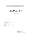 Service Manual TRITON Le 61 / 76 CONTENTS 1) Structural Diagram - - - - 2) Block Diagram - - - - - - - - 3) Circuit Diagram - - - - - - - 4) Diagnostics - - - - - - - - - - 5) Parts List - - - - - - - - - - - - - Revision: 1.00 Issued date: Nov.28.2001 Issued by: KORG INC. 6 1 5 2 3 8 19 7 9 4 13 10 11 12 Demensions : L= 1045.2mm W= 302.3mm H= 95.3mm Weight : 7.8Kg 15 14 16 17 18 NO PART CODE 1 620024600 2 620034600 3 646079200 4 620043900 5 646079100 6 641041651 7 630034200 8 620034700 9 646078900 10 646079000 11 646078700 12 420005800 13 646078800 14 500022500 15 641041649 16 641041653 17 641041652 18 641041650 19 641041648 PART NAME Q'TY X-952 POWER SW KNOB 1 X-631 SVR KNOB (GRAY) 1 X-0180 KNOB BLOCK B-2 1 KNOB P-423-9GF 4 X-0180 KNOB BLOCK B-1 1 X-0180 REAR OP COVER 1 X-0180 LCD WINDOW 1 X-610 ENCODER KNOB (GRAY) 1 X-0180 KNOB BLOCK A-1 1 X-0180 KNOB BLOCK A-2 1 X-0180 SIDE PLATE L 1 61TP/9S+PCBBOARD+AFTERTOUCH 1 X-0180 SIDE PLATE R 1 CASE LEG FF-004 5 X-0180 FRONT BAR 1 X-0180 SIMM COVER 1 X-0180 OP COVER 1 X-0180 BOOTOM COVER 1 X-0180 PANEL 1 6 1 2 5 3 7 8 4 19 9 13 10 11 12 15 14 16 17 Demensions : L=1257.6mm W= 302.3mm H= 95.3mm Weight : 9.2Kg 18 NO. 1 2 3 4 5 6 7 8 9 10 PART CODEPART NAME Q'TY NO. 620024600 X-952 POWER SW KNOB E40304-2 1 11 12 620034600 X-631 SVR KNOB(GRAY)E40239-6 1 13 646079200 X-0180 KNOB BLOCK B-2 E10191-2 1 14 620043900 KNOB P423-9GF(-0180) E40519-2 4 15 646079100 X-0180 KNOB BLOCK B-1 E10191-1 1 16 641041651 X-0180 REAR OP COVER KOC-C4122 1 17 630034200 X-0180 LCD WINDOW KOC-F40962 1 18 620034700 X-610 ENCODER KNOB(GRAY)E40466 1 19 646078900 X-0180 KNOB BLOCK A-1 E20211-1 1 646079000 X-0180 KNOB BLOCK A-2 E20211-2 1 PART CODE PART NAME Q'TY 646078700 X-0180 SIDE PLATE L KOC-E10189 1 420005900 76TP/9+PCBOARD+AFTERTOUCH 1 646080000 X-1120 SIDE PLATE R E10190-2 1 500022500 CASE LEG FF-004 5 641041661 X-1120 FRONT BAR KOC-C41228-2 1 641041653 X-0180 SIMM COVER KOC-C41227 1 641041652 X-0180 OP COVER KOC-C41226 1 641041659 X-1120 BOTTOM COVER KOC-C30565 1 641041660 X-1120 PANEL KOC-C30564 1 Triton Le How to start the test mode ENTER+5+POWER ON : FULL TEST ENTER+2+POWER ON : OMIT THE INERNAL TEST ENTER+3+POWER ON : SKIP THE SMART MEDIA (7,13) TEST ENTER+1+POWER ON : FULL TEST BUT SCSI TEST ENTER+4+POWERE ON : 12: SIMM 1/2 FULL TEST ENTER+6+POWER ON : EXB-SMPL TEST ENTER+7+POWER ON : EXB-SMPL TEST BUT SCSI TEST How to operate the test mode ENTER : PROCEED THE TEST VALUE▲ : ITEM UP VALUE▼ : ITEM DOWN FF : STEP UP REW : STEP DOWN NOTE: When the test mode starts, the calibration values of Joystick and Aftertouch are reset. When the test mode is proceeded in order, please take the calibration at each item. While operating the internal test, turning the Rotary encoder enables you to adjust the contrast of the LCD but the indication might not appear since the data update of the contrast cannot follow on time. So when adjusting the contrast, please do that after finishing the internal test. *Conditions when starting the test mode -Use a Toshiba made 16Mbyte Smart Media with sticking the write-protect sticker. NOTE: The Smart Media is supplied with many different brands but it originally manufactured by either Toshiba or Samsung. To identify Toshiba or Samson, please check the country of origin, which is shown as MADE IN JAPAN or KOREA. PART CODE 001186400 001227700 001227800 001233000 304020230 304020400 304050220 304050270 304060250 312053100 313005800 314001400 314010300 314028800 314030500 314030600 314030700 314031000 314032000 314032100 315000500 320003217 320004108 320004681 320012223 320012298 320012299 320040038 320040039 320040040 320040041 324001015 324001167 324003010 324003022 324003042 324007011 324007012 324009019 324011004 324017014 324021013 324021015 324021025 324021030 324021102 324021103 324021104 324021105 324021106 324021108 324021110 PART NAME PCB ASSY KLM-1864 PCB ASSY KLM-2277 LE61 PCB ASSY KLM-2278/9/80/1 LE61 PCB ASSY KLM-2330 LE61 (TS) TR 2SC3661-TA/TB(3K) TR 2SA1576A T106 (TS) DIGITAL TR DTC114ESA TP(TR) DIGITAL TR DTB113ZSTP(TR) FET CPH6302-TL(TS) LED NSPW510BS LCD MODULE NCM6602B (TS) DIODE RLS-73 TE-11 (TA) DIODE 1S2076TD (TR) LED SLZ-190B-09-T2 SCHOTTKY DIODE RB160L-40TE25 DIODE 1SR154-400TE25(TS) SCHOTTKY DIODE RB051L-40TE25 LED SLR-325VRT31(TR) LED SPR-325MVWT31(TR) ZENER DIODE RD6.8ES T1 AB1(TA DOUBLE DIODE MC-2840-T12-1(TS) (S) IC TMP87C847U-4458 IC HD74HC138P IC HD6437043AA21F (S) IC MB87F1710PFV-G-BND(S) MBM29F160BE-70FTN-K(X-0180L):S MBM29F160BE-70FTN-K(X-0180H):S IC MX23C6410MC-10 BK4-H (S) IC MX23C6410MC-10 BK4-L (S) IC MX23C6410MC-10 BK5-H (S) IC MX23C6410MC-10 BK5-L (S) (TS) IC UPC4570G2-E2 IC UPC78L05T-E2 (TS) (TS) IC TC7WU04F TE12L (TS) IC TC7S04FU (TE85L) (TS) IC TC7W04F (TE12L) IC BA09FP-E2 (TS) IC BA033LBSG-TR(TS) (TS) IC NJM2115M-TE2 (TS) IC M5216FP-600C IC RN5VD45AA-TR (TS) (TS) IC SN74LV74ANS-EL IC SN74LV08ANS-EL(TS) IC SN74AHCT240PWR(TS) IC SN74LV04ANSR (TS) IC SN74LV08APWR (TS) IC SN74LV32APWR (TS) IC SN74LV74APWR (TS) IC SN74LV245APWR (TS) IC SN74LV139APWR (TS) IC SN74LV138APWR (TS) IC SN74LV574APWR (TS) NOTE TRITON LE61 M. TRITON LE61 M. TRITON LE61 M. TRITON LE61 M. KLM-2277 TRITO KLM-2277 TRITO KLM-2278/79/80 KLM-2278/79/80 KLM-2277 TRITO KLM-2278/79/80 TRITON LE61 M. KLM-2277 TRITO KLM-2278/79/80 KLM-2278/79/80 KLM-2277 TRITO KLM-2277 TRITO KLM-2277 TRITO KLM-2278/79/80 KLM-2278/79/80 KLM-2278/79/80 KLM-2277 TRITO KLM-2330 TRITO KLM-2278/79/80 KLM-2277 TRITO KLM-2277 TRITO KLM-2277 TRITO KLM-2277 TRITO KLM-2277 TRITO KLM-2277 TRITO KLM-2277 TRITO KLM-2277 TRITO KLM-2277 TRITO KLM-2277 TRITO KLM-2277 TRITO KLM-2277 TRITO KLM-2277 TRITO KLM-2277 TRITO KLM-2277 TRITO KLM-1864 TRITO KLM-2277 TRITO KLM-2277 TRITO KLM-2277 TRITO KLM-2277 TRITO KLM-2277 TRITO KLM-2277 TRITO KLM-2277 TRITO KLM-2277 TRITO KLM-2277 TRITO KLM-2277 TRITO KLM-2277 TRITO KLM-2277 TRITO KLM-2277 TRITO Q'TY 1 1 1 1 10 1 8 8 1 1 1 1 8 4 1 1 1 20 1 1 5 1 2 1 1 1 1 1 1 1 1 4 1 1 1 1 1 1 1 1 1 1 1 1 1 3 2 1 1 2 1 1 PART CODE 324021114 324021119 3