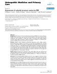 Osteopathic Medicine and Primary Care BioMed Central Open Access Research Assessment of calvarial structure motion by MRI William T Crow1, Hollis H King*2, Rita M Patterson2,3 and Vincent Giuliano4 Address: 1Florida Hospital East Orlando, 7975 Lake Underhill Road, Orlando, Florida 32822 USA, 2The Osteopathic Research Center, University of North Texas Health Science Center, 3500 Camp Bowie Boulevard, Fort Worth Texas 76107 USA, 3Department of Osteopathic Manipulative Medicine, University of North Texas Health Science Center, 3500 Camp Bowie Boulevard, Fort Worth, TX 76107 USA and 4NOVA Southeastern University College of Osteopathic Medicine, VinCon MRI Center, 5732 Canton Cove, Winter Springs, FL 32708, USA Email: William T Crow - Thomas.crow.do@flhosp.org; Hollis H King* - hking@hsc.unt.edu; Rita M Patterson - ripatter@hsc.unt.edu; Vincent Giuliano - giulianomd@att.net * Corresponding author Published: 4 September 2009 Osteopathic Medicine and Primary Care 2009, 3:8 doi:10.1186/1750-4732-3-8 Received: 19 January 2009 Accepted: 4 September 2009 This article is available from: http://www.om-pc.com/content/3/1/8 © 2009 Crow et al; licensee BioMed Central Ltd. This is an Open Access article distributed under the terms of the Creative Commons Attribution License (http://creativecommons.org/licenses/by/2.0), which permits unrestricted use, distribution, and reproduction in any medium, provided the original work is properly cited. Abstract Background: Practitioners of manual medicine/manual therapy (MM/MT) who utilize techniques thought to have some impact upon and move the solid structures of the human head have been criticized for lack of evidence of cranial bone motion. The present study utilized magnetic resonance imagery (MRI) technology to address the question of whether or not inherent (nonoperator initiated) calvarial structure motion can be assessed. Methods: Subjects: Twenty healthcare professionals, (physicians, nurses, medical students, pharmacists) between the ages of 24 and 52 were recruited. Seven females (ages 25-47, mean age 36.7) and 13 males (ages 25-53, mean age 31.2) volunteered. Technology: MRI scans were acquired at 450 ms per slice, in a 1.5 Tesla Signa Excite HD closed MRI system. The same scan prescription was repeated serially every 45 seconds to obtain eight serial slices for each subject. Image analysis was accomplished using ImageJ software (ImageJ 1.33 u National Institutes of Health, USA). Data from all eight images for each of the 20 subjects were analyzed to determine the two images with the largest differences in the parameters measured. Results: Difference values for the measures of area, width, height, major axis, and feret were statistically different whereas the measures for perimeter and minor axis were not. However, only the difference values for area were both statistically different (p < 0.003) and exceeded the resolution threshold of 0.898 mm/pixel. Discussion: The statistically significant difference value for area is suggestive of inherent motion in calvarial structures, and adds to the body of evidence supportive of biomechanically measurable calvarial structure motion in general. That the total intracranial area appeared to expand and recede was consistent with theory and prior studies suggestive of calvarial structure motion due to intracranial fluid volume changes. Conclusion: The use of MRI technology was able to demonstrate calvarial structure motion at a level exceeding the resolution threshold, and provides a means for further research on phenomena related to the cranial concept. It may be just a matter of time until increased resolution of MRI technology and image analysis provide the ability to examine more detailed areas of specific cranial bone motion. Page 1 of 6 (page number not for citation purposes) Osteopathic Medicine and Primary Care 2009, 3:8 Background Practitioners of manual medicine/manual therapy (MM/ MT) who utilize techniques thought to have some impact upon and move the solid structures of the human head have been criticized for the apparent lack of evidence for the capability of cranial structures to move, much less the mechanism of action for such possible motion. Research suggestive of cranial structure motion has been generated in the past decade by physiology and neuroscience researchers concerned with intracranial fluid dynamics [16]. National Aeronautics and Space Administration (NASA) supported research, along with research carried out by former Russian Cosmonaut program scientists [711] has increased the credibility and potential applicability of MM/MT as it relates to structures of the human head. Recent anatomic research suggested that calvarial sutures remain patent with the degree of patency dependent on the amount of muscular attachment on a particular calvarial bone and the activities of chewing and movement of the head upon vertebral column [12]. Studies on animal subjects have been conducted under conditions which allowed controlled calvarial bone motion production and observation. Adams et al [13] studied parietal bone mobility in adult cats. They used a multiplanar strain gauge to measure parietal bone motion in response to externally applied forces and to changes in intracranial pressure induced by artificial cerebrospinal fluid injected into the subarachnoid space. Measurable motion did occur, with the range being 17 to 70 microns. Lateral head compression induced sagittal suture closure and inward rotation of the parietal bones. Increased intracranial pressure induced a widening of sagittal suture and outward rotation of parietal bones, with the same effect produced by direct pressure on the sagittal suture. On squirrel monkeys, Michael and Retzlaff [14] performed direct measurement of right parietal bone motion using a screw attachment and a displacement transducer. With the primate's head immobilized in a stereotaxic frame, bone displacement, mean arterial blood pressure, and heart and respiration 
