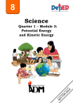 8 Science Quarter 1 – Module 3: Potential Energy and Kinetic Energy Science – Grade 8 Alternative Delivery Mode Quarter 1 – Module 3: Potential Energy and Kinetic Energy First Edition, 2020 Republic Act 8293, section 176 states that: No copyright shall subsist in any work of the Government of the Philippines. However, prior approval of the government agency or office wherein the work is created shall be necessary for exploitation of such work for profit. Such agency or office may, among other things, impose as a condition the payment of royalties. Borrowed materials (i.e., songs, stories, poems, pictures, photos, brand names, trademarks, etc.) included in this module are owned by their respective copyright holders. Every effort has been exerted to locate and seek permission to use these materials from their respective copyright owners. The publisher and authors do not represent nor claim ownership over them. Published by the Department of Education Secretary: Leonor Magtolis Briones Undersecretary: Diosdado M. San Antonio Development Team of the Module Writers: Cheri Madleen T. Samaco Editors: Nonita C. Patalinghug, Rhoda M. Delos Santos Reviewers: Bernabe L. Linog, Relyn D. Raza Illustrator: Rosa Mia L. Pontillo Layout Artist: Celeste Faith R. Almanon, Jay S. Ayap Management Team: Francis Cesar B. Bringas Isidro M. Biol, Jr. Maripaz F. Magno Josephine Chonie M. Obseñares Gregoria T. Su Marvilyn C. Francia Nonita C. Patalinghug Printed in the Philippines by ________________________ Department of Education – Caraga Region Office Address: Telefax: E-mail Address: Teacher Development Center J.P. Rosales Avenue, Butuan City, Philippines 8600 (085)342-8207/(085)342-5969 caraga@deped.gov.ph 8 Science Quarter 1 – Module 3: Potential Energy and Kinetic Energy Introductory Message For the facilitator: Welcome to the Science 8 Alternative Delivery Mode (ADM) Module on Potential Energy and Kinetic Energy! This module was collaboratively designed, developed and reviewed by educators both from public and private institutions to assist you, the teacher or facilitator in helping the learners meet the standards set by the K to 12 Curriculum while overcoming their personal, social, and economic constraints in schooling. This learning resource hopes to engage the learners into guided and independent learning activities at their own pace and time. Furthermore, this also aims to help learners acquire the needed 21st century skills while taking into consideration their needs and circumstances. In addition to the material in the main text, you will also see this box in the body of the module: Notes to the Teacher This contains helpful tips or strategies that will help you in guiding the learners. As a facilitator you are expected to orient the learners on how to use this module. You also need to keep track of the learners' progress while allowing them to manage their own learning. Furthermore, you are expected to encourage and assist the learners as they do the tasks included in the module. ii For the learner: Welcome to the Science 8 Alternative Delivery Mode (ADM) Module on Potential Energy and Kinetic Energy! The hand is one of the most symbolized parts of the human body. It is often used to depict skill, action and purpose. Through our hands we may learn, create and accomplish. Hence, the hand in this learning resource signifies that you as a learner is capable and empowered to successfully achieve the relevant competencies and skills at your own pace and time. Your academic success lies in your own hands! This module was designed to provide you with fun and meaningful opportunities for guided and independent learning at your own pace and time. You will be enabled to process the contents of the learning resource while being an active learner. This module has the following parts and corresponding icons: What I Need to Know This will give you an idea of the skills or competencies you are expected to learn in the module. What I Know This part includes an activity that aims to check what you already know about the lesson to take. If you get all the answers correct (100%), you may decide to skip this module. What’s In This is a brief drill or review to help you link the current lesson with the previous one. What’s New In this portion, the new lesson will be introduced to you in various ways such as a story, a song, a poem, a problem opener, an activity or a situation. What is It This section provides a brief discussion of the lesson. This aims to help you discover and understand new concepts and skills. What’s More This comprises activities for independent practice to solidify your understanding and skills of the topic. You may check the answers to the exercises using the Answer Key at the end of the module. iii What I Have Learned This includes questions or blank sentence/paragraph to be filled into process what you learned from the lesson. What I Can Do This section provides an activity which will help you transfer your new knowledge or skill into real life situations or concerns. Assessment This is a task which aims to evaluate your level of mastery in achieving the learning competency. Additional Activities In this portion, another activity will be given to you to enrich your knowledge or skill of the lesson learned. This also tends retention of learned concepts. Answer Key This contains answers to all activities in the module. At the end of this module you will also find: References This is a list of all sources used in developing this module. The following are some reminders in using this module: 1. Use the module with care. Do not put unnecessary mark/s on any part of the module. Use a separate sheet of paper in answering the exercises. 2. Don’t forget to answer What I Know before moving on to the other activities included in the module. 3. Read the instruction carefully before doing each task. 4. Observe honesty and integrity in doing the tasks and checking your answers. 5. Finish th