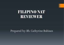 FILIPINO NAT REVIEWER Prepared by: Bb. Cathyrine Buhisan I. Piliin ang salitang kasingkahulugan ng salitang may salungguhit sa mga sumusunod na pangungusap. 1. Matapos ang maghapong gawain siya ay lugami na. A. Lubog B. Yumaman C. Nalungkot D. Lupaypay D – Ang lugami ay may kaugnay na diwa sa maghapong gawain na panglupaypay o pagod. 2. Hindi ko sukat akalain na siya pala ay isang balakyot. A. Marumi B. Makasalanan C. Mapanlinlang D. Mabaho C- Ang angkop na diwa sa salitang balakyot ay mapanlinlang na may konseptong diwa na hindi nagpapakita ng totoong pagkatao o ugali. 3. Ang damuho ay may asawa pala. A. Salbahe B. Kabiyak C. Tanga D. Di- mapagkakatiwalaan A – Ang salitang salbahe ay mas angkop na gamitin sa damuho dahil ito ay magkatulad ng diwa. 4. Ang magkaibigan ay magkaratig pook lamang. A. Kamasa B. Kabihasnan C. Kasing laki D. Kalapit D – Ang salitang karatig ay kasing diwa ng kalapit na nangangahulugan din ng katabing pook. 5. Ang abrigo na ibinigay sa may kaarawan ay makulay. A. Pamaypay C. Balabal B. Tela D. Banig C – Ang salitang abrigo ay kahulugan ng balabal na may makukulay na disenyo noong panahon ng Kastila. II. Piliin ang tamang salita na kasalungat ng salitang nakasalungguhit sa pahayag. 6. Masalimuot ang mga pangyayari sa pagkamatay ni Ramgen. A. Magulo B. Makulay C. Maalalahanin D. Mapayapa D – Kabaligtaran ng masalimuot o magulo ang mapayapa sa diwa ng pangyayaring naganap sa pagkamatay ni Ramgen. 7. Katunggali niya sa paligsahan ang kanyang matalik na kaibigan. A. Kasamahan B. Katalik C. Kakampi D. Kasulatan C – Kabaligtaran ng katunggali ang kakampi sa konsepto ng pakikipaglaban sa matalik na kaibigan. 8. Ang pamilya Yulo ay may mababang-loob sa mga taong nangangailangan. A. Maawain B. Mapagpala C. Matabil D. Mayabang D – Kabaligtaran ng mababang-loob ang mayabang na may diwa ng pagmamalaki sa mga taong nangangailangan. 9. Maalyaw na buhay ang ibibigay ko sa aking mga anak. A. Masarap B. Mahirap C. Masagana D. Mahigpit B – Kabaligtaran ng maalyaw ang mahirap sa buhay na may diwa ng kakulangan o kakapusan sa buhay. 10. Malabay na punungkahoy ang makikita sa bakuran ni Mang Baste. A. Mataba B. Malusog C. Payat D. Putol C – Kabaligtaran ng malabay ay payat na may kaugnay na diwang kanipisan ng sanga ng punungkahoy. III. Piliin ang tamang sagot sa bawat tanong. 11. Nagbasa ______ maayos ang mag-aaral. A. siya B. nang C. ng D. sila B – Ginagamit ang nang kapag sinusundan ng pang-abay. 12. ______iinumin ka bang gamot? A. Mayroon B. Meron C. May D. Nang C – Ang may ay ginagamit kapag sinusundan ng pandiwa. 13. Ang mga regalong natira ay ______ Ayeng, Miguel at Joffrey. A. para sa atin B. para sa kanila C. para sa iyo D. para kina D – Ang kay at kina kapag sinasamahan ng para ay nagiging panandang kaalaman sa tao. 14. Anong uri ng tayutay ito? Dumadagundong ang tunog ng loud speaker sa mahinang dibdib ng matanda. A. Onomatopeya o paghihimig C. Alliteration o pag-uulit B. Apostrophe o pagtawag D. Antithesis o pagtatambis A – Ang dumadagundong ay paghihimig na nailalahad sa tulong ng tunog o himig ng salita. 15. Ang mukha niya’y animo’y maamong tupa na sunudsunuran. A. Metaphor o pagwawangis B. Simile o pagtutulad C. Metonomi o pagpapalit-tawag D. Epigram o pagsalungat B – Ito ay payak na pagpapahayag na ginagamitan ng pagtutulad na gaya ng animo’y. 16. Ang paalala ay gamot sa taong nakalilimot. A. Simile o pagtutulad B. Personification o Pagtatao C. Hyperbole o pagmamalabis D. Metaphor o pagwawangis D – Naghahambing ito subalit gumamit din ng tuwirang pagtutulad sa salitang gamot. 17. Sumisipol ang hanging amihan. A. B. C. D. Hyperbole o pagmamalabis Irony o pag-uyam Metonymy o pagpapalit-tawag Personification o pagsasatao D – Nagbibigay katauhan ang salitang pagsipol sa hanging amihan. 18. Alin ang kasingkahulugan ng pariralang nagbibilang ng poste? A. B. C. D. mahusay magbilang mahusay magtrabaho walang poste walang trabaho D – Matalinhagang salita ito na may kahulugang walang trabaho kung ikaw ay nagbibilang ng poste. 19. Alin ang kasingkahulugan ng pariralang buwaya sa katihan? A. mapang-api B. mapang-imbot C. mapanukso D. mapagmalabis B – Ang buwaya ay talinghagang naglalarawan sa taong mapag-imbot o sakim. 20. Ano ang pokus ng pandiwa sa pangungusap na ito? IPANSULAT MO ANG LAPIS NA MAY TASA. A. tagaganap B. tagatanggap C. sanhi D. gamit D – Ang ipansulat ay nasa pokus ng gamit na lapis. 21. Ang alpabeto ng ating mga ninuno noong panahong pre-kolonyal ay tinatawag na A. alibata B. alibaba C. talibaba D. abakada A – Tinatawag na alibata ang sinaunang alpabeto ng ating mga ninuno 22. Ayon sa Bagong Saligang Batas (1987), ang Wikang Pambansa ng Pilipinas ay tatawaging A. Pilifino B. Filipino C. Pilipino D. Filifino B – Ang salitang Filipino ay opisyal na wikang pambansa ayon sa 1987 Konstitusyon ng Pilipinas. 23. Kapag tayo ay nabigo, bumangon tayo agad. Sakaling dumating ang daluyong, sandali siyang iiwas. A. Payak B. Tambalan C. Hugnayan D. Langkapan C – Ito ay may 2 sugnay na di makapag-iisa at isang sugnay na makapag-iisa. 24. Ang mga mag-aaral ng Nolasco High School ay nagsayawan at nag-aawitan. A. Payak B. Tambalan C. Hugnayan d. Langkapan A – Ang pangungusap ay may isang sugnay na makapag-iisa. 25. Ang kasiphayuan-kaligayahan ay isang halimbawa ng______________. A. pagkakatulad B. pagsasalungatan C. pagbibigay ng katangian D. pagbubuo B – Magkabaligtad ito ng kahulugan. 26. Ano ang nagaganap na pagbabagong morpoponemiko sa salitang may salungguhit? Nasa mesa ang mga kagamitan sa panlinis. A. pagkaltas B. asimilasyon C. metatesis D. reduplikasyon B – Ang salitang panlinis ay may panlaping pan na sinusundan ng katinig na l na nag-aasimila sa tunog na N. 27. Marumi ang kamay niya nang kumain. A. pagpapalit ng ponema C. paglilipat diin B. metatesis D. reduplikasyon A – Ang ponemang r sa salitang marumi ay malayang nagpapalitan sa letrang d na hindi nagbabago ang kahulugan. (Madumi-marumi) 28. Asnan mo ang bini