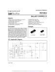 Data Sheet No. PD60182-G IR2156(S) BALLAST CONTROL IC Features • Ballast control and half-bridge driver in one IC • Programmable preheat frequency • Programmable preheat time • Internal ignition ramp • Programmable over-current threshold • Programmable run frequency • Programmable dead time • DC bus under-voltage reset • Shutdown pin with hysteresis • Internal 15.6V zener clamp diode on Vcc • Micropower startup (150µA) • Latch immunity and ESD protection Description Packages The IR2156 incorporates a high voltage half-bridge gate driver with a programmable oscillator and state diagram to form a complete ballast control IC. The IR2156 features include programmable preheat and run frequencies, programmable preheat time, programmable dead-time, and programmable over-current protection. Comprehensive protection features such as protection from failure of a lamp to strike,filament failures, as well as an automatic restart function, have been included in the design. The IR2156 is available in both 14 lead PDIP and 14 lead SOIC packages. 14 Lead SOIC (narrow body) 14 Lead PDIP CFL Application Diagram R BUS D RECT1 R SUPPLY L L FILTE R F1 D BOOT NC 1 14 VCC 3 RT 4 RPH RT 5 RPH 13 IR2156 2 VDC CVCC2 CVCC1 HO C FILTE R M1 LRES VS N LO C BOOT 11 10 CT M2 CCP CS R1 SD 6 9 7 8 COM C CPH C ELCAP1 D CP2 12 CPH CT C VDC VB C SNUB CRES C ELCAP1 CCS RCS D CP1 D RECT2 www.irf.com This datasheet has been downloaded from http://www.digchip.com at this page 1 IR2156(S) Absolute Maximum Ratings Absolute maximum ratings indicate sustained limits beyond which damage to the device may occur. All voltage parameters are absolute voltages referenced to COM, all currents are defined positive into any lead. The thermal resistance and power dissipation ratings are measured under board mounted and still air conditions. Symbol Min. Max. VB High side floating supply voltage -0.3 625 VS High side floating supply offset voltage VB - 25 VB + 0.3 VHO High side floating output voltage VS - 0.3 VB + 0.3 VLO Units V Low side output voltage -0.3 VCC + 0.3 IOMAX Maximum allowable output current (HO, LO) due to external power transistor miller effect -500 500 VVDC VDC pin voltage -0.3 VCC + 0.3 VCT CT pin voltage ICPH CPH pin current -5 5 IRPH RPH pin current -5 5 VRPH RPH pin voltage mA -0.3 V VCC + 0.3 mA -0.3 VCC + 0.3 V IRT RT pin current -5 5 mA VRT RT pin voltage -0.3 VCC + 0.3 VCS Current sense pin voltage -0.3 5.5 ICS Current sense pin current -5 5 ISD Shutdown pin current -5 5 ICC Supply current (note 1) -20 20 dV/dt PD RthJA Allowable offset voltage slew rate -50 50 Package power dissipation @ TA ≤ +25°C (14 pin PDIP) — 1.70 PD = (TJMAX-TA)/RthJA (14 pin SOIC) — 1.00 Thermal resistance, junction to ambient (14 pin PDIP) — 70 (14 pin SOIC) — 120 TJ Junction temperature -55 150 TS Storage temperature -55 150 TL Lead temperature (soldering, 10 seconds) — 300 Note 1: 2 Definition V mA V/ns W o C/W o C This IC contains a zener clamp structure between the chip VCC and COM which has a nominal breakdown voltage of 15.6V. Please note that this supply pin should not be driven by a DC, low impedance power source greater than the VCLAMP specified in the Electrical Characteristics section. www.irf.com IR2156(S) Recommended Operating Conditions For proper operation the device should be used within the recommended conditions. Symbol Definition Min. Max. VCC - 0.7 VCLAMP Minimum required VBS voltage for proper HO functionality 5 VCC VS Steady state high side floating supply offset voltage -1 600 VCC Supply voltage VCCUV+ VCLAMP ICC Supply current note 2 10 mA CT CT lead capacitance — pF ISD Shutdown lead current 220 -1 ICS Current sense lead current -1 1 TJ Junction temperature -40 125 ISDLK SD pin leakage current (@VSD=6V) — 125 ICSLK CS pin leakage current (@VCS=3V) — 25 High side floating supply voltage V Bs VBSMIN Note 2: 1 Units V mA o C µA Enough current should be supplied into the VCC lead to keep the internal 15.6V zener clamp diode on this lead regulating its voltage, VCLAMP. Electrical Characteristics VCC = VBS = VBIAS = 14V +/- 0.25V, VVDC = Open, RT = 39.0kΩ, RPH = 100.0kΩ, CT = 470 pF, VCPH = 0.0V, VCS = 0.0V, VSD = 0.0V, CLO, HO = 1000pF, TA = 25oC unless otherwise specified. Symbol Definition Min. Typ. Max. 10.5 11.5 12.5 9.5 10.5 Units Test Conditions Supply Characteristics VCCUV+ VCC supply undervoltage positive going threshold VCCUV- VCC supply undervoltage negative going threshold VCC supply undervoltage lockout hysteresis UVLO mode quiescent current Fault-mode quiescent current 1.5 50 — 2.0 120 200 3.0 200 330 IQCC Quiescent VCC supply current — 1.0 1.5 IQCC50K VCC supply current, f = 50kHz — 1.0 1.5 VCLAMP VCC zener clamp voltage 14.5 15.6 16.5 -5 — — 0 30 — VUVHYS IQCCUV IQCCFLT 8.5 VCC rising from 0V V µA mA V VCC falling from 14V VCC = 11V SD = 5.1V, or CS > 1.3V CT connected toCOM VCC =14V,RT=15kΩ RT = 15kΩ CT = 470 pF ICC = 5mA Floating Supply Characteristics IQBS0 IQBS1 ILK Quiescent VBS supply current Quiescent VBS supply current Offset supply leakage current www.irf.com 5 50 50 µA µA VHO = VS (CT = 0V) VHO = VB (CT = 14V) VB = VS = 600V 3 IR2156(S) Electrical Characteristics VCC = VBS = VBIAS = 14V +/- 0.25V, VVDC = Open, RT = 39.0kΩ, RPH = 100.0kΩ, CT = 470 pF, VCPH = 0.0V, VCS = 0.0V, VSD = 0.0V, CLO, HO = 1000pF, TA = 25oC unless otherwise specified. Symbol Definition Min. Typ. Max. Units Test Conditions 28 30 32 kHz RT=33.0kΩ, VVDC= 5V VCPH = Open Oscillator, Ballast Control, I/O Characteristics f osc Oscillator frequency d VCT+ VCTVCTFLT Oscillator duty cycle Upper CT ramp voltage threshold Lower CT ramp voltage threshold Fault-mode CT pin voltage — — — — 50 8.3 4.8 0 — — — — mV tDLO tDHO RDT LO output deadtime HO output deadtime Internal deadtime resistor — — — 2.0 2.0 3 — — — usec usec KΩ % V VCC = 14V SD > 5.1V or CS >1.3V only CT CAP should beconnected to CT Preheat Characteristics 5 µA — mV SD > 5.1V o