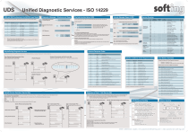 UDS Unified Diagnostic Services - ISO 14229 Diagnostic Messages - Structures and Types The Sub-Function Byte of UDS Periodic Message Types of UDS International Standard Organization‘s Open System Interconnect 7 Layer Communication Model Request without Sub-Function or Positive Response Services without Sub-Function-Byte: $14, $23, $24, $2A, $2E, $2F, $34, $35, $36, $37, $3D, $84 Responses in a CAN data field according to ISO 15765-3 Layer “8” 7 Standards for UDS Standards for OBD Diagnostic Application User ISO 15031-5 Application Layer ISO 14229-1 ISO 15765-3 ISO 15031-5 Requests with Sub-Function Byte 6 Presentation Layer Not applicable Not applicable 5 Session Layer ISO 15765-3 Not applicable 4 Transport layer ISO 15765-2 Not applicable 3 Network Layer ISO 15765-2 ISO 15765-4 2 Data Link Layer ISO 11898-1 ISO 15765-4 Physical Layer ISO 11898-2* ISO 11898-3 1 *) Description Service Identfier Data Parameter Suppress Positive Response Message Indication Bit Service Identfier Sub-Function Byte Bit 7 Data Parameter UUDT-Responses ISO 15765-4 Negative Responses Request Service Identifier Sub-Function (Bit 5 to 0) Services with Sub-Function Byte: $10, $11, $19, $27, $28, $2C, $31, $3E, $83, $85, $87 Services with Sub-Function Byte and Storage State Parameter : $86 Type 1 Type 2 Bit 6 to 0: sub-function parameter value The Bits 0 to 6 contain the value for a Sub-Function parameter for diagnostic services The bus physics used is to be selected by the user Therefore, several standards for different physical layer for e.g. High-Speed- (ISO 11898-2) or Fault-Tolerant-CAN (ISO 11898-3) can be used Periodic Data Identfier Periodic Data Identfier PCI Remark: A service, which uses the suppressPosRspMsgIndicationBit only, shall set the value of the Sub-Function parameter to 0 to support the sending of the bit 7 The Bits 0 to 6 are meaningless then Type 1 Type 2 Response Service Identfier Periodic Data Identfier $27 Diagnostic and Communication Management Three Potential Polling Communication Flows when using the Sub-Function Byte 1. Positive Response Suppression requested (Bit 7 of Byte 2 is set to “1”, but response is sent by the ECU $10 1. Positive Response Request $83 Bit 7 Bit 6 Bit 5 Bit 4 Bit 3 Bit 2 Bit 1 Bit 0 Bit 7 Bit 6 Bit 5 Bit 4 Bit 3 Bit 2 Bit 1 Bit 0 Data Transmission 0 0 0 1 0 0 0 0 1 0 0 0 0 0 1 1 Request 2. Negative Response Negative Response $2C Type 1: with Response Service Identifier Type 2: without Response Service Identifier $3D $2E Stored Data Transmission The type is respected by the Service $2A Read Data by Periodic Identifier 3. Response suppressed Upload Download Mnemonic Description 10 GR General reject 11 SNS Service not supported 12 SFNS Sub-Function not supported 13 IMLOIF 14 RTL Response too long 21 BRR 22 24 Hex Mnemonic Description Busy repeat request 81 RPMTH rpm too high CNC Conditions not correct 82 RPMTL rpm too low RSE Request sequence error 83 EIR No response from sub-net component 84 EINR Failure prevents execution of requested action 85 ERTTL Request out of range 86 TEMPTH Temperature too high Security access denied 87 TEMPTL Temperature too low Invalid key 88 VSTH Vehicle speed too high SAD No Suppression requested, response correctly sent by ECU 35 IK 36 ENOA Exceeded number of attempts 89 VSTL Vehicle speed too low 2. Negative Response 37 RTDNE Required time delay not expired 8A TPTH Throttle/Pedal too high 38-4F RBEDLSD Reserved by Extended Data Link Security Document 8B TPTL Throttle/Pedal too low 70 UDNA Upload/Download not accepted 8C TRNIN Transmission range not in neutral 71 TDS Transfer data suspended 8D TRNIG Transmission range not in gear 72 GPF General programming failure 8F BSNC Brake switch(es) not closed 73 WBSC Wrong Block Sequence Counter 90 SLNIP Shifter lever not in park 78 RCRRP Request correctly received, but response is pending 91 TCCL Torque converter clutch locked 7E SFNSIAS Sub-Function not supported in active session 92 VTH Voltage too high 7F SNSIAS Service not supported in active session 93 VTL Voltage too low 7F, 10, 12 Periodic Service Execution (Service $2A) Response on Event – RoE (Service $86) For one Request follows one initial Response. After that, periodically more responses will follow. The sending can be stopped by using a simple diagnostic service Service parameter "Transmission Mode" The frequency of the data transmission can be configured using the the Transmission Mode. The UDS-Standard defines abstract values as: Slow = $01 Medium = $02 Fast = $03 Stop sending = $04 The real values in Hertz for each frequency need to be defined between OEM and ECU supplier For one or two setup and start Requests one or two initial Responses are given, followed by 0 to n event-driven Responses depending on the number of occurrences of tracked events. The distance between several events is non-deterministic. • The RoE mechanism can be activated in any Session, including the Default-Session • It does not need Tester Present messages to stay active Generic Periodic Communication Flow Generic Event-Driven Communication Flow Type 1 Communication Flow Type 2 Communication Flow NO Response Service-ID is sent by the ECU A Response Service-ID is sent by the ECU 1. Setup Periodic Transmission for two Measurements ($0C, $0D) Request 2A, 03, 0C, 0D 6A Positive Response 2. Getting Periodic Responses 6A, 0D, 82 2. Getting periodic Measurements Positive Response 0D, 82 ∆ trate Request Positive Response 3. Stop Transmission of Measurement $0C only 2A, 04, 0C 2nd Step 86, 05, 06 C6, 05, 00, 06 t2 59, 0F, 01, 00, 01 3rd Step C6, 01, 01, 06, 01, 19, 01, 01 4th Step ∆ tEvent Final Response t3 0C, 0A, F0 6A, 0D, 82 3. Stop Transmission t1 1st Step 0C, 0A, F0 6A, 0C, 0A, F0 Positive Response C6, 01, 00, 06, 01, 19, 01, 01 Positive Response Event Driven Response 6A, 0C, 0A, F0 t0 Start Event-Logic Request 2A, 03, 0C, 0D 6A Initial Positive Response 86, 01, 06, 01, 19, 01, 01 Setup Event-Logic Request Initial Positive Response 1. Setup P