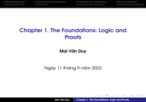 Propositional Logic Propositional Equivalences Predicates and Quantifiers Rules of Inference Chapter 1. The Foundations: Logic and Proofs Mai Văn Duy Ngày 11 tháng 9 năm 2022 Mai Văn Duy Chapter 1. The Foundations: Logic and Proofs Propositional Logic Propositional Equivalences Predicates and Quantifiers Rules of Inference Contents 1. Propositional Logic Mai Văn Duy Chapter 1. The Foundations: Logic and Proofs Propositional Logic Propositional Equivalences Predicates and Quantifiers Rules of Inference Contents 1. Propositional Logic 2. Propositional Equivalences Mai Văn Duy Chapter 1. The Foundations: Logic and Proofs Propositional Logic Propositional Equivalences Predicates and Quantifiers Rules of Inference Contents 1. Propositional Logic 2. Propositional Equivalences 3. Predicates and Quantifiers Mai Văn Duy Chapter 1. The Foundations: Logic and Proofs Propositional Logic Propositional Equivalences Predicates and Quantifiers Rules of Inference Contents 1. Propositional Logic 2. Propositional Equivalences 3. Predicates and Quantifiers 4. Rules of Inference Mai Văn Duy Chapter 1. The Foundations: Logic and Proofs Propositional Logic Propositional Equivalences Predicates and Quantifiers Rules of Inference Definition Proposition (mệnh đề) is a declarative sentence that is either true or false but not both. Mai Văn Duy Chapter 1. The Foundations: Logic and Proofs Propositional Logic Propositional Equivalences Predicates and Quantifiers Rules of Inference Definition Proposition (mệnh đề) is a declarative sentence that is either true or false but not both. 1. Hà Nội is the capital of Việt Nam. Mai Văn Duy Chapter 1. The Foundations: Logic and Proofs Propositional Logic Propositional Equivalences Predicates and Quantifiers Rules of Inference Definition Proposition (mệnh đề) is a declarative sentence that is either true or false but not both. 1. Hà Nội is the capital of Việt Nam. 2. Biden is not the president of USA. Mai Văn Duy Chapter 1. The Foundations: Logic and Proofs Propositional Logic Propositional Equivalences Predicates and Quantifiers Rules of Inference Definition Proposition (mệnh đề) is a declarative sentence that is either true or false but not both. 1. Hà Nội is the capital of Việt Nam. 2. Biden is not the president of USA. 3. It is going to rain! Mai Văn Duy Chapter 1. The Foundations: Logic and Proofs Propositional Logic Propositional Equivalences Predicates and Quantifiers Rules of Inference Definition Proposition (mệnh đề) is a declarative sentence that is either true or false but not both. 1. Hà Nội is the capital of Việt Nam. 2. Biden is not the president of USA. 3. It is going to rain! 4. What time is it? Mai Văn Duy Chapter 1. The Foundations: Logic and Proofs Propositional Logic Propositional Equivalences Predicates and Quantifiers Rules of Inference Truth table A proposition can be true (True/T/1) or false (False/F/0). a. Hà Nội is the capital of Việt Nam. Mai Văn Duy Chapter 1. The Foundations: Logic and Proofs Propositional Logic Propositional Equivalences Predicates and Quantifiers Rules of Inference Truth table A proposition can be true (True/T/1) or false (False/F/0). a. Hà Nội is the capital of Việt Nam. b. Biden is not the president of USA. Mai Văn Duy Chapter 1. The Foundations: Logic and Proofs Propositional Logic Propositional Equivalences Predicates and Quantifiers Rules of Inference Negation (phủ định) Negation of proposition p is the statement “ It is not case that p”. Notation: ¬ p( or p) Mai Văn Duy Chapter 1. The Foundations: Logic and Proofs Propositional Logic Propositional Equivalences Predicates and Quantifiers Rules of Inference Negation (phủ định) Negation of proposition p is the statement “ It is not case that p”. Notation: ¬ p( or p) Mai Văn Duy Chapter 1. The Foundations: Logic and Proofs Propositional Logic Propositional Equivalences Predicates and Quantifiers Rules of Inference Conjunction (hội) Conjunction of propositions p and q is the proposition “ p and q” and denoted by p ∧ q Mai Văn Duy Chapter 1. The Foundations: Logic and Proofs Propositional Logic Propositional Equivalences Predicates and Quantifiers Rules of Inference Conjunction (hội) Conjunction of propositions p and q is the proposition “ p and q” and denoted by p ∧ q Mai Văn Duy Chapter 1. The Foundations: Logic and Proofs Propositional Logic Propositional Equivalences Predicates and Quantifiers Rules of Inference Disjunction (tuyển) Disjunction of propositions p and q is the proposition “ p or q” and denoted by p ∨ q Mai Văn Duy Chapter 1. The Foundations: Logic and Proofs Propositional Logic Propositional Equivalences Predicates and Quantifiers Rules of Inference Disjunction (tuyển) Disjunction of propositions p and q is the proposition “ p or q” and denoted by p ∨ q Mai Văn Duy Chapter 1. The Foundations: Logic and Proofs Propositional Logic Propositional Equivalences Predicates and Quantifiers Rules of Inference Exclusive-or(xor)(tuyển loại) Exclusive-or (xor) of propositions p and q, denoted by p⊕q Mai Văn Duy Chapter 1. The Foundations: Logic and Proofs Propositional Logic Propositional Equivalences Predicates and Quantifiers Rules of Inference Exclusive-or(xor)(tuyển loại) Exclusive-or (xor) of propositions p and q, denoted by p⊕q Mai Văn Duy Chapter 1. The Foundations: Logic and Proofs Propositional Logic Propositional Equivalences Predicates and Quantifiers Rules of Inference Implication (kéo theo) Implication: p → q (p implies q) Mai Văn Duy Chapter 1. The Foundations: Logic and Proofs Propositional Logic Propositional Equivalences Predicates and Quantifiers Rules of Inference Implication (kéo theo) Implication: p → q (p implies q) Mai Văn Duy Chapter 1. The Foundations: Logic and Proofs Propositional Logic Propositional Equivalences Predicates and Quantifiers Rules of Inference Implication (kéo theo) p → q can be exp