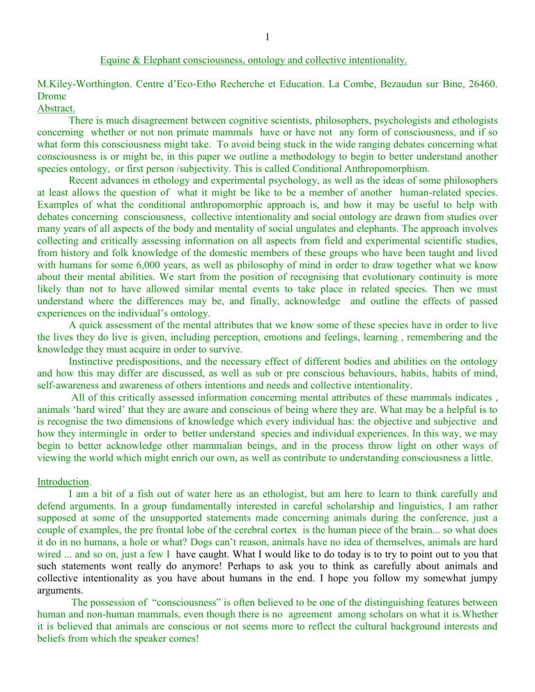 1 Equine & Elephant consciousness, ontology and collective intentionality. M.Kiley-Worthington. Centre d’Eco-Etho Recherche et Education. La Combe, Bezaudun sur Bine, 26460. Drome Abstract. There is much disagreement between cognitive scientists, philosophers, psychologists and ethologists concerning whether or not non primate mammals have or have not any form of consciousness, and if so what form this consciousness might take. To avoid being stuck in the wide ranging debates concerning what consciousness is or might be, in this paper we outline a methodology to begin to better understand another species ontology, or first person /subjectivity. This is called Conditional Anthropomorphism. Recent advances in ethology and experimental psychology, as well as the ideas of some philosophers at least allows the question of what it might be like to be a member of another human-related species. Examples of what the conditional anthropomorphic approach is, and how it may be useful to help with debates concerning consciousness, collective intentionality and social ontology are drawn from studies over many years of all aspects of the body and mentality of social ungulates and elephants. The approach involves collecting and critically assessing information on all aspects from field and experimental scientific studies, from history and folk knowledge of the domestic members of these groups who have been taught and lived with humans for some 6,000 years, as well as philosophy of mind in order to draw together what we know about their mental abilities. We start from the position of recognising that evolutionary continuity is more likely than not to have allowed similar mental events to take place in related species. Then we must understand where the differences may be, and finally, acknowledge and outline the effects of passed experiences on the individual’s ontology. A quick assessment of the mental attributes that we know some of these species have in order to live the lives they do live is given, including perception, emotions and feelings, learning , remembering and the knowledge they must acquire in order to survive. Instinctive predispositions, and the necessary effect of different bodies and abilities on the ontology and how this may differ are discussed, as well as sub or pre conscious behaviours, habits, habits of mind, self-awareness and awareness of others intentions and needs and collective intentionality. All of this critically assessed information concerning mental attributes of these mammals indicates , animals ‘hard wired’ that they are aware and conscious of being where they are. What may be a helpful is to is recognise the two dimensions of knowledge which every individual has: the objective and subjective and how they intermingle in order to better understand species and individual experiences. In this way, we may begin to better acknowledge other mammalian beings, and in the process throw light on other ways of viewing the world which might enrich our own, as well as contribute to understanding consciousness a little. Introduction. I am a bit of a fish out of water here as an ethologist, but am here to learn to think carefully and defend arguments. In a group fundamentally interested in careful scholarship and linguistics, I am rather supposed at some of the unsupported statements made concerning animals during the conference, just a couple of examples, the pre frontal lobe of the cerebral cortex is the human piece of the brain... so what does it do in no humans, a hole or what? Dogs can’t reason, animals have no idea of themselves, animals are hard wired ... and so on, just a few I have caught. What I would like to do today is to try to point out to you that such statements wont really do anymore! Perhaps to ask you to think as carefully about animals and collective intentionality as you have about humans in the end. I hope you follow my somewhat jumpy arguments. The possession of “consciousness” is often believed to be one of the distinguishing features between human and non-human mammals, even though there is no agreement among scholars on what it is.Whether it is believed that animals are conscious or not seems more to reflect the cultural background interests and beliefs from which the speaker comes! 2 Here I propose to outline some evidence for the various mental attributes that non-primate mammals, particularly ungulates and elephants have. Some will say this is ‘consciousness’, others, whose definition is different, will not. My aim is to try to better understand these animals’ ontology by presenting a multi disciplinary approach. The uniqueness of human consciousness I suggest, has usually been based on ignorance of other species, surely not an adequate argument. We must collect, critically assess and clarify with examples evidence that has been gathered from all the relevant scientific disciplines (anatomy, morphology, physiology, ethology, ecology, experimental psychology, neuroscience) for that particular species. Since many non-primate mammals have been domesticated for at least some 7,000 years, it would be foolish to ignore information that people who keep, teach, live and work with many of these species may have. But…preconceived notions in any branch of knowledge are rife, nowhere more than beliefs concerning different animals’ behaviour and mental attributes. Thus all statements, whether from science, folk knowledge, personal experiences or philosophers must be very critically examined. Once we have a well researched and argued assessment of the different species mental abilities, in so far as we know them, then we can discuss these mental abilities in the light of various beliefs and definitions of ontology, ‘consciousness’ and collective intentionality. Some may feel that some of the conclusions given here are “flying with the fairies” (Clark 1987).. But, these suggestions and ideas have not been produced out of a hat; they are the