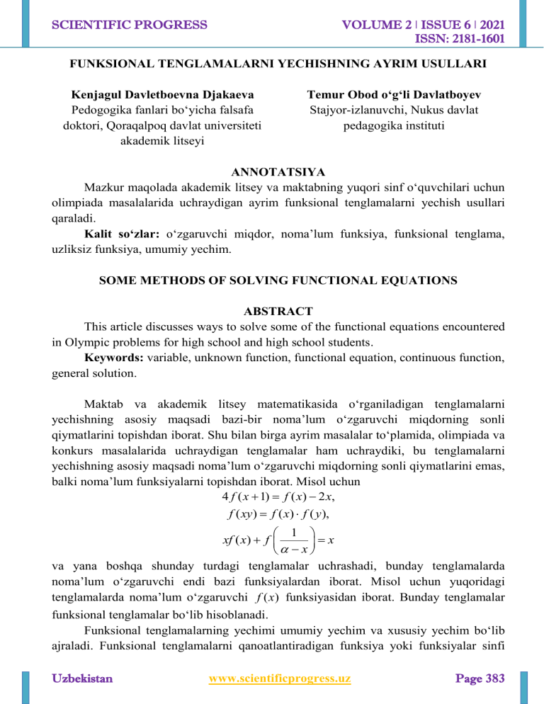 SCIENTIFIC PROGRESS VOLUME 2 ǀ ISSUE 6 ǀ 2021 ISSN: 2181-1601 FUNKSIONAL TENGLAMALARNI YECHISHNING AYRIM USULLARI Kenjagul Davletboevna Djakaeva Pedogogika fanlari boʻyicha falsafa doktori, Qoraqalpoq davlat universiteti akademik litseyi Temur Obod o‘g‘li Davlatboyev Stajyor-izlanuvchi, Nukus davlat pedagogika instituti ANNOTATSIYA Mazkur maqolada akademik litsey va maktabning yuqori sinf o‘quvchilari uchun olimpiada masalalarida uchraydigan ayrim funksional tenglamalarni yechish usullari qaraladi. Kalit so‘zlar: o‘zgaruvchi miqdor, noma’lum funksiya, funksional tenglama, uzliksiz funksiya, umumiy yechim. SOME METHODS OF SOLVING FUNCTIONAL EQUATIONS ABSTRACT This article discusses ways to solve some of the functional equations encountered in Olympic problems for high school and high school students. Keywords: variable, unknown function, functional equation, continuous function, general solution. Maktab va akademik litsey matematikasida o‘rganiladigan tenglamalarni yechishning asosiy maqsadi bazi-bir noma’lum o‘zgaruvchi miqdorning sonli qiymatlarini topishdan iborat. Shu bilan birga ayrim masalalar to‘plamida, olimpiada va konkurs masalalarida uchraydigan tenglamalar ham uchraydiki, bu tenglamalarni yechishning asosiy maqsadi noma’lum o‘zgaruvchi miqdorning sonli qiymatlarini emas, balki noma’lum funksiyalarni topishdan iborat. Misol uchun 4 f ( x 1) f ( x) 2 x, f ( xy ) f ( x) f ( y ), 1 xf ( x) f x x va yana boshqa shunday turdagi tenglamalar uchrashadi, bunday tenglamalarda noma’lum o‘zgaruvchi endi bazi funksiyalardan iborat. Misol uchun yuqoridagi tenglamalarda noma’lum o‘zgaruvchi f ( x) funksiyasidan iborat. Bunday tenglamalar funksional tenglamalar bo‘lib hisoblanadi. Funksional tenglamalarning yechimi umumiy yechim va xususiy yechim bo‘lib ajraladi. Funksional tenglamalarni qanoatlantiradigan funksiya yoki funksiyalar sinfi Uzbekistan www.scientificprogress.uz Page 383 SCIENTIFIC PROGRESS VOLUME 2 ǀ ISSUE 6 ǀ 2021 ISSN: 2181-1601 xususiy yechim bo‘lib topiladi. Funksional tenglamalarni qanoatlantiradigan funksiyalar yoki funksiyalar sinfining yig‘indisi umumiy yechim bo‘lib hisoblanadi. Maktab va akademik litsey matematikasida ko‘proq o‘rganiladigan funksional tenglamalarning biri Koshi tenglamalari sinfiga kiradigan f ( x y ) f ( x) f ( y ) (1) tenglamasi bo‘lib topiladi. Bu tenglama funksiyalarning additivlik xossasi deb ataladigan xossani ifodalaydi. Demak f ( x) additivli funksiya bo‘lsa, u holda bu funksiya (1) tenglamani qanoatlantiradi. Koshi o‘zining additivli tenglamasi bilan birgalikda, hozirgi davrda olimpiada va konkurs masalalarida ko‘proq uchraydigan hamda ko‘pchilik matematik masalalarni yechish paytida o‘quvchilar foydalanadigan f ( x y ) f ( x) f ( y ), f ( xy ) f ( x) f ( y ), f ( xy ) f ( x) f ( y ) ko‘rinishdagi tenglamalarni ham qaraydi. Shu sababli bu tenglamalar ko‘pincha Koshining funksional tenglamalari deyiladi. Bu tenglamalarning yechimlari elementar matematikadan ma’lum bo‘lgan ko‘rsatkichli, logarifmik va darajali funksiyalar orqali ko‘rsatiladi. Quyida Koshi tenglamalarini yechishga olib kelinadigan matematikaning ayrim masalalarini qaraymiz. 1-misol. Mayli tekislikda shunday egri chiziqni topish talab etilsinki, bu egri chiziqning bo‘yida yotgan ixtiyoriy ikki nuqta uchun birining absissasi, ikkinchisining ordinatasiga ko‘paytmasining yig‘indisi, absissasi shu ikki nuqtaning absissalarining ko‘paytmasiga teng bo‘lgan uchinchi nuqtaning ordinatasiga teng bo‘lsin. Yechilishi. Masalani yechish uchun grafigi uzliksiz bo‘lgan va argumentning musbat qiymatlarida aniqlangan funksiyani topish bilan chegaralanamiz. Berilgan masalani yechish f ( xy ) xf ( y ) yf ( x) f ( x) x belgilashni kiritaylik. U holda berilgan tenglamadan Koshi tenglamalarining biri bo‘lib topiladigan g ( xy ) g ( x) g ( y ) ko‘rinishdagi funksional tenglamani yechishga olib kelinadi. Mayli g ( x) tenglamasiga ega bo‘lamiz. x 0 uchun g ( x ) uzliksiz funksiya bo‘lishidan, bu tenglamaning yechimi g ( x) C ln x bo‘ladi, bu erda C erkli o‘zgarmas. Oldingi izlanuvchi funksiyaga qaytib o‘tsak, u holda f ( x) Cx ln x bo‘ladi. 2-misol. x 0 uchun aniqlangan va f ( f ( x)) xf ( x) Uzbekistan www.scientificprogress.uz (2) Page 384 SCIENTIFIC PROGRESS VOLUME 2 ǀ ISSUE 6 ǀ 2021 ISSN: 2181-1601 tenglamasini qanoatlantiradigan uzliksiz f ( x) funksiyasini toping. Yechish. Tenglamaning ko‘rinishidan, noldan farqli hech qanday o‘zgarmas son (2) tenglamani qanoatlantirmasligi aniq. Shuning bilan birga x ning mumkin bo‘lgan qiymatlarida (2) dan f ( x) 0 bo‘lishi kelib chiqadi. Mayli f ( x) y bo‘lsin, u holda (2) ni f ( y ) xy ko‘rinishda yozib, bundan f ( f ( y )) f ( xy ) tengligi kelib chiqadi. Shu bilan birga (2) dan x ni y bilan almashtirib va y f ( x) ekanligini hisobga olib f ( f ( y)) y f ( y ) f ( x) f ( y ) bo‘lishidan f ( xy ) f ( x) f ( y ) tengligiga ega bo‘lamiz. Bu Koshining funksional tenglamasi bo‘lib topiladi. Uning noldan farqli uzliksiz yechimi f ( x) x a ko‘rinishga ega bo‘ladi. Agar Koshi tenglamasida x va y bir biriga bog‘lik bo‘lmagan holda musbat qiymatlarni qabul qilsa, u holda f ( x) x a funksiyasi yechim bo‘lib topiladi. Bizda x va y lar bir-biri bilan y f ( x) ko‘rinishda bog‘langani sababli f ( x) x a funksiyasi (2) tenglamani a ning barcha qiymatlarida qanoatlantirmaydi. Shu maqsatda bu funksiyani berilgan tenglamadagi o‘rinlariga qo‘yib, a ning kerakli qiymatlarini saylab olamiz. 2 f ( x) x a ni (2) tenglamaga qo‘ysak x a x a1 bo‘ladi. Bundan a 2 a 1 bo‘lib, 1 5 1 5 a bo‘ladi, demak f ( x) x 2 va f ( x) x 2 qanoatlantiradi. Shunday qilib berilgan tenglamaning yechimlari f ( x) 0, f ( x) x 1 5 2 , 1 5 2 f ( x) x funksiyalari (2) tenglamani 1 5 2 funksiyalari bo‘lib topiladi. Bazi-bir funksional tenglamalarni yechish jarayonida tenglamaning ikki tomonidan hosila olish maqsadga muofiq bo‘ladi. Bu holda berilgan tenglamada