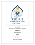 Submitted By: Muqadas Atiq, Aleshba Shabbir and Sakina Sabir Submitted To: Ma’am Rimsha Iqbal Subject: Business Communication Organization: Standard Chartered Bank 1|Page Table Of Contents Acknowledgement ......................................................................................................................... 3 Executive Summary ...................................................................................................................... 4 Introduction ................................................................................................................................... 5 Literature Review ......................................................................................................................... 6 Methodology .................................................................................................................................. 7 Discussion....................................................................................................................................... 7 Communications channel: ........................................................................................................ 7 Internal communication: ....................................................................................................... 8 External communication:....................................................................................................... 8 Means of communication: ........................................................................................................ 8 Reports..................................................................................................................................... 9 Letters:..................................................................................................................................... 9 Electronic mail: .................................................................................................................... 10 Group meetings:.................................................................................................................... 10 Telephone:............................................................................................................................. 11 Communication Barriers:....................................................................................................... 11 Perception ............................................................................................................................. 11 Linguistic difference ............................................................................................................. 11 Time pressure: ...................................................................................................................... 11 Complex organizational structure........................................................................................ 11 Conclusion and recommendations............................................................................................. 12 References .................................................................................................................................... 13 2|Page Acknowledgement We want to express gratitude toward ALLAH Almighty, who has provided us with knowledge, Patience, Courage and most importantly who empowered us to finish my undertaking. By the grace of Almighty Allah, we were able to bring out this report in final shape. We owe a great debt to my respected teacher. In this venture I have taken much direction from my folks and educators. Through the assistance of these individuals my fantasy works out as expected. I want to say thanks to our teacher Ma’am Rimsha Iqbal, who taught us immensely great. We would also like to thank our team members and their immense and relentless support and motivation to complete the report in due time. We perceive this opportunity as a big milestone. We will strive to use the gained skills and knowledge in the best way possible. We will continue to work hard, in order to attain desired course objectives. 3|Page Executive Summary This report is made on the analysis of the communication process of Standard Chartered Bank. It is one of the most reputable bank of Pakistan. The Bank serves both Retail and Corporate and Institutional Banking customers. The analysis was based on the types, forms, means and barriers in the communication. We gathered all the relevant information and prepared this detailed report. After the detailed analysis we came to know that there are two types of communication channels: internal and external communication. Internal communication at Standard Chartered Bank is equally addressed in all three direction i.e. upward, downward and horizontal. Standard Chartered Bank has a very elaborate external communication system which has built over the years of its profitable operations. The medium used to send the information and sources are closely monitored. Then the means of communication which are reports, letters, electronic mail, group meetings etc. We also noticed some barriers which were affecting the communication process which were perception; it refers to how an individual interpret the information send to him, language difference; whereby some words used may have a different meaning from what it was intended during interpretation, time pressure; to achieve a certain set target within a given period tends to either shorten the message and complex organizational structure which is that there are many management levels that make it hard for the employees to pass the information to one to another. After addressing these barriers we also suggested some recommendations which we think would be beneficial for the bank and it would help them to ace. 4|Page Introduction Standard Chartered Bank (Pakistan) Ltd. is one of the oldest and largest international bank in Pakistan. 2013 marked Standard Chartered’s 150th anniversary in Pakistan.