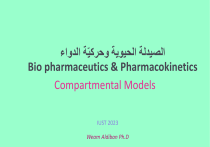 الصيدلة الحيوية وحركيّة الدواء Bio pharmaceutics & Pharmacokinetics Compartmental Models IUST 2023 Weam Aldiban Ph.D • The one-compartment model is the most frequently used model in clinical practice. • the compartment is represented by an enclosed square or rectangle, and rates of drug transfer are represented by straight arrows. Weam Aldiban Ph.D 2 one-compartment model • This model is the simplest because there is only one compartment. All body tissues and fluids are considered a part of this compartment. • Furthermore, it is assumed that after a dose of drug is administered, it distributes instantaneously to all body areas. • the one-compartment model assumes that the drug is distributed to tissues very rapidly after intravenous administration. Weam Aldiban Ph.D 3 Compartment model • Some drugs do not distribute instantaneously to all parts of the body, however, even after intravenous bolus administration. • A common distribution pattern is for the drug to distribute rapidly in the bloodstream and to the highly perfused organs, such as the liver and kidneys. • Then, at a slower rate, the drug distributes to other body tissues. Weam Aldiban Ph.D 4 • This pattern of drug distribution may be represented by a twocompartment model. Drug moves back and forth between these compartments to maintain equilibrium Weam Aldiban Ph.D 5 Weam Aldiban Ph.D 6 7 EXAMPLE • Digoxin, particularly when given intravenously, is an example of a drug that is well described by two compartment pharmacokinetics. • After an intravenous dose is administered, plasma concentrations rise and then rapidly decline as drug distributes out of plasma and into muscle tissue. • After equilibration between drug in tissue and plasma, plasma concentrations decline less rapidly. • The plasma would be the central compartment, and muscle tissue would be the peripheral compartment. Weam Aldiban Ph.D 8 Weam Aldiban Ph.D 9 Volume of Distribution • Drug concentration in the compartment is defined as the amount of drug in a given volume, such as mg/L Weam Aldiban Ph.D 10 Volume of Distribution • Volume of distribution (V) is an important indicator of the extent of drug distribution into body fluids and tissues. • V relates the amount of drug in the body (X) to the measured concentration in the plasma (C). • A large volume of distribution usually indicates that the drug distributes extensively into body tissues and fluids. • Conversely, a small volume of distribution often indicates limited drug distribution. Weam Aldiban Ph.D 11 Volume of Distribution • Volume of distribution indicates the extent of distribution but not the tissues or fluids into which the drug distributes. • Two drugs can have the same volume of distribution, but • one may distribute primarily into muscle tissues. whereas the other may concentrate in adipose tissues. Weam Aldiban Ph.D 12 Weam Aldiban Ph.D 13 Weam Aldiban Ph.D 14 volume of distribution • The volume of distribution is an important parameter for determining proper drug dosing regimens. • Often referred to as the apparent volume of distribution, it does not have an exact physiologic significance, but it can indicate the extent of drug distribution and aid in determination of dosage requirements. • Generally, dosing is proportional to the volume of distribution. Weam Aldiban Ph.D 15 Fluid Distribution in an Adult • To understand how distribution occurs, you must have a basic understanding of body fluids and tissue. 16 Fluid Distribution in an Adult • The fluid portion (water) in an adult makes up approximately 60% of total body weight and is composed of • intracellular fluid (35%) • and extracellular fluid (25%) is made up of • plasma (4%) and interstitial fluid (21%) • These percentages vary somewhat in a child. Weam Aldiban Ph.D 17 Examples • If a drug has a volume of distribution of approximately 15–18 L in a 70-kg person, we might assume that its distribution is limited to extracellular fluid. • If a drug has a volume of distribution of about 40 L, the drug may be distributing into all body water because a 70-kg person has approximately 40 L of body water (70 kg × 60%). • If the volume of distribution is much greater than 40–50 L, the drug probably is being concentrated in tissue outside the plasma and interstitial fluid. Weam Aldiban Ph.D 18 Examples • If a drug distributes extensively into tissues, the volume of distribution calculated from plasma concentrations could be much higher than the actual physiologic volume in which it distributes. • For example, by measuring plasma concentrations, it appears that digoxin distributes in approximately 440 L in an adult. • Because digoxin binds extensively to muscle tissue, plasma levels are fairly low relative to concentrations in muscle tissue Weam Aldiban Ph.D 19 VD • For other drugs, tissue concentrations may not be as high as the plasma concentration, so it may appear that these drugs distribute into a relatively small volume. Weam Aldiban Ph.D 20 • It is also important to distinguish among blood, plasma, and serum. • Blood refers to the fluid portion in combination with formed elements (white cells, red cells, and platelets) • Plasma refers only to the fluid portion of blood (including soluble proteins but not formed elements) • When the soluble protein fibrinogen is removed from plasma, the remaining product is serum Weam Aldiban Ph.D 21 • These differences in biologic fluids must be recognized when considering reported drug concentrations. • The plasma concentration of a drug may be much less than the whole blood concentration if the drug is preferentially sequestered by red blood cells. Weam Aldiban Ph.D 22 CLINICAL CORELATE • Most drug concentrations are measured using plasma or serum that usually generate similar values. • It is more relevant to use plasma or serum than whole blood measurements to estimate drug concentrations at