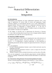 Chapter 8 Numerical Differentiation & Integration 8.1 Introduction Differentiation and integration are basic mathematical operations with a wide range of applications in various fields of science and engineering. Simple continuous algebraic or transcendental functions can be easily differentiated or integrated directly. However at times there are complicated continuous functions which are tedious to differentiate or integrate directly or in the case of experimental data, where tabulated values of variables are given in discrete form, direct methods of calculus are not applicable. In this chapter, we develop ways to approximate the derivatives of function , when only data points are given and also to integrate definite integrals by splitting the area under the curve in specified ways. 8.2 Numerical Differentiation Numerical differentiation is the process of computing the value of the derivative of an explicitly unknown function, with given discrete set of points . To differentiate a function numerically, we first determine an interpolating polynomial and then compute the approximate derivative at the given point. If ’s are equispaced i. Newton's forward interpolation formula is used to find the derivative near the beginning of the table. ii. Newton's backward interpolation formula is used to compute the derivation near the end of the table. iii. Stirling’s formula is used to estimate the derivative near the centre of the table. If ’s are not equispaced, we may find using Newton’s divided difference method or Lagrange’s interpolation formula and then differentiate it as many times as required. 8.2.1 Derivatives Using Newton’s Forward Interpolation Formula Newton’s forward interpolation formula for the function is given by , Differentiating with respect to Also Again Using Now at , we get , Now Or 8.2.2 Derivatives Using Newton’s Backward Interpolation Formula Newton’s backward interpolation formula for the function is given by , Differentiating with respect to Also Again Using Now at , we get , Similarly 8.2.3 Derivatives Using Stirling’s Interpolation Formula Stirling’s central difference interpolation formula (taking as the middle value of the table) is given by: Differentiating with respect to Also Again Using Now at , we get , Similarly 8.2.4 Derivatives of Polynomial with Unequispaced ’s In case where ’s are not equispaced in a given data, the polynomial may be found using Newton’s divided difference method or Lagrange’s interpolation formula and then direct differentiation may be applied. Remark: In case derivative has to be found at a point, whose value needs to be interpolated, then first apply applicable interpolation technique and then differentiate the function. In all the cases irrespective of data points being equispaced or not, the polynomial may be found using the applicable interpolation formulae and then direct differentiation can be done using usual calculus techniques. Example 1 Given a cubic polynomial with following data points 0 5 Find and 1 6 2 3 3 8 at Solution: Derivative has to be evaluated near the starting of the table, thereby constructing forward difference table for the function 3 To find the derivative at , taking and applying the relation: From table , , Substituting these values in , we get , , Also Aliter Newton’s forward interpolation formula given by: , , Also from table , , Substituting these values in , , we get Also Example 2 Given a polynomial with following data points: 1.6 1.0 1.1 1.2 1.3 1.4 1.5 7.989 8.403 8.781 9.129 9.451 9.750 10.031 Find and at and Solution: Derivatives has to be evaluated near the starting as well as towards the end of the table, thereby constructing difference table for the function 7.989 8.403 0.378 0.002 To find the derivative at , taking and applying the relation: From table , , , , Substituting these values in , , we get Also To find the derivative at , taking and applying the relation: From table , , , Substituting these values in , , , we get Also Example3 Following table gives the census population of a state for the years to . Year Population (Million) 1961 1971 1981 1991 2001 19.96 36.65 58.81 77.21 94.61 Find the rate of growth of the population in the year 2001 Solution: Derivative has to be evaluated near the end of the table, thereby constructing backward difference table for the function Year Population 1971 To find rate of growth (derivative) in the year 2001, taking applying the relation: From table , Substituting these values in , , we get , , and Example4 A slider in a machine moves along a fixed straight rod. Its distance cm along the rod is given below for various values of the time . Find the velocity and acceleration of the slider when seconds. 0.6 0 0.1 0.2 0.3 0.4 0.5 30.13 31.62 32.87 33.64 33.95 33.81 33.24 Solution: Derivatives has to be evaluated towards the centre of the table, thereby constructing central difference table for the function . Also , , , 3 , 3, 4, 5, 6 lie along the dotted line as shown. 30.13 31.62 1.25 To find the velocity (derivative) at relation: From table , ., boxes. Substituting these values in , taking and applying the , , , , All the positions have been shown, enclosed in , we get seconds To find the acceleration (second derivative) at Also from table, Substituting these values in ,, and applying the relation , , we get seconds2 Example5 The following data gives corresponding values of pressure ‘ ’ and specific volume ‘ ’ of a super heated expandable system 2 4 6 8 10 105 42.7 25.3 16.7 13 Find the rate of change of volume with respect to pressure, when units. Solution: Values of are not equispaced, thereby constructing divided difference table for the function 105 42.7 0.001 25.3 0.005 16.7 0.025 0.000007 Newton’s divided difference formula is given by Here , , , , Substituting these values in , , , , we get 25.3(1)](0.000007) It is evident that volume decreases with increase in pressure. Example6 Find for the following the foll