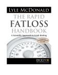 This book is not intended for the treatment or prevention of disease, nor as a substitute for medical treatment, nor as an alternative to medical advice. It is a review of scientific evidence presented for information purposes only. Use of the guidelines herein is at the sole choice and risk of the reader. Copyright: First Edition © 2005 by Lyle McDonald. All rights reserved. Second Edition © 2008 by Lyle McDonald. All rights reserved. This book or any part thereof, may not be reproduced or recorded in any form without permission in writing from the publisher, except for brief quotations embodied in critical articles or reviews. For information contact: Lyle McDonald Publishing PO Box 1713 Salt Lake City, Ut 84110 Email: lylemcd@comcast.net Cover and interior book design by Jazz Kalsi Email: jkalsi@gmail.com ISBN: 978-0-9671456-4-8 SECOND EDITION FIRST PRINTING Ac knowledgments As always, I’d like to thank the members of my web forum for being both guinea pigs for the diet as well as providing invaluable feedback, especially on the final 4 chapters. A special thanks goes out to forum member Kurtis Thompson who helped me decide on a final book title. And, of course I’d like to thank everybody who thinks enough of me to keep purchasing my books. Table of Contents INTRODUCTION .................................................................................................5 JUST HOW QUICKLY.........................................................................................7 WHEN IS A CRASH DIET APPROPRIATE?.....................................................12 BASIC NUTRITION OVERVIEW .......................................................................15 NUTRIENT METABOLISM OVERVIEW............................................................21 AN OVERVIEW OF THE DIET ..........................................................................25 ESTIMATING BODY FAT PERCENTAGE ........................................................29 EXERCISE.........................................................................................................33 SETTING UP THE DIET ....................................................................................46 METABOLIC SLOWDOWN AND WHAT TO DO ABOUT IT.............................58 FREE MEALS, REFEEDS AND DIET BREAKS................................................65 ENDING THE DIET - INTRODUCTION .............................................................74 MOVING TO MAINTENANCE: NON-COUNTING METHOD PART 1 ...............80 MOVING TO MAINTENANCE: NON-COUNTING METHOD PART 2 ...............86 MOVING TO MAINTENANCE: CALCULATION METHOD ...............................95 BACK TO DIETING .........................................................................................106 APPENDIX 1: BMI AND BODY FAT CHARTS ...............................................112 MY OTHER BOOKS........................................................................................115 4 Introduction I want to say at the outset that writing this book makes me a little bit uncomfortable for reasons I’ll explain in a moment. Now, for the most part, an individual’s personal choices are really none of my concern: what people do to or for themselves is their own problem. At the same time, I have a responsibility to my readers when I present something that has the potential to be harmful or damaging. It’s why I spent literally chapters discussing potential risks or side-effects in my previous books. Like the issue of dehydrating to make weight, crash dieting is a topic that I get a little bit antsy about. So why am I writing about it? The first reason is reality. Trust me, I’d love to live in a world where nobody crash dieted, where everybody followed sane and safe dieting strategies and stuck with it in the long term until they reached their goal and then stuck with those newfound eating habits in the long-term. I also want a pony and to be six feet tall and to be an astronaut. And how about an end to world hunger while I’m at it. My point? When idealism and reality slam together it’s never pretty. People are going to crash diet no matter what I or anybody else tell them. Secondly, there are times when crash dieting might be more effective or even required. I know that mainstream nutritionist types will tell you that crash dieting is always bad but, as with just about any absolutist stance, this isn’t necessarily correct. I’ll talk about some of those situations in chapter two, times when crash dieting may be preferred or even required. Finally, I am aware of at least two other approaches (Extreme Crash Dieting by Dr. Eric Serrano and The Radical Diet by Dr. Mauro DiPasquale) that address the issue of rapid weight and fat loss. I’m familiar with both books (and know both authors) and, well, being who and what I am, I know I can do better. I hope my readers feel the same. The bottom line is this, no matter what I or anybody else says about it, people are going to crash diet. Sometimes it’s necessary or beneficial, other times it’s not. Regardless, people are going to do it. With that realization made, I figure that the least that can be done is to make sure that such crash diets are done as safely and as intelligently as possible. Using nutritional science and research, we can develop a crash diet that isn’t totally stupid, that will be safe and sane (within the limits of crash dieting) at least compared to everything else that’s out there. Trust me, there’s a lot of really dumb ways to lose weight fast out there. All vegetables, all fruit, nothing but broth, that cabbage soup thing, just a lot of stupid, stupid stuff. This book isn’t such an approach. It relies on cutting edge nutritional science to ensure that rapid weight/fat loss is accomplished as effectively and safely as possible. I’d be lying if I said it was an easy diet, but it is an effective one. 5 The obligatory warning Now matter how safe you make it, extended crash di