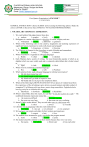 PLACER NATIONAL HIGH SCHOOL Magsaysay, Placer, Surigao del Norte School Id: 304837 Email: 304837@deped.gov.ph Document Type: TOS-MIL Revision No.: 00 Effective Date October 27-28,2022 1 of 3 Page No. First Quarter Examination in ENGLISH 7 S.Y.2023-2024 GENERAL INSTRUCTION: Choose the BEST answer among the following options. Shade the correct LETTER on the answer sheet. STRICTLY NO ALTERATIONS/ERASURES. I. VOCABULARY/ IDIOMATIC EXPRESSION: 1. We could seldom find ethnic dances these days. a. modern b. popular c. lively d. cultural 2. Philippines is a nation where there is a diversity of culture, religion, and race. a. widespread b. mixture c. additional d. greatness 3. Which of the following refers to the creative, imaginative and enduring expression of significant human experience in words well-chosen and arranged? a. Literature b. Experience c. Culture d. Emotion 4. The Filipinos are famous for the bayanihan or spirit of kinship and camaraderie. a. friendship b. envy c. loyalty d. laziness 5. Which word below is regarded as colloquial language? a. Buddy b. chum c. friend d. sidekick 6. Early Filipinos had a system of writing. The most historically popular of which is an alphabet which was once widely used and is commonly called alibata but is better termed as_________. a. Sipol b. Orik c. Baybayin d. Lilok 7. Which word is considered as familiar language? a. Buy b.grabs c. sells d. Purchase 8. Which sentence below used colloquial language in informal conversation? a. My old chum treated me well. b. My friend bought an old expensive car. c. My friend and I got hold of expensive item d. My buddy and my sis pig out my sumptuous dinner. 9. Which of the following KARUNUNGANG BAYAN are pieces of wisdom based from the experiences of the old aiming to give advices on good manners and right conduct of youngsters? E.g.Habang maliit ang kumo, matuto kang mamaluktot, Pagkahaba-haba man ng prusisyon sa simbahan din ang tuloy. a. Salawikain b. Sawikain c.Kawikaan d. Kasabihan 10. When I asked Mike about his exams, he said that “it was just a piece of a cake.” The underlined idiomatic expression means that_________. a. the exam was difficult c. the exam was easy b. the exam was very long d. the exam was very confusing 11. Jemuel’s father works abroad. They see each other once in a blue moon only. a. rarely b. often c. always d. everyday 12. Christine was on cloud nine when her crush smiled at her. a. very happy b. very sad c. very irritated d. very surprised 13. We look up to our parents and elders for their wisdom and experience. a. Admire b. respect c. hate d. love 14. The students were instructed to grab a seat before the program started. a. stand b. shout c. sit down d. jump 15. The teacher asked the students to zip their months because they were very noisy. a. Eat snacks b. Stop talking c. Drink water d. Kiss each other PLACER NATIONAL HIGH SCHOOL Magsaysay, Placer, Surigao del Norte School Id: 304837 Email: 304837@deped.gov.ph Document Type: TOS-MIL Revision No.: 00 Effective Date October 27-28,2022 2 of 3 Page No. II. GRAMMAR A. SUBJECT-VERB AGREEMENT Direction: Select the correct form of the verb to fill in the blank in the following sentences. 16. Everyone ______done his or her homework. a. is b. are d. has d. have 17. Each of the students _________ responsible for doing his or her work a. are b. is d. was d. were 18. The student, as well as his teacher, ______going on the field trip. a. are b. is c. was d. were 19. Samantha ___________next to my house. a. live b. lives c. lived d. leave 20. They _________their weekend. a. enjoyed b. enjoy c. enjoys d. had enjoyed 21. These six chairs ___________sixty thousand pesos. a. cost b. costs c. costing d. was cost 22. The man with the flowers __________ like my brother. a. Look b. looks b. is looking c. was looking 23. The girls _____ to school every day. a. Walk b. walks c. walked d. walking 24. The player on the basketball team _________ the ball to high. a. Bounce b. bounced d. bouncing d. bounces 25. The mother ___________ breakfast for her family. a. cook b. cooked c. cooks d.cooking B. PRONOUN-ANTECEDENT AGREEMENT: Direction: Choose the correct pronoun that agrees with the antecedent in the following sentences. 26. A number of waterways can also be found in Samal, though none of ______ is navigable. a. It b. its c. their d. them 27. Allan observed changes in ___________ body after taking the medicine. a. He b. his c. her d. him 28. The new employees signed ______________ contracts for the coming season. a. It b. his c. her d. their 29. That house is historically important because __________is 150 years old. a. She b. its c. it d. he 30. Maine likes walking home because __________ can save money on bus fare. a. It b. She c. he d. Her C. TYPES OF SENTENCES. Use the choices in the box. a. Simple b. Compound c. Complex d. Compound-Complex 31. Katie found the rabbit. A 32. Children are not allowed to go outside so they enrolled for online class. B 33. A person should be careful when driving a car. A 34. Mila passed the test because he studied hard and understood the lesson. D 35. Because Kayla has so much climbing experience, we asked her to lead our group. C 36. John and Ben need guitar lessons. A 37. Since we wanted to have fun my boyfriend and I went to San Juan, and we danced all night. D 38. Even though Gina is ugly, he is popular.C 39. He stands at the bottom of the cliff while the climber moves up the rock. B 40. The country is located near the equator so it experiences dry and rainy season. B PLACER NATIONAL HIGH SCHOOL Magsaysay, Placer, Surigao del Norte School Id: 304837 Email: 304837@deped.gov.ph Document Type: TOS-MIL Revision No.: 00 Effective Date October 27-28,2022 3 of 3 Page No. III. READING COMPREHENSION A. Use the following medicine label to answer the questions. Children’s Aspirin (Liquid Form) For fast, safe relief of fever and the aches and pains of colds and flu, earaches, and other childhood illnesses. Dosage Informa