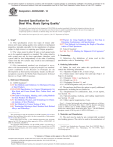 This international standard was developed in accordance with internationally recognized principles on standardization established in the Decision on Principles for the Development of International Standards, Guides and Recommendations issued by the World Trade Organization Technical Barriers to Trade (TBT) Committee. Designation: A228/A228M − 18 Standard Specification for Steel Wire, Music Spring Quality1 This standard is issued under the fixed designation A228/A228M; the number immediately following the designation indicates the year of original adoption or, in the case of revision, the year of last revision. A number in parentheses indicates the year of last reapproval. A superscript epsilon (´) indicates an editorial change since the last revision or reapproval. This standard has been approved for use by agencies of the U.S. Department of Defense. 1. Scope* 1.1 This specification covers two types of round, colddrawn steel music spring quality wire, uniform in mechanical properties, intended especially for the manufacture of springs subject to high stresses or requiring good fatigue properties. 1.2 The values stated in either SI units or inch-pound units are to be regarded separately as standard. The values stated in each system may not be exact equivalents; therefore, each system shall be used independently of the other. Combining values from the two systems may result in non-conformance with the standard. 1.3 This international standard was developed in accordance with internationally recognized principles on standardization established in the Decision on Principles for the Development of International Standards, Guides and Recommendations issued by the World Trade Organization Technical Barriers to Trade (TBT) Committee. 2. Referenced Documents 2.1 ASTM Standards:2 A370 Test Methods and Definitions for Mechanical Testing of Steel Products A510/A510M Specification for General Requirements for Wire Rods and Coarse Round Wire, Carbon Steel, and Alloy Steel A700 Guide for Packaging, Marking, and Loading Methods for Steel Products for Shipment A751 Test Methods, Practices, and Terminology for Chemical Analysis of Steel Products A938 Test Method for Torsion Testing of Wire A941 Terminology Relating to Steel, Stainless Steel, Related Alloys, and Ferroalloys 1 This specification is under the jurisdiction of ASTM Committee A01 on Steel, Stainless Steel and Related Alloys and is the direct responsibility of Subcommittee A01.03 on Steel Rod and Wire. Current edition approved Sept. 1, 2018. Published September 2018. Originally approved in 1939. Last previous edition approved in 2016 as A228/A228M – 16. DOI: 10.1520/A0228_A0228M-18. 2 For referenced ASTM standards, visit the ASTM website, www.astm.org, or contact ASTM Customer Service at service@astm.org. For Annual Book of ASTM Standards volume information, refer to the standard’s Document Summary page on the ASTM website. E29 Practice for Using Significant Digits in Test Data to Determine Conformance with Specifications E1077 Test Methods for Estimating the Depth of Decarburization of Steel Specimens 2.2 Federal Standard: Fed. Std. No. 123, Marking for Shipment (Civil Agencies)3 3. Terminology 3.1 Definitions—For definitions of terms used in this specification, refer to Terminology A941. 4. Ordering Information 4.1 Orders for steel wire under this specification shall contain the following information: 4.1.1 Quantity (weight in lbs, or mass in kg), 4.1.2 Name (music steel spring wire) and type (Type 1 or Type 2) of material, 4.1.3 Diameter (Table 1 and Section 9), 4.1.4 Finish (see 10.2), 4.1.5 Packaging (Section 15), and 4.1.6 ASTM designation and year of issue. 4.2 The purchaser shall have the option to specify additional requirements, including but not limited to: 4.2.1 Requirements for certifications, heat, or test reports, (see Section 14), 4.2.2 Special packing, marking, and loading requirements (see Section 15), and 4.2.3 Other special requirements, if any. NOTE 1—A typical inch-pound units ordering description is as follows: 10 000 lb Music Steel Spring Wire, Type 1, 0.055 in. diameter, phosphate coated in 1000 lb coils to ASTM A288M_A228M dated _____, or for metric units, 5000 kg Music Steel Spring Wire, Type 1, 1.40 mm diameter, phosphate coated in 500 kg coils to ASTM A288 dated _____. 5. Materials and Manufacture 5.1 The steel may be made by any commercially accepted steel-making process. The rod to be used in the manufacture of 3 Available from Standardization Documents Order Desk, DODSSP, Bldg. 4, Section D, 700 Robbins Ave., Philadelphia, PA 19111–5098, http:// www.dodssp.daps.mil. *A Summary of Changes section appears at the end of this standard Copyright © ASTM International, 100 Barr Harbor Drive, PO Box C700, West Conshohocken, PA 19428-2959. United States Copyright by ASTM Int'l (all rights reserved); Mon Nov 12 01:26:51 EST 2018 1 Downloaded/printed by Ricardo Villarreal (Advanex Americas, Inc.) pursuant to License Agreement. No further reproductions authorized. A228/A228M − 18 TABLE 1 Tensile Requirements Inch-Pound Units Diameter, in.A 0.004 0.005 0.006 0.007 0.008 0.009 0.010 0.011 0.012 0.013 0.014 0.015 0.016 0.018 0.020 0.022 0.024 0.026 0.028 0.030 0.032 0.034 0.036 0.038 0.040 0.042 0.045 0.048 0.051 0.055 Tensile Strength, ksi min max 439 426 415 407 399 393 387 382 377 373 369 365 362 356 350 345 341 337 333 330 327 324 321 318 315 313 309 306 303 300 485 471 459 449 441 434 428 422 417 412 408 404 400 393 387 382 377 373 368 365 361 358 355 352 349 346 342 339 335 331 Diameter, in.A 0.059 0.063 0.067 0.072 0.076 0.080 0.085 0.090 0.095 0.100 0.102 0.107 0.110 0.112 0.121 0.125 0.130 0.135 0.140 0.145 0.150 0.156 0.162 0.177 0.192 0.207 0.225 0.250 0.262 0.283 Tensile Strength, ksi min max 296 293 290 287 284 282 279 276 274 271 270 268 267 266 263 261 259 258 256 254 253 251 249 245 241 238 235 230 228 223 327 324 321 317 314 312 308 305 303 300 299 296 295 294 290 288 286 285 283 281 279 277 275 