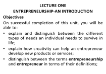 LECTURE ONE ENTREPRENEURSHIP-AN INTRODUCTION Objectives On successful completion of this unit, you will be able to: • explain and distinguish between the different types of needs an individual needs to survive in life; • explain how creativity can help an entrepreneur develop new products or services; • distinguish between the terms entrepreneurship and entrepreneur in terms of their definitions; • list and explain the challenges and benefits of being an entrepreneur; • develop and explain solutions for overcoming entrepreneurial challenges; • explain the characteristics one should have to be able to overcome entrepreneurial challenges. Entrepreneurship can be defined as: • a field of business that seeks to understand how opportunities to create something new (e.g., new products or services, new markets, new production processes or raw materials, new ways of organizing existing technologies) arise and are discovered or created by specific persons, who then use various means to exploit or develop them, thus producing a wide range of effects. • the ability to identify business opportunities, which can be transformed into successful businesses through creative and innovative processes. • Entrepreneurship refers to a process that causes changes in an economy through innovation by individuals who respond to opportunities in the market. • The process of identifying a need, developing a product or service to satisfy that need together with all the other related activities. An entrepreneur can be described as• “one who creates a new business in the face of risk and uncertainty for the purpose of achieving profit and growth by identifying significant opportunities and assembling the necessary resources to capitalize on them” • An entrepreneur is “one who organizes, manages, and assumes the risks of a business or enterprise” Entrepreneurship Environment • Entrepreneurship is not only about business. • It involves other role players that also have an influence on the way we do business. • Entrepreneurship focuses on management tasks and functions but adds the dimension of a person and the environment to make a complete picture. • Just as an individual cannot survive on his or her own, in the same way, a business cannot survive on its own. Who are these other parties (stakeholders) that will interact with a business or play a role in its activities? 1. The owner: For our purposes, we will call the owner the entrepreneur. The person who manages the business is of vital importance 2. The external environment: • The community, • customers, • other businesses and various other stakeholders from the external environment of the business. No business can survive without taking the environment into consideration. • A business needs the support of the community who will become customers and buy goods and/or services. • The business relies on financial institutions e.g. banks for credit and; • On suppliers for stock or materials. Because the environment plays a very important role in the success of the business, • it should be carefully scanned for opportunities continually, • always keeping an eye on competitors and new developments. Development of Ideas • A prospective entrepreneur needs to come up with a good idea, which will then serve as the foundation of a new venture. • An entrepreneur has the difficult task of turning a business idea into a business opportunity, either by starting a new business or by injecting new life into an existing one. • To help him along each step of the journey — from finding the idea in the first place through its planning and implementation — the entrepreneur must consider different aspects, such as the needs of the community and creativity. Needs of the Community • Businesses depend on the community to become consumers of their products. • The needs of the community are important when we form our ideas of a product or service. • We can distinguish between two types of needs: Basic needs 1. These are needs for things that we need to survive. For example, we need a house to live in to protect us against weather like rainfall, heat or cold, etc. 2. 3. Other needs (Wants) 2. These are called the nonessential needs. We can survive without them but want it to make our lives more comfortable, such as luxury cars, Plasma screen TV’s, etc. 2. 3. • Looking at the needs of people will help a potential entrepreneur to identify possible entrepreneurial opportunities. • What is important is that the entrepreneur needs to be original, innovative and creative to be able to develop a product or a service that people really need but is not available. Challenges and Benefits of Entrepreneurship • Entrepreneurship is fast becoming a major force in world economy. • Entrepreneurship, therefore, needs to change as the world continues to change. • Entrepreneurship proves to be very good for any economy, but it does not mean that it is always a smooth-sailing process. What are the Challenges for Entrepreneurship? • Setting up a business is not an easy or smooth process. • The process involves different decisions to be made with accompanying planning and implementation thereafter. Challenges can involve: 1) finding the right idea and opportunity to break into the market; 2) difficulties acquiring the resources (including land or raw materials, financial resources, labour and entrepreneurial ability) necessary for production and distribution of goods and services; 3) the high costs of creating internal roles, relationships and operating routines in new organisations; 4) the time and investment required to establish external relationships that are conditioned on experience, reputation, and trust; and 5) competition, often with very limited resources, with mature organisations that already have goods or services in the marketplace and that enjoy established customer relationships. Benefits of Entrepreneurship • Bu