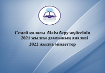 Семей қаласы білім беру жүйесінің 2021 жылғы дамуының анализі 2022 жылға міндеттер Мектепке дейінгі және орта білім берудің басым бағыттары Мектепке дейінгі тәрбие және оқытудың жаңа моделін іске асыру Мұғалімдердің сапалық әлеуетін жақсарту Білім беру сапасын арттыру, функционалдық сауаттылықты дамыту Дарынды балаларды қолдау және дамыту Қол жетімділік және инклюзивті білім беруді қамтамасыз ету Реализация новой модели дошкольного воспитания и обучения Что сделано: Охват детей от 1до 6 лет - 77% Охват детей от 2до 6 лет - 98,6 % Вовлечение родительской общественности детских садов в управление процессом образования Охват инклюзивным образованием (13 групп в них 194 детей) Начато внедрение обновленной системы оценки качественного уровня педагогов ДО Развитие сети дошкольных организаций: всего-60 (45-частных). Отрыто 12 групп раннего развития Создание безопасной и комфортной среды воспитания и обучения (оснащение системой видеонаблюдения, вывод в центр оперативного управления) Компенсация родительской оплаты за питание для особых категорий– 1000 семей Детские сады - участники проектов: • «Читающая школа» • Пилотный проект «Интеграция самопознания в учебновоспитательный процесс ДО» • «Экологическое воспитание и культура » Автоматизация и цифроризация процессов (электронные табеля, обратная связь через сайты) Проблемы: Слабая материально-техническая база дошкольных организаций Недостаточный уровень профессиональной компетентности воспитателей, 49 % не имеют квалификационные категории 34 % педагогов не имеют профильного образования Принимаемы меры в 2022 году Строительство 2 детских садов на 640 мест Расширение мест в действующих дошкольных организациях на 392 мест для детей 1 -3 лет Развитие и расширение сети консультационных центров для родителей в частных ДО Создание творческих групп для поддержки педагогов Изучение и распространение опыта лучших педагогов области, республики Мұғалімдердің сапалық әлеуетін жақсарту Атқарылған жұмыстар? Цифрлық сауаттылық бойынша біліктілік арттыру курстарынан өтті – 100%, жаңартылған білім мазмұны бойынша – 90%, пәндік курстар - 58 1502 мұғалім біліктілік санатын алды: педагог – шебер – 50, зерттеуші - 540, сарапшы - 435, модератор-473 Проблемалар 12 мұғалім облысты деңгейдегі әдістемелік конкурстардың жеңімпазы болды 17 авторлық бағдарлама ШҚО сараптамалық кеңесіне тіркеуден өтті 183 мұғалім педагогикалық шеберлік конкурстарына қатысты (өткен жылмен салыстырғанда 30%-ға артық) Ауылдық мектептерге әдістемелік десант «НЗМ» АҚ тренерлерін қатыстырумен онлайн кеңестер өткізу арқылы тұрақты түрде жұмыс жүргізіледі Білім көрсеткіші жоғары мектептердің нәтижелілігі төмен мектептерге ………. ЖОО-мен, колледждермен ведомствоаралық ынтымақтастық Орыс тілі, бастауыш сынып педагогтерінің, орыс тілінде оқытатын тәрбиешілердің жеткіліксіздігі Мектеп түлектері мемлекеттік тілді толық меңгермейді Ауылдық жерлерде білікті педагогтердің жетіспеушілігі 2022 жылы қабылданатын шаралар Мұғалімдер қызметін психологиялық сүйемелдеу Шебер мұғалімдердің, магистрлердің тәжірибесін тарату бойынша шығармашылық топтардың жұмысын жандандыру Қала мұғалімдері арасында тәжірибесін тарату үшін үздік педагогтерді, ғалымдарды тарту. Педагогикалық ЖОО-ның үздік түлектерін қаланың білім беру мекемелерінде жұмысқа тар