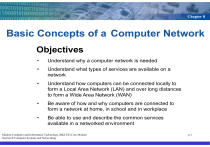 Chapter 8 Basic Concepts of a Computer Network Objectives • Understand why a computer network is needed • Understand what types of services are available on a network • Understand how computers can be connected locally to form a Local Area Network (LAN) and over long distances to form a Wide Area Network (WAN) • Be aware of how and why computers are connected to form a network at home, in school and in workplace • Be able to use and describe the common services available in a networked environment Modern Computer and Information Technology (HKCEE) Core Module Section B Computer Systems and Networking p.1 Chapter 8 8.1 Need for a Computer Network 8.1.1 Case Studies • Case 8.1: In school, Jane needs to save her working files in A1 computer laboratory into a floppy disk and give it to her classmate in A2 laboratory for review. With computer network: Jane can save files in a file server. When Jane amends files in A1 computer laboratory, her classmates can see the new updates in A2 computer laboratory at the same time. Modern Computer and Information Technology (HKCEE) Core Module Section B Computer Systems and Networking p.2 Chapter 8 • Case 8.2 : John works in a shipping company. He is responsible for data entry and often needs to print the shipping orders of the company. However, no printer is connected to his computer. John must save all files into a floppy disk and use another computer to print the shipping orders. This is very inconvenient for John. With computer network: John can now directly print the shipping orders to a networked printer from his computer. One printer can handle all the printing tasks. Modern Computer and Information Technology (HKCEE) Core Module Section B Computer Systems and Networking p.3 Chapter 8 8.1.2 Why do We Need a Computer Network ? A network is a way to connect computers for : • Communication • Data exchange • Resource sharing Most companies have PCs connected to form a network in their offices Modern Computer and Information Technology (HKCEE) Core Module Section B Computer Systems and Networking p.4 Chapter 8 Three of the most important benefits that are brought by network include the following: • It allows many users to access the same programs and data simultaneously • It makes electronic communications easier • It allows users to share peripheral devices, such as printers and scanners Modern Computer and Information Technology (HKCEE) Core Module Section B Computer Systems and Networking Video conferencing is available in the network environment p.5 Chapter 8 8.2 Types of Network When two or more computers are connected, a network is formed. There are two main types of network: • Local Area Network (LAN) • Wide Area Network (WAN) Modern Computer and Information Technology (HKCEE) Core Module Section B Computer Systems and Networking p.6 Chapter 8 8.2.1 Local Area Network (LAN) • A Local Area Network (LAN) consists of computers that are relatively near to each other • It can consist of just two or three PCs connected together to share resources. It can also connect hundreds of computers of different kinds • The connection can be made either by cables, infrared links, or small wireless devices Modern Computer and Information Technology (HKCEE) Core Module Section B Computer Systems and Networking An example of a local area network connecting several PCs, printers, a file server and a network gateway p.7 Chapter 8 8.2.2 Wide Area Network (WAN) • A typical Wide Area Network (WAN) consists of two or more local area networks connected together across a wide geographical area • Public utilities, such as the telephone line system, are usually used for the transmission of data • The cost associated with transmitting data is another major difference between WAN and LAN. It is relatively more expensive in WAN than that of in LAN. 8.2.3 Metropolitan Area Network (MAN) Metropolitan Area Network (MAN) is a network that interconnects computers in a geographic area larger than that covered by LAN but smaller than that covered by WAN. Modern Computer and Information Technology (HKCEE) Core Module Section B Computer Systems and Networking p.8 Chapter 8 An illustration of a Wide Area Network (WAN) Modern Computer and Information Technology (HKCEE) Core Module Section B Computer Systems and Networking p.9 Chapter 8 8.3 Network Models 8.3.1 Peer-to-peer Model • A peer-to-peer model is a LAN where computers are simply connected together • Each computer has equal relations with each other and controls which computer can use its resources A peer-to-peer model Modern Computer and Information Technology (HKCEE) Core Module Section B Computer Systems and Networking p.10 Chapter 8 8.3.2 Client/Server Model In a client/server network model, we have: client • Server: A computer that has central control over all network resources. • Clients: Other computers connected to the server. Server client client A client/server model Modern Computer and Information Technology (HKCEE) Core Module Section B Computer Systems and Networking p.11 Chapter 8 Network model Peer-to-peer Advantages Disadvantages Inexpensive and easy to set up Lacks of management software to effectively monitor the activities of a network Client/server Handles very large networks efficiently Table 8.1 The cost of installation and administration is high Advantages and disadvantages of peer-to-peer and client/server models Modern Computer and Information Technology (HKCEE) Core Module Section B Computer Systems and Networking p.12 Chapter 8 8.4 Basic Requirements for Establishing a Computer Network The basic requirements of a network are: • Each computer must have a network card • Network protocol • A hub or a router • Cables or microwaves • Network operating system Modern Computer and Information Technology (HKCEE) Core Module Section B Computer Systems and Networking p.13 Chapter 8 8.4.1 Protocols Networks are governed by protocols, which are rules for sendi