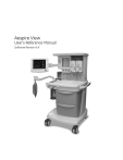 Aespire View User’s Reference Manual Software Revision 6.X Datex-Ohmeda, Inc., a General Electric Company, doing business as GE Healthcare. User Responsibility This Product will perform in conformity with the description thereof contained in this User’s Reference manual and accompanying labels and/or inserts, when assembled, operated, maintained, and repaired in accordance with the instructions provided. This Product must be checked periodically. A defective Product should not be used. Parts that are broken, missing, plainly worn, distorted, or contaminated should be replaced immediately. Should repair or replacement become necessary, Datex-Ohmeda recommends that a telephonic or written request for service advice be made to the nearest Datex-Ohmeda Customer Service Center. This Product or any of its parts should not be repaired other than in accordance with written instructions provided by Datex-Ohmeda and by Datex-Ohmeda trained personnel. The Product must not be altered without the prior written approval of Datex-Ohmeda. The user of this Product shall have the sole responsibility for any malfunction which results from improper use, faulty maintenance, improper repair, damage, or alteration by anyone other than Datex-Ohmeda. CAUTION U.S. Federal law restricts this device to sale by or on the order of a licensed medical practitioner. Outside the U.S.A., check local laws for any restriction that may apply. Datex-Ohmeda products have unit serial numbers with coded logic which indicates a product group code, the year of manufacture, and a sequential unit number for identification. The serial number can be in one of two formats. AAAX11111 The X represents an alpha character indicating the year the product was manufactured; H = 2004, J = 2005, etc. I and O are not used. AAAXX111111AA The XX represents a number indicating the year the product was manufactured; 04 = 2004, 05 = 2005, etc. Aespire, 7900 Ventilator, Advanced Breathing System, Link-25, ComWheel, Disposable Multi Absorber, EZchange, Reusable Multi Absorber, PSVPro, SmartVent, Tec 6, and Tec 7 are registered trademarks of Datex-Ohmeda, Inc. Other brand names or product names used in this manual are trademarks or registered trademarks of their respective holders. Table of Contents 1 Introduction Intended use . . . . . . . . . . . . . . . . . . . . . . . . . . . . . . . . . . . . 1-2 Symbols used in the manual or on the equipment . . . . . . . . 1-3 Typeface conventions used . . . . . . . . . . . . . . . . . . . . . . . . . 1-6 Abbreviations . . . . . . . . . . . . . . . . . . . . . . . . . . . . . . . . . . . . 1-6 2 System Controls and Menus Anesthesia system controls . . . . . . . . . . . . . . . . . . . . . . . . . 2-2 Advanced breathing system (ABS) components . . . . . . . . . 2-5 Optional ABS components . . . . . . . . . . . . . . . . . . . . . . . 2-7 Vaporizer controls . . . . . . . . . . . . . . . . . . . . . . . . . . . . . . . . 2-8 ACGO . . . . . . . . . . . . . . . . . . . . . . . . . . . . . . . . . . . . . . . . 2-10 Scavenging the ACGO sample flow . . . . . . . . . . . . . . . 2-11 Scavenging from an auxiliary manual breathing circuit 2-11 Scavenging a gas monitor sample flow . . . . . . . . . . . . 2-11 Ventilator controls . . . . . . . . . . . . . . . . . . . . . . . . . . . . . . . 2-12 Ventilator screen . . . . . . . . . . . . . . . . . . . . . . . . . . . . . . . . 2-13 Using menus . . . . . . . . . . . . . . . . . . . . . . . . . . . . . . . . . . . 2-14 3 Operation Turning on the system . . . . . . . . . . . . . . . . . . . . . . . . . . . . . 3-2 Start mechanical ventilation . . . . . . . . . . . . . . . . . . . . . . . . . 3-2 Start manual ventilation . . . . . . . . . . . . . . . . . . . . . . . . . . . . 3-2 Ventilator setup . . . . . . . . . . . . . . . . . . . . . . . . . . . . . . . . . . 3-3 Using quick keys . . . . . . . . . . . . . . . . . . . . . . . . . . . . . . 3-3 Changing ventilator modes and settings . . . . . . . . . . . . 3-4 Alarm Setup . . . . . . . . . . . . . . . . . . . . . . . . . . . . . . . . . . . . . 3-5 Setting volume alarms . . . . . . . . . . . . . . . . . . . . . . . . . . 3-5 Alarm limit setup . . . . . . . . . . . . . . . . . . . . . . . . . . . . . . 3-5 Setup/Calibration . . . . . . . . . . . . . . . . . . . . . . . . . . . . . . . . . 3-6 M1132382 i Aespire View Screen and audio setup . . . . . . . . . . . . . . . . . . . . . . . . . . . . 3-7 Cardiac Bypass . . . . . . . . . . . . . . . . . . . . . . . . . . . . . . . . . . 3-8 Measure circuit compliance . . . . . . . . . . . . . . . . . . . . . . . . . 3-9 Pressure waveform . . . . . . . . . . . . . . . . . . . . . . . . . . . . . . . 3-9 EZchange canister (optional) . . . . . . . . . . . . . . . . . . . . . . . 3-10 Condenser (optional) . . . . . . . . . . . . . . . . . . . . . . . . . . . . . 3-11 Passive AGSS (optional) . . . . . . . . . . . . . . . . . . . . . . . . . . 3-12 Connecting passive AGSS . . . . . . . . . . . . . . . . . . . . . . 3-12 Active AGSS (optional) . . . . . . . . . . . . . . . . . . . . . . . . . . . 3-13 Connecting active AGSS with a flow indicator . . . . . . . 3-14 Connecting active adjustable AGSS . . . . . . . . . . . . . . 3-15 Total flow sensing (optional) . . . . . . . . . . . . . . . . . . . . . . . 3-15 4 Preoperative Checkout Every day before your first patient . . . . . . . . . . . . . . . . . . . . 4-2 Before every patient . . . . . . . . . . . . . . . . . . . . . . . . . . . . . . . 4-3 5 Preoperative Tests Inspect the system . . . . . . . . . . . . . . . . . . . . . . . . . . . . . . . . 5-2 Power failure alarm test . . . . . . . . . . . . . . . . . . . . . . . . . . . . 5-3 Pipeline test . . . . . . . . . . . . . . . . . . . . . . . . . . . . . . . . . . . . . 5-3 Total flow sensing test (if equipped) . . . . . . . . . . . . . . . . . . 5-3 Cylinder test . . . . . . . . . . . . . . . . . . . . . . . . . . . . . . . . . . . . . 5-4 Flow control test . . . . . . . . . . . . . . .