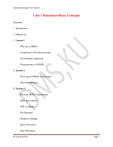 Database Management Systems Unit-1 Databases-Basic Concepts Structure 1. Introduction 2. Objectives 3. Lesson-1 Why use a DBMS Limitations of file based system The Database Approach Characteristics of DBMS 4. Lesson-2 The Logical DBMS Architecture Data independence 5. Lesson-3 Physical DBMS Architecture DML Precompiler DDL Compiler File Manager Database Manager Query Processor Data Dictionary Dr. Tariq Ahmad Page 1 Database Management Systems 6. Lesson-4 Database Languages and Interface Database Administrator 7. Lesson-5 Database Models 8. Summary 9. Exercises 10. Suggested Reading 1. Introduction All of us use databases implicitly or explicitly, knowingly or unknowingly, directly or indirectly in our daily lives. And most of us are ignorant about this fact. Let us take some examples to understand this: when we go to a bank counter, the bank clerk uses database on our behalf, on the other hand when we go to an ATM machine we use the database directly. Again when we book air or rail ticket- we use the database either directly or indirectly. When we go to a shopping Mall- we use the Inventory (Although indirectly) and the POS (Point of sale) machine that accesses the database. Anyway, this is how we are living with databases all around us. Now the question arises what exactly a database is. A database, simply put is a collection of related data. It can also be defined as an organized collection of related data stored for some specific purpose. A DBMS is a software package that is used to create, manipulate and manage a database. By this we mean that DBMS provides us tools to create a database, insert data into it, delete, modify or update data in the database. Examples of DBMS include licensed packages like ORACLE, SQL Server and Open source packages like MySQL, PostgreSQL etc. Dr. Tariq Ahmad Page 2 Database Management Systems This unit discusses the basic concepts in Databases. Lesson 1 talks about the limitations of the file based systems and the characteristics, advantages and disadvantages of the database approach. Lesson 2 discusses the logical DBMS architecture and the concept of data independence. Lesson 3 deals with the physical DBMS architecture and the related concepts. Lesson 4 deals with database languages and the different interfaces provided by DBMS. Lesson 5 introduces the concept of data modeling using ER approach. 2. Objectives After going through this unit you should be able to: Describe the File Based system and its limitations; Describe the structure and characteristics of DBMS; Define the functions of DBA; Explain the three-tier/three schema architecture of DBMS; Explain ER modeling and Explain database languages and interface. Dr. Tariq Ahmad Page 3 Database Management Systems Lesson-1 Why use DBMS Why do we need the database management system? To explain this, let us first discuss the alternative to DBMS that is the file-based system. Limitations of file based system File based systems are an early attempt to computerize the manual filing system. At homes files relating to bank statements, receipts, tax payments, etc can be maintained. What do we do to find information from these files? For retrieval of information, the entries could be searched sequentially. Alternatively, an indexing system could be used to locate the information. The manual filing system works well when the number of items to be stored is small. It even works quite well when the number of items stored is quite large and they are only needed to be stored and retrieved. However, a manual file system crashes when crossreferencing and processing of information in the files is carried out. For example, in a college a number of students are enrolled who have the options of doing various courses. The college may have separate files for the personal details of students, fees paid by them, the number and details of the courses taught, the number and details of each faculty member in various departments. Consider the effort to answer the following queries. Annual fees paid by the B.Com students. Number of students requiring transport facility from a particular area. This year‟s turnover of students as compared to last year. Number of students opting for different courses from different departments. Courses taught by various teachers The answers to all these questions would be cumbersome and time consuming in the file based system. The file-based systems have certain limitations, listed below: Dr. Tariq Ahmad Page 4 Database Management Systems Separation and isolation of data: When the data is stored in separate files it becomes difficult to access. It becomes extremely complex when the data has to be retrieved from more than two files as a large amount of data has to be searched. Duplication (Rather Multiplication) of data: Due to the decentralized approach, the file system leads to uncontrolled duplication of data. This is undesirable as the duplication leads to wastage of a lot of storage space. It also costs time and money to enter the data more than once. For example, the address information of student may have to be duplicated in bus list file data. Inconsistent Data: The data in a file system can become inconsistent if more than one person modifies the data concurrently, for example, if any student changes the residence and the change is notified to only his/her file and not to bus list. Entering wrong data is also another reason for inconsistencies. Data dependence: The physical structure and storage of data files and records are defined in the application code. This means that it is extremely difficult to make changes to the existing structure. The programmer would have to identify all the affected programs, modify them and retest them. This characteristic of the File Based system is called program data dependence. Incompatible File Formats: Since the structure of the files is embedded in application programs, the structure is dependent on application programming languages. Hence the structure of