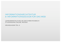 INFORMATIONSARCHITEKTUR & INFORMATIONSDESIGN FÜR DAS WEB LEHRVERANSTALTUNG AN DER DHBW MOSBACH STUDIENGANG ONLINE MEDIEN GRUNDLAGEN TEIL A Informationsarchitektur & Informationsdesign EURE ERWARTUNGEN? INHALTE IM 3. SEMESTER Organisationsformen für Informationen: • Lineare Struktur, Baumstruktur, Netzstruktur, Expandieren, Matrix, Schichtung, Zoomen Navigationsdesign: • Hierarchische Navigation, Contentnavigation, Kontextnavigation, Pfadnavigation, Metanavigation Werkzeuge und Methoden der Designentwicklung: • Wireframes, Moodboards, Style Tiles Trends im Screendesign INHALTE IM 3. SEMESTER Benotung: • Entwicklung & Präsentation des Designs für eine Website (mit Moodboard / Style Tile) Gute Frage WAS MACHT EIN INFORMATIONSARCHITEKT? Folie # 6 Folie # 7 Folie # 8 Folie # 9 Folie # 10 Folie # 11 Definition DATEN, INFORMATION, KOMMUNIKATION DATEN, INFORMATION, KOMMUNIKATION Daten: lat. dare = geben, datum Kommunikation: lat. = das Gegebene communicare = mitteilen • • Angaben ohne Auswahl oder Verknüpfung, reine Zeichenfolge. Beispiel: „Präsentation“, „25. September“ Information: lat. informare = formen, bilden, eine Vorstellung entwerfen • • Bedeutung, übertragenes Wissen (bzgl. Informationsarchitektur) Beispiel: „Die Präsentation findet am 25. September statt.“ • • Mitteilung, Verständigung, Übermittlung von Informationen Verständnis des situativen Kontextes, Codierung und Decodierung von bestimmten sprachlichen oder visuellen Redewendungen, uvm. Beispiel: „Die Präsentation findet am 25. September statt.“ DATEN Inhalte einer Logfile-Datei. Hier werden im Rahmen einer Online-Umfrage die Antworten der Nutzer auf dem Server erfasst. Folie # 14 INFORMATION Tabelle Verdichtung der Daten zu Werten, die sich auf die Fragestellungen und das Antwortraster beziehen. Damit erhalten die „nackten“ Daten Bedeutung. Folie # 15 KOMMUNIKATION Visualisierung Durch Visualisierung werden aus Informationen interpretierbare Darstellungen. Hierbei werden die Daten interpretiert, selektiert und bisweilen auch in den Kontext mit anderen Werten gestellt. Folie # 16 GLEICHGEWICHT HERSTELLEN Anwender Kontext Inhalt Folie # 17 Die Perspektive macht den Unterschied INFORMATIONSRAUM & KONTEXT Folie # 19 Folie # 20 INFORMATIONSRAUM | KONTEXT Um dem Benutzer den Zugang zu Informationen zu geben, müssen die Informationen in einem Informationsraum oder Kontext strukturiert werden. Museum Summe aller Exponate, Grafiken, erklärende Texte, etc., die Bestandteil einer Ausstellung sind. Postleitzahlensuche Summe aller Daten zu PLZ und Ortsnamen, in einer Datenbank. Suchergebnis: Informationen „Information architecture is all about organising content or things, describing them clearly and providing ways for people to get to them.“ Auszug aus: Donna Spencer. „A Practi cal Guide Information Architecture.“ i Books. Folie # 22 INFORMATIONSARCHITEKTUR Die Informationsarchitektur einer Website umfasst • Struktur und Aufbau • Inhalte und Themen • Navigationswege ORGANISATIONSFORMEN FÜR INFORMATION ÜBUNG: ORGANISATIONSFORMEN ▪ Recherchieren Sie zu Ihrer Organisationsform (wird zugewiesen) ▪ Erstellen Sie eine Präsentation, die mind. folgende Punkte umfasst: ▪ Vorteile ▪ Nachteile ▪ Sinnvolle Anwendungsfälle ▪ zwei konkrete Beispiele unterschiedlicher Anwendungsfälle mit Screenshots / Visualisierung / Sitemap darstellen Präsentation aller Ergebnisse am Ende der Übung über Beamer ▪ Abgabe der Präsentation als PDF ▪ Verfügbare Zeit: 60 min | die Übung wird nicht benotet ▪ Von A nach B in nur 3 Klicks NAVIGATION & NAVIGATIONSDESIGN Folie # 27 NAVIGATION Definition: lat. navigare = segeln, fahren; navigator = Schiffer. Allgemein: „Das Zurechtfinden in einem topografischen Raum, um einen gewünschten Ort zu erreichen.“ (Wikipedia) Im virtuellen Raum: Orientierung bei der Bewegung im Informationsraum, bei der explorativen oder gezielten Suche nach Informationen, bei Handlungsabläufen. WELCOME TO THE REAL WORLD Folie # 30 Folie # 31 Folie # 32 Folie # 33 Folie # 34 Folie # 35 Folie # 36 Folie # 37 Folie # 38 Folie # 39 In den Warenkorb In den Warenkorb In den Warenkorb Folie # 40 Folie # 41 Folie # 42 NAVIGATIONSDESIGN Definition: Das visuelle Design der Elemente, die dem User die Orientierung geben, mit der er sich gezielt im Informationsraum bewegen kann. Parameter: • Form • Größe • Position • Farben • Feedback NAVIGATIONSKATEGORIEN IM WEB • • • • • Hierarchische Navigation: Navigieren entlang der Baumstruktur einer Website, ausgehend von der Startseite Contentnavigation: Links im jeweiligen Inhalt Kontextnavigation / kontextsensitive Navigation: Weiterführende Links passend zum jeweiligen Inhalt der Seite. Beispiel: Personalisierte Werbeanzeigen bei Facebook Pfadnavigation: Abbildung der hierarchischen Position der jeweiligen Seite als textlicher Pfad Beispiel Breadcrumb: Home → Item Level 1 → Item Level 2 → ... Metanavigation: Links unabhängig vom jeweiligen Content auf jeder Seite verfügbar. Beispiele: Suche innerhalb der Website, Kontakt, Hilfe, Glossar, Impressum LAYOUTBEREICHE LAYOUTBEREICHE VERTIKALE NAVIGATION Aufklappen tieferer Navigationsebenen innerhalb der ersten Navigationsebene Positiv: Negativ: VERTIKALE NAVIGATION Aufklappen tieferer Navigationsebenen innerhalb der ersten Navigationsebene Positiv: Selbst längere Begriffe finden Platz. Erweiterbarkeit durch vertikales Scrollen. Lange Begriffe über mehrere Ebenen Negativ: Die für den Inhalt zur Verfügung stehende Fläche ist eingeschränkt. HORIZONTALE NAVIGATION Aufklappen tieferer Navigationsebenen als neue Ebene Positiv: Negativ: HORIZONTALE NAVIGATION Aufklappen tieferer Navigationsebenen als neue Ebene Positiv: Übereinander angeordnete Zeilen visualisieren gut das mentale Modell hierarchisch angeordneter Ebenen. Negativ: Erweiterbarkeit eingeschränkt durch begrenzte Breite, lange Navigationsbegriffe nicht möglich, horizontale listenarti