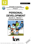12 SENIOR HIGH SCHOOL PERSONAL DEVELOPMENT Quarter 2 – Module 1: Personal Relationships PERSONAL DEVELOPMENT – Grade 11/12 Alternative Delivery Mode Quarter 2 – Module 1: Personal Relationships First Edition, 2020 Republic Act 8293, section 176 states that: No copyright shall subsist in any work of the Government of the Philippines. However, prior approval of the government agency or office wherein the work is created shall be necessary for exploitation of such work for profit. Such agency or office may, among other things, impose as a condition the payment of royalties. Borrowed materials (i.e., songs, stories, poems, pictures, photos, brand names, trademarks, etc.) included in this module are owned by their respective copyright holders. Every effort has been exerted to locate and seek permission to use these materials from their respective copyright owners. The publisher and authors do not represent nor claim ownership over them. Published by the Department of Education Secretary: Leonor Magtolis Briones Undersecretary: Diosdado M. San Antonio Development Team of the Module Writer: Laurice Kathe T. Inso Editors: Leonida S. Wu, EdD, Bethel- Anne S. Parco Reviewers: Leonida S. Wu, EdD; Laurice Kathe T. Inso Layout Artist: Leonida S. Wu, EdD Management Team: Senen Priscillo P. Paulin, CESO V Fay C. Luarez, TM, Ed.D., Ph.D. Rosela R. Abiera Nilita L. Ragay, Ed. D. Maricel S. Rasid Jenith C. Cabajon Elmar L. Cabrera Printed in the Philippines by ________________________ Department of Education –Region VII Schools Division of Negros Oriental Office Address: Tele #: E-mail Address: Kagawasan, Ave., Daro, Dumaguete City, Negros Oriental (035) 225 2376 / 541 1117 negros.oriental@deped.gov.ph 12 PERSONAL DEVELOPMENT Quarter 2 – Module 1: Personal Relationships Introductory Message For the facilitator: Welcome to the Personal Development 11/12 Alternative Delivery Mode (ADM) Module on Personal Relationships! This module was collaboratively designed, developed and reviewed by educators both from public and private institutions to assist you, the teacher or facilitator in helping the learners meet the standards set by the K to 12 Curriculum while overcoming their personal, social, and economic constraints in schooling. This learning resource hopes to engage the learners into guided and independent learning activities at their own pace and time. Furthermore, this also aims to help learners acquire the needed 21st century skills while taking into consideration their needs and circumstances. In addition to the material in the main text, you will also see this box in the body of the module: Notes to the Teacher This contains helpful tips or strategies that will help you in guiding the learners. As a facilitator, you are expected to orient the learners on how to use this module. You also need to keep track of the learners' progress while allowing them to manage their own learning. Furthermore, you are expected to encourage and assist the learners as they do the tasks included in the module. ii For the learner: Welcome to the Personal Development 11/12 Alternative Delivery Mode (ADM) Module on Personal Relationships! This module was designed to provide you with fun and meaningful opportunities for guided and independent learning at your own pace and time. You will be enabled to process the contents of the learning resource while being an active learner. This module has the following parts and corresponding icons: What I Need to Know What I Know This will give you an idea of the skills or competencies you are expected to learn in the module. This part includes an activity that aims to check what you already know about the lesson to take. If you get all the answers correct (100%), you may decide to skip this module. What’s In This is a brief drill or review to help you link the current lesson with the previous one. What’s New In this portion, the new lesson will be introduced to you in various ways; a story, a song, a poem, a problem opener, an activity or a situation. What is It This section provides a brief discussion of the lesson. This aims to help you discover and understand new concepts and skills. What’s More This comprises activities for independent practice to solidify your understanding and skills of the topic. You may check the answers to the exercises using the Answer Key at the end of the module. What I Have Learned This includes questions or blank sentence/paragraph to be filled in to process what you learned from the lesson. What I Can Do This section provides an activity which will help you transfer your new knowledge or skill into real life situations or concerns. iii Assessment This is a task which aims to evaluate your level of mastery in achieving the learning competency. Additional Activities In this portion, another activity will be given to you to enrich your knowledge or skill of the lesson learned. Answer Key This contains answers to all activities in the module. At the end of this module you will also find: References This is a list of all sources used in developing this module. The following are some reminders in using this module: 1. Use the module with care. Do not put unnecessary mark/s on any part of the module. Use a separate sheet of paper in answering the exercises. 2. Don’t forget to answer What I Know before moving on to the other activities included in the module. 3. Read the instruction carefully before doing each task. 4. Observe honesty and integrity in doing the tasks and checking your answers. 5. Finish the task at hand before proceeding to the next. 6. Return this module to your teacher/facilitator once you are through with it. If you encounter any difficulty in answering the tasks in this module, do not hesitate to consult your teacher or facilitator. Always bear in mind that you are not alone. We hope that through this material, you will experience meaningful learning and gain deep understanding of the relevant competencies. You can do it! iv T