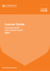 Learner Guide Cambridge IGCSE® First Language English 0500 Cambridge Secondary 2 Cambridge International Examinations retains the copyright on all its publications. Registered Centres are permitted to copy material from this booklet for their own internal use. However, we cannot give permission to Centres to photocopy any material that is acknowledged to a third party even for internal use within a Centre. ® IGCSE is the registered trademark of Cambridge International Examinations. © Cambridge International Examinations 2013 Contents How to use this guide ..................................................................................................... 3 Section 1: How will you be tested? ..................................................................................... 5 Section 2: Examination tips ................................................................................................. 7 General advice Reading Paper 1 (Core) Reading Paper 2 (Extended) Writing and Composition Paper 3 (Core and Extended) Argumentative/Discursive compositions Descriptive compositions Narrative compositions Section 3: What will be tested? ......................................................................................... 17 Section 4: What you need to do ........................................................................................ 21 Section 5: Revision ............................................................................................................ 25 5.1 Reading 5.2 Writing 2 Cambridge IGCSE First Language English v0.7 How to use this guide How to use this guide The guide describes what you need to know about your IGCSE First Language English examination. It will help you to plan your revision programme for the examinations and will explain what we are looking for in your answers. It can also be used to help you to revise by using the tick boxes in Section 4, ‘What you need to do’, to check what you have covered. The guide contains the following sections: Section 1: How will you be tested? This section gives you information about the different examination papers you will take. Section 2: Examination tips This section gives you advice to help you do as well as you can. Some of the tips are general advice and some are based on the common mistakes that learners make in exams. Section 3: What will be tested? This section describes the areas of knowledge, understanding and skills that we will test you on. Section 4: What you need to do This section shows the syllabus in a simple way so that you can check that: • You have practised each skill • You can understand and respond, in English, in a variety of contexts and situations. • You are well prepared for the level of examination (Core or Extended) you will be taking. Section 5: Revision This section gives advice on how you can revise and prepare for the examination. Cambridge IGCSE First Language English v0.7 3 4 Cambridge IGCSE First Language English v0.7 Section 1: How will you be tested? Section 1: How will you be tested? There are up to three components to your IGCSE course: 1. A final examination Paper 1 Reading Passage (Core) OR Paper 2 Reading Passages (Extended) 2. A further examination Paper 3 Directed Writing and Composition OR you will submit a Coursework portfolio Component 4 3. PLUS You may take EITHER a Speaking and Listening test (Component 5) OR Speaking and Listening coursework (Component 6). Your teacher will assess your skills during the IGCSE course and will discuss with you which papers and which level of examination (Core or Extended) you should take for your version of the syllabus. Extended gives grades A* to E; Core gives grades C to G. Check with your teacher if you are unsure which components you are taking. Paper title and level of examination How long and how many marks? What’s in the Paper? Which skills are being tested? What’s the % of the total syllabus grade? Paper 1 Reading Passage (Core) 1 hour 45 minutes 50 marks Questions 1 and 2 – Reading Question 2 – Writing 50% Paper 2 Reading Passages (Extended) 2 hours 50 marks Questions 1, 2 and 3 – Reading Questions 1 and 3 – Writing 50% Paper 3 Directed Writing and Composition (Core and Extended) 2 hours 50 marks Section 1 – Reading and Writing Section 2 – Writing 50% Component 4 Coursework Portfolio (Core and Extended) n/a 50 marks 3 Assignments: informative, analytical and/or argumentative; imaginative, descriptive and/or narrative; response to a text 50% In addition, you may EITHER take an optional Speaking and Listening test OR Speaking and Listening coursework. Cambridge IGCSE First Language English v0.7 5 Section 1: How will you be tested? Paper number and level of examination How long and how many marks? What’s in the Paper? Which skills are being tested? What’s the % of the total examination? Component 5 Speaking and Listening Test (Core and Extended) 10 minutes 30 marks Part 1 – Individual Task Part 2 – Discussion An additional reported level Component 6 Speaking and Listening Coursework (Core and Extended) n/a 30 marks Task 1 – Individual Task Task 2 – Pair-based Activity Task 3 – Group Activity An additional reported level For some versions of the syllabus the Speaking and Listening Components count towards the final grade as 20% making the other two components 40% each. For other versions of the syllabus Speaking and Listening does not contribute to your overall result, and is marked as a separate examination, for which you will be given a separate result as a level 1 to 5. You should check with your teacher whether you will be taking Component 5 or 6 and whether Speaking and Listening is separate for you or included in your overall mark. 6 Cambridge IGCSE First Language English v0.7 Section 2: Examination tips Section 2: Examination tips This section gives you advice to help you do as well as you can. Some of the tips are general advice and some are based on the common mistakes that le