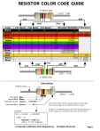 RESISTOR COLOR CODE GUIDE 4- Band Code 1.0 KΩ + -5% 1st 4th 2nd Color Black Brown Red Orange Yellow Green Blue Violet Gray White Gold Silver None 1st Band 0 1 2 3 4 5 6 7 8 9 2nd Band 0 1 2 3 4 5 6 7 8 9 1st 3rd Decimal Multiplier Tolerance 1 1 + 10 1% 10 + 100 2% 100 1,000 1K 10K 10,000 100K 100,000 1,000,000 1M 10,000,000 10M 100,000,000 1,000,000,000 + 0.1 5% + 0.01 - 10 % + - 20 % 3rd Band 0 1 2 3 4 5 6 7 8 9 3rd 2nd 4th 5th 254 Ω + -1 % 5- Band Code Calculation Resistor Lead First Band Red Second Band Black Multiplier Band Yellow Tolerance Band Silver Left 2 0 x10,000 10 % Right 200 KΩ + - 10 % The Gold or Silver band is always placed to the right. The resistor value is read from the left to right. If there is no tolerance band, then find the side that has a band closest to a lead and make that the first band. Equation 2 0 x 10,000 = 200,000 1,000 = 1K Resistor = 200 K with a + - 10 % Tolerance © Copyright 2006 Blue Point Engineering All Rights Reserved Page 1 Quick Guide Color Black Brown Red Orange Yellow Green Blue Violet Gray White Gold (G) Silver (s) None Band 3 Gold Silver Value 0 1 2 3 4 5 6 7 8 9 + - 5% + - 10 % + - 20 % Divide by 1 100 Tolerance Brown + 1% + 2% Red + Gold 5% + Silver - 10 % + None - 20 % Resistor Color Code 4 Band Resistance Notation Band 1 Band 2 Band 3 Tolerance .22 ohm .27 ohm R22 R27 Red Red Purple Silver Silver S,G,R,B .33 ohm R33 R39 Red Orange Orange Orange White Silver Silver S,G,R,B S,G,R,B R47 Yellow Purple Silver S,G,R,B .56 ohm R56 Green .82 ohm Blue Gray Silver Silver S,G,R,B R68 R82 Blue Gray .68 ohm Silver S,G,R,B 1.0 ohm 1R0 Brown Red Black Gold S,G,R,B 1.1 ohm 1R1 Brown Brown Gold S,G,R,B 1.2 ohm 1R2 Brown Red Gold S,G,R,B 1.3 ohm 1R3 Brown Orange Gold S,G,R,B 1.5 ohm 1R5 Brown Green Gold S,G,R,B 1.6 ohm 1R6 Brown 1R8 2R0 Brown Red 2.2 ohm 2R2 Red Black Red Gold Gold Gold S,G,R,B 1.8 ohm 2.0 ohm Blue Gray Gold S,G,R,B 2.4 ohm 2R2 Red Yellow Gold S,G,R,B 2.7 ohm 3.0 ohm 2R7 Purple Gold S,G,R,B 3R0 Red Orange Black Gold S,G,R,B 3.3 ohm 3R3 Orange Orange Gold S,G,R,B 3.6 ohm 3R6 Orange Blue Gold S,G,R,B 3.9 ohm 3R9 Orange White Gold S,G,R,B 4.3 ohm 4R3 Yellow 4R7 Yellow Green Gold Gold S,G,R,B 4.7 ohm Orange Purple Brown Gold S,G,R,B Green Blue Blue Red Gold Gold S,G,R,B S,G,R,B .39 ohm .47 ohm S,G,R,B S,G,R,B S,G,R,B S,G,R,B S,G,R,B 5.1 ohm 5.6 ohm 6.2 ohm 5R1 5R6 6R2 6.8 ohm 6R8 7R5 Blue Purple Gray Gold S,G,R,B Green Gold S,G,R,B 8R2 Gray Red Gold S,G,R,B 9.1 ohm 9R1 White Brown Gold S,G,R,B 10 ohm 10R Brown 11R Brown Black Black S,G,R,B 11 ohm Black Brown 12 ohm 13 ohm 12R 13R Brown Brown Red Orange Black S,G,R,B Black S,G,R,B 15 ohm 15R Brown Green Black S,G,R,B 16 ohm 16R Brown Blue Black S,G,R,B 18 ohm 20 ohm 22 ohm 18R 20R Gray Black Black Black S,G,R,B S,G,R,B 22R Brown Red Red Red Black S,G,R,B 24 ohm 24R Red Yellow Black S,G,R,B 27 ohm 27R Red Purple Black S,G,R,B 7.5 ohm 8.2 ohm © Copyright 2006 Blue Point Engineering S,G,R,B All Rights Reserved Page 2 Quick Guide Color Black Brown Red Orange Yellow Green Blue Violet Gray White Gold (G) Silver (s) None Band 3 Gold Silver Value 0 1 2 3 4 5 6 7 8 9 + 5% + - 10 % + - 20 % Divide by 10 100 Tolerance Brown + 1% + 2% Red + Gold 5% + Silver - 10 % + None - 20 % Resistor Color Code 4 Band 30 ohm 30R Orange Orange Black Orange Black S,G,R,B 33 ohm 33R Black S,G,R,B 36 ohm 39 ohm 43 ohm 36R 39R 43R Orange Orange Blue Black S,G,R,B White Orange Black Black S,G,R,B 47 ohm 51 ohm 47R Yellow Green Purple Black S,G,R,B Brown Black S,G,R,B Green Blue Black S,G,R,B Black S,G,R,B Black S,G,R,B Yellow S,G,R,B 56 ohm 51R 56R 62 ohm 62R Blue 68 ohm 68R Blue Red Gray 75 ohm 82 ohm 75R Purple Green Black S,G,R,B 82R 91R Gray Red Brown Black S,G,R,B S,G,R,B Black Black Brown 91 ohm 100 ohm 100R White Brown 110 ohm 110R Brown Brown Brown S,G,R,B 120 ohm 120R Brown Brown S,G,R,B 130 ohm 150 ohm 130R Brown Red Orange Brown S,G,R,B 150R Brown Green Brown S,G,R,B 160 ohm 160R Brown Blue Brown S,G,R,B 180 ohm 180R Brown Gray Brown S,G,R,B 200 ohm 200R Red Black S,G,R,B 220 ohm 220R Red Red Brown Brown 240 ohm 270 ohm 240R Yellow Purple Brown Brown S,G,R,B 270R Red Red 300 ohm 300R Orange Black Brown S,G,R,B 330 ohm 360 ohm 330R 360R Orange Orange Brown S,G,R,B Orange Blue Brown S,G,R,B 390 ohm 390R Orange Brown S,G,R,B 430 ohm Yellow Brown S,G,R,B 470 ohm 430R 470R White Orange Yellow Purple Brown S,G,R,B 510 ohm 510R Green Brown Brown S,G,R,B 560 ohm Green Blue Brown S,G,R,B 620 ohm 560R 620R Blue Red Brown S,G,R,B 680 ohm 680R Blue Gray Brown S,G,R,B 750 ohm 750R Purple Green Brown S,G,R,B 820 ohm 820R Gray Red Brown S,G,R,B 910 ohm 1.0 k 910R 1K0 White Brown Brown S,G,R,B Brown Black Red S,G,R,B 1.1 k 1K1 Brown Brown Red S,G,R,B 1.2 k 1K2 Brown Red Red S,G,R,B 1.3 k 1K3 Brown Orange Red S,G,R,B 1.5 k 1K5 Brown Green Red S,G,R,B 1.6 k 1K6 Brown Blue Red S,G,R,B 1.8 k 1K8 Brown Gray Red S,G,R,B © Copyright 2006 Blue Point Engineering S,G,R,B S,G,R,B S,G,R,B All Rights Reserved Page 3 Quick Guide Color Black Brown Red Orange Yellow Green Blue Violet Gray White Gold (G) Silver (s) None Band 3 Gold Silver Value 0 1 2 3 4 5 6 7 8 9 + 5% + 10 % + - 20 % Divide by 10 100 Tolerance Brown + 1% + 2% Red + Gold 5% + Silver - 10 % + None - 20 % Resistor Color Code 4 Band 2.0 k 2K0 2.2 k 2K2 Red Red Black Red S,G,R,B Red Yellow Red S,G,R,B 2.4 k 2K4 Red S,G,R,B Purple Red Red 2.7 k 2K7 3.0 k 3.3 k 3K0 3K3 Red Orange Black Red S,G,R,B Orange Orange Red S,G,R,B 3.6 k 3.9 k 3K6 3K9 Orange Orange Blue Red Red S,G,R,B S,G,R,B 4.3 k 4K3 Yellow Red S,G,R,B 4.7 k 4K7 Red S,G,R,B 5.1 k 5K1 Yellow Green Orange Purple Brown S,G,R,B 5.6 k 5K6 Green Blue Red Red 6.2 k 6K2 S,G,R,B 6K8 Red Gray Red 6.8 k Blue Blue Red S,G,R,B 7.5 k 7K5 Purple Green S,G,R,B 8.2 k 8K2 Gray Red Red Red 9.1 k 9K1 White Brown Red S,G,R,B 10 k 11 k 10K 11K Brown Black Orange S,G,R,B Brown Brown Orange S,G,R,B 12 k 12K Brown Red Orange S,G,R,B 13 k 13K Brown Orange Orange S,G,R,B 15 k 16 k 15K 16K Brown Orange S,G,R,B 18 k 20 k 18K 20K Brown Brown Green 