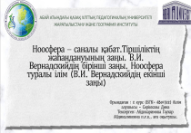 ТАҚЫРЫП МАҚСАТЫ: НООСФЕРА ТУРАЛЫ МӘЛІМЕТТЕР БЕРЕ ОТЫРЫП ,ОНЫҢ ҰҒЫМЫН АШУ • Тақырып міндеттері: • Ноосфераға сипаттама беру; • Ноомфераның зерттеу саласын анықтау; • Саналы қабаттың даму кезеңдерін анықтау; • Экологиялық мәселелерді көрсету ЖОСПАР • Кіріспе • Ноосфера • Негізгі бөлім • Ноосфераның пайда болуы мен деңгейлері • Вернадский.Ноосфера туралы • Нанотехнологиялар • Қазақстандағы ноосфера ғылымдарының дамуы • Корытынды НООСФЕРА • Ноосферология (ноосфера және логия) — ноосфера және оның пайда болуы туралы ғылым. Ноосферологияға жаратылыс, қоғамдық немесе техникалық білім салаларының көптеген тараулары кіреді. https://images.app.goo.gl/YBLhXotz7kmghQxW8 НООСФЕРА • Ноосфера – ақыл-ой сферасы деген түсінікті алғаш 1927 жылы француз ғалымдары Э.Леруа (1870 – 1954) мен Тейяр де Шарден Пьер (1881 – 1955) енгізген. XX ғасырдың 30 – 40-жылдары ноосфераны материалистік тұрғыдан сипаттап жазған В.И. Вернадский болды. Ол ноосфераны биосфера мен қоғамның өзара қарым-қатынасынан туындайтын тіршіліктің жаңа формасы, бұл саналы, ақыл-ойы жетілген адамзаттың бағыттауымен қалыптасатын биосфераның жаңа эволюциялық жағдайы деп түсіндірді. Ноосфера – табиғат заңдылықтарының қоғамның ойлау заңдарымен және әлеуметтікэкономкалық заңдылықтармен тығыз байланысып жататын біртұтастығын (бүтіндігін) басқарушы жоғарғы тип. Ғылыми-техникалық прогрестің қарқынды дамуы бұрын игерілмеген жерлерді игеріп, бұрын пайдаланылмай келген табиғат байлықтарын пайдаға асырып қоймай, ғарыш кеңістігін, ғаламшарларды игеруге, ядролық қарулар жасауға мүмкіндік берді. https://images.app.goo.gl/cEDJcmm2uFAcciGu5 Тейяр де Шарден https://images.app.goo.gl/5iGaGLFGdv87bMVg9 Эдуар Луи Эмманюэль Жюльен Ле Руа НООСФЕРА ДАМУЫНЫҢ АЛҒЫШАРТТАРЫ • Адамзаттың бірлігі; • * Байланыс және алмасу құралдарын түрлендіру (қазірдің өзінде құрылды); • * Жаңа энергия көздерін ашу (атомдық энергия); • * Адамдардың әл-ауқатының көтерілуі (Жер ресурстары және тамақтану); • * Барлық адамдардың теңдігі (нәсілшілдіктің болмауы және нацизм); • * Қоғам өмірінен соғыстарды алып тастау. НООСФЕРАНЫҢ ПАЙДА БОЛУЫ МЕН ДАМУЫ • Жер ғаламшарындағы органикалық дүние эволюциясының бірнеше кезеңдерін ажыратады. • Бірінші кезең — заттардың биологиялық айналымы пайда болып, биосфераның қалыптаса бастауы. • Екінші кезең — тіршіліктің күрделене түсіп, көп жасушалы организмдердің пайда болуы. Бұл екі кезеңді ғылымда биогенез, яғни тіршіліктің толық мәнінде пайда болу кезеңі деп атайды. • Биосфера эволюциясының үшінші кезеңі — адам қоғамының пайда болуымен ерекшеленеді НООСФЕРА КЕЗЕҢІ • Биосфера эволюциясының келесі жаңа кезеңі — қазіргі деңгейі. Мұны ғылымда ноосфера кезеңі деп атайды. Грекше "noos" ақыл-ой, сана, "sphaira" — шар деген ұғымды білдіріп, "саналы қабық" деп аталады. Ноосфера — адамның санасы, ақыл-ойы шешуші рөл атқаратын биосфераның жаңа эволюциялық деңгейі. • Ноосфера ұғымын ғылымға 1927 жылы француз ғалымдары Э.Лepya мен П.Тейяр де Шарден енгізді. Олардың ұғымы бойынша ноосфера биосферадан да жоғары деңгейдегі, бүкіл ғаламшарды қамтитын "ойлау қабығы". https://www.google.com/imgres?imgurl=https%3A%2F%2Finance.ru%2Fwpcontent%2Fuploads%2F2017%2F06%2Fpublic-noosfera.jpg&tbnid=VxRHuJb0u6A8M&vet=1&imgrefurl=https%3A%2F%2Finance.ru%2F2017%2F06%2Fnoosfera%2F&docid=tfy YEvRzjCtUtM&w=1200&h=674&source=sh%2Fx%2Fim%2Fm1%2F2 ВЕРНАДСКИЙ.НООСФЕРА ТУРАЛЫ • 1930—1940 жылдары В.И. Вернадский ноосфера туралы ілімді дамытып, терендете түсіндірді. Ол ноосфераны биосфера эволюц