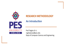 OBJECT (OOMD)ORIENTED MODELLING & DESIGN RESEARCH METHODOLOGY An Introduction Prof. Raghu B. A. raghubarao@pes.edu Dept of Computer Science and Engineering RESEARCH METHODOLOGY An Introduction Objectives 1)Meaning of Research 2)Objectives of Research 3)Motivation in Research 4)Types of Research 5)Research Approaches 6)Significance of Research 7)Research Methods versus Methodology 8)Research and Scientific Method 9)Importance of Knowing How Research is Done 10)Research Process 11)Criteria of Good Research 12)Problems Encountered by Researchers in India (Self Study) RESEARCH METHODOLOGY : An Introduction Meaning of Research ● Research is composed of two terms combined: ○ a prefix re ○ a verb search ● Re means again, a new, over again ● Search means to examine closely and carefully, to test and try, to probe ● The two words form a noun to describe a careful and systematic study in some field of knowledge, undertaken to establish facts or principles. ● Research is an organized and systematic way of finding answers to questions RESEARCH METHODOLOGY : An Introduction Meaning of Research ● A careful investigation or inquiry specially through search for new facts in any branch of knowledge ● Redman and Mory define research as a “systematized effort to gain new knowledge.” ● A movement from the known to the unknown ● It is voyage of discovery RESEARCH METHODOLOGY : An Introduction Meaning of Research ● 1) 2) 3) 4) 5) Clifford Woody Defining and redefining problems, formulating hypothesis or suggested solutions; collecting, organising and evaluating data; making deductions and reaching conclusions; carefully testing the conclusions to determine whether they fit the formulating hypothesis. ● D. Slesinger and M. Stephenson in the Encyclopaedia of Social Sciences ● “The manipulation of things, concepts or symbols for the purpose of generalising to extend, correct or verify knowledge, whether that knowledge aids in construction of theory or in the practice of an art.” RESEARCH METHODOLOGY : An Introduction Objectives of Research ● To gain familiarity with a phenomenon or to achieve new insights into it. ● To portray accurately the characteristics of a particular individual, situation or a group. ● To determine the frequency with which something occurs or with which it is associated with something else. ● To test a hypothesis of a causal relationship between variables. RESEARCH METHODOLOGY : An Introduction Motivation for Research 1) Desire to get a research degree along with its consequential benefits; 2) Desire to face the challenge in solving the unsolved problems, i.e., concern over practical problems initiates research; 3) Desire to get intellectual joy of doing some creative work; 4) Desire to be of service to society; 5) Desire to get respectability RESEARCH METHODOLOGY : An Introduction Types of Research 1) 2) 3) 4) Descriptive vs Analytical Applied vs Fundamental Quantitative vs Qualitative Conceptual vs Empirical RESEARCH METHODOLOGY : An Introduction 1) Descriptive Research Vs Analytical Research Major purpose of descriptive research is description of the state of affairs as it exists at present (ex post facto Research) Characteristic: The researcher has no control over the variables - he can only report what has happened, or what is happening; e.g.: frequency of shopping, preferences of people Methods used: Comparative and Correlation. In analytical research, the researcher has to use facts or information already available and analyze these to make a critical evaluation of the material. RESEARCH METHODOLOGY : An Introduction 2) Applied Vs Fundamental Research Applied Research Immediate problem facing a society or an industrial business organization aimed at conclusions Example : Market research, design, safety, health, pollution, societal, environmental, industrial, pharmaceutical, etc. Fundamental Research Mainly concerned with generalizations and with the formulation of a theory RESEARCH METHODOLOGY : An Introduction 3) Quantitative Vs Qualitative Research Quantitative Research ● ● ● ● Based on the measurement of quantity or amount Controlled, rather easy to carry-out Objective and repeatable Easy to draw conclusions and decisions Qualitative Research ● is concerned with qualitative phenomenon, i.e., involving quality or kind ● aim is to discover the underlying motives of human behaviour; attitude or opinion research (how people feel or think about a particular subject or institution). ● difficult job; should seek guidance from experimental psychologists. RESEARCH METHODOLOGY : An Introduction 4) Conceptual Vs Empirical Research Conceptual Research ● Related to some abstract idea(s) or theory; generally used by philosophers and thinkers to develop new concepts or to re-interpret existing ones Empirical Research ● Relies on experience or observation alone, without due regard for system and theory. It is data-based research, coming up with conclusions which are capable of being verified by observation or experiment. ● Characterised by the experimenter's control over the variables under study and his deliberate manipulation of one of them to study its effects. Evidence gathered through experiments or empirical studies is today considered to be the most powerful support possible for a given hypothesis. RESEARCH METHODOLOGY : An Introduction Other Types of Research 1. One Time Research 2. Longitudinal Research 3. Field Research 4. Laboratory Research 5. Simulation Research 6. Clinical Research 7. Diagnostic Research 8. Exploratory Research 9. Historical Research 10.Conclusion Oriented Research 11.Decision Oriented Research 12.Operation Research RESEARCH METHODOLOGY : An Introduction Research Method Vs Methodology Method – Technique / method adopted to conduct Research. Can be put in 3 groups● Data Collection Methods ● Statistical Techniques – establish relationships between data and unknowns ● Evaluation Methods for accu