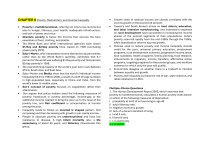 CHAPTER 6 Poverty, Malnutrition, and Income Inequality • • • • • • • • • • • • Poverty is multidimensional, referring not only to low income but also to hunger, illiteracy, poor health, inadequate infrastructure, and lack of power and voice Absolute poverty is below the income that secures the bare essentials of food, clothing, and shelter. The World Bank and other international agencies have drawn $1/day and $2/day poverty lines, based on 1985 purchasing power parity (PPP). Sala-i-Martin, who interpolates income distribution by percentiles rather than by the World Bank’s quintiles, estimates that 6.7 percent of the world was suffering $1/day poverty and 18.6 percent $2/day poverty in 1998. The overwhelming majority of the world’s poor live in sub-Saharan Africa, South Asia, and East Asia. Sala-i-Martin and Bhalla show that the world’s individual income inequality fell from 1980 to 2000, a result of a shift of large numbers in high-populated Asia, especially in China and India, from the world’s lower to middle class. Sen's concept of poverty focuses on capabilities rather than attainments. Sen argues that policy makers need the following measures of poverty: headcount or poverty percentage, income-gap or the additional income needed to bring the poor up to the level of the poverty line, and Gini coefficient or concentration of income among the poor. Inequality tends to follow an inverted U shaped pattern, first increasing and then decreasing with growth in per capita income. People in absolute poverty are undernourished and have low resistance to disease. A high infant mortality rate, a life expectancy of about 45 years, and illiteracy characterize this group. • • • Growth rates of national income are closely correlated with the income growth of the poorest 20 percent. Taiwan's and South Korea's stress on land reform, education, and labor intensive manufacturing, and Indonesia's emphasis on rural development have succeeded in increasing the income shares of the poorest segments of their populations. India’s poverty rates fell rapidly from the mid-1980s through the 1990s, when liberalization reforms spurred growth. Policies used to reduce poverty and income inequality include credit for the poor, universal primary education, employment programs, rural development schemes, progressive income taxes, food subsidies, health programs, family planning, food research, inducements to migration, income transfers, affirmative action programs, targeting programs for the poorest groups, and workfare schemes for which only the poor will qualify. Economists disagree on whether there is a tradeoff or interlink between equality and growth. Poverty and inequality increase the risk of war, state violence, and rebel resistance in LDCs. Multiple-Choice Questions 1. The Human Development Report 2003, which assumes that poverty is multidimensional, calculates a human poverty index based on which of the following measures of deprivation: I probability at birth of not surviving to age 40. II adult illiteracy rate. III negative economic growth. IV lack of a decent standard of living. a. I and II only b. III and IV only c. I, II and III only d. I, II and IV. 2. According to Human Development Report 2003, about_______ countries were poorer in 2003 than in 1990. a. 50. b. 100. c. 1000. d. 5. 3. _____________is below the income that secures the bare essentials of food, clothing, and shelter. a. Income inequality. b. Absolute poverty. c. Sen’s poverty index. d. Purchasing-power poverty. 4. Sen's welfare theory relies on a. individuals' accomplishments. b. individuals' capabilities. c. individuals' wealth. d. individuals' education. 5. Indices of income distribution measure a. absolute poverty. b. economic growth. c. relative poverty. d. standard of living. 6. Income inequalities are often shown on a a. production possibility curve. b. marginal inequality curve. c. Sen curve. d. Lorenz curve. 7. A value of 1 in Gini index represents a. low inequality. b. maximum inequality. c. 10/10, 000% inequality. d. 1% inequality. 8. The elasticity of propoor growth is a. the percentage increase in the consumption growth of the poor divided by percentage increase in the consumption growth of the nonpoor. b. the percentage increase in the poor times percentage increase in the nonpoor. c. the percentage increase in the poverty of the poor divided by percentage increase in the poverty of the nonpoor. d. the percentage increase in the poor people in the urban divided by percentage increase in the nonpoor in the urban. 9. In 2003, the UN Development Program estimated that a 1-percent LDC per capita consumption growth, with income inequality unchanging, would reduce the poverty percentage by _________ percent yearly. a. 0. b. 2. c. 6. d. 0.5. 11. Which of the following statements are true about income inequality in developed and developing countries. I 27 percent of the developing countries have low inequality. II The majority of developed (high-income) countries have high income inequality. III The income shares of the poor are lower and their variance higher in DCs than in LDCs. a. I only b. II only c. I and II only d. I, II and III 12. The Lorenz curve shows a. patterns of poverty between developed and developing countries. b. the change in GDP per capita over time. c. the poorest’s income shares fall in the early stages of growth. d. income concentration relative to a 45-degree line. 13. “Peer borrowing groups of five or so people with joint liability approve loans to other members as a substitute for the bank's screening process”. The above statement applies to a. Indonesia's Badan Kredit Kecamatan (BKK). b. the Association for Development of Microenterprise. c. Bangladesh’s Grameen Bank. d. the Enterprise Credit Program in Kolkata. 14. Sala-i-Martin interpolates income distribution by a. quintiles. b. percentiles. c. simulation. d. relative ratio measures. • • • • • • 