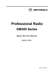 Professional Radio GM300 Series Basic Service Manual 68P64115B51 Issue: July 2000 ii Computer Software Copyrights The Motorola products described in this manual may include copyrighted Motorola computer programs stored in semiconductor memories or other media. Laws in the United States and other countries preserve for Motorola certain exclusive rights for copyrighted computer programs, including the exclusive right to copy or reproduce in any form, the copyrighted computer program. Accordingly, any copyrighted Motorola computer programs contained in the Motorola products described in this manual may not be copied or reproduced in any manner without the express written permission of Motorola. Furthermore, the purchase of Motorola products shall not be deemed to grant, either directly or by implication, estoppel or otherwise, any license under the copyrights, patents or patent applications of Motorola, except for the normal non-exclusive royalty-free license to use that arises by operation of law in the sale of a product. iii SAFETY INFORMATION Read this information before using your radio. SAFE AND EFFICIENT OPERATION OF MOTOROLA TWO-WAY RADIOS This document provides information and instructions for the safe and efficient operation of Motorola Portable and Mobile Two-Way Radios. The information provided in this document supersedes the general safety information contained in user guides published prior to 1 January 1998. For information regarding radio use in hazardous areas, please refer to the Factory Mutual (FM) approval manual supplement. EXPOSURE TO RADIO FREQUENCY ENERGY Your Motorola Two-Way Radio, which generates and radiates radio frequency (RF) electromagnetic energy (EME), is designed to comply with the following National and International Standards and Guidelines regarding exposure of human beings to radio frequency electromagnetic energy: Federal Communications Commission Report and Order No. FCC 96-326 (August 1996) American National Standards Institute (C95.1 - 1992) National Council on Radiation Protection and Measurements (NCRP-1986) International Commission on Non-Ionizing Radiation Protection (ICNRP- 1986) European Committee for Electrotechnical Standardization (CENELEC): ENV 50166-1 1995 E Human exposure to electromagnetic fields Low frequency (0 Hz to 10 kHz) - ENV 50166-2 1995 E Human exposure to electromagnetic fields High frequency (10 kHz to 300 GHz) - Proceedings of SC211/B 1996 “Safety Considerations for Human Exposure to EMFs from Mobile Telecommunication Equipment (MTE) in the Frequency Range 30MHz - 6 GHz.” (EMF - Electro-Magnetic Fields) To assure optimal radio performance and to ensure that your exposure to radio frequency electromagnetic energy is within the guidelines in the above standards, always adhere to the following procedures: ELECTROMAGNETIC INTERFERENCE/COMPATIBILITY NOTE Nearly every electronic device is susceptible to electromagnetic interference (EMI) if inadequately shielded, designed, or alternately configured for electromagnetic compatibility. To avoid electromagnetic interference and/or compatibility conflicts, turn off your radio in any facility where posted notices instruct you to do so. Hospital or health facilities may be using equipment that is sensitive to external RF energy. When instructed to do so, turn off your radio when on board an aircraft. Any use of a radio must be in accordance with airline regulations or crew instructions. Mobile Radio Operation and EME Exposure To assure optimal radio performance and that human exposure to radio frequency electromagnetic energy is within the guidelines referenced in this document, transmit only when people inside and outside the vehicle are at least the minimum distance away from a properly installed, externally-mounted antenna. iv The table below lists the minimum distance for several different ranges of rated radio power. Table 1 Rated Power and Distance Rated Power of Vehicle-Installed Mobile Two-Way Radio Minimum Distance from Transmitting Antenna 7 to 15 Watts 30.5 cm (1 Foot) 16 to 50 Watts 61 cm (2 Feet) More than 50 Watts 91.5 cm (3 Feet) Mobile Antenna Installation Install the vehicle antenna external to the vehicle and in accordance with: a. The requirements of the antenna manufacturer/supplier b. Instructions in the radio installation manual. Control Station Operation When radio equipment is used to operate as a control station, it is important that the antenna be installed outside the building and away from places where people may be in close proximity. NOTE Refer to Table 1 for rated power and minimum distance values for transmitting antennas. OPERATIONAL WARNINGS Potentially explosive atmospheres ! WARNING: Turn off your Two-Way radio when you are in any area with a potentially explosive atmosphere, unless it is a radio type especially qualified for use in such areas. Sparks in a potentially explosive atmosphere can cause an explosion or fire resulting in bodily injury or even death. Blasting caps and areas ! NOTE WARNING: To avoid possible interference with blasting operations, turn off your radio when you are near electrical blasting caps. In a “blasting area” or in areas posted “turn off twoway radio”, obey all signs and instructions. The areas with potentially explosive atmospheres referred to above include fuelling areas such as: below decks on boats; fuel or chemical transfer or storage facilities; areas where the air contains chemicals or particles, such as grain, dust or metal powders; and any other area where you would normally be advised to turn off your vehicle engine. Areas with potentially explosive atmospheres are often but not always posted. v Table of Contents SAFETY INFORMATION........................................................................................iii Chapter 1 INTRODUCTION 1.0 Scope of Manual ..................................................................................................1-1 2.0 Warranty and Service Support......