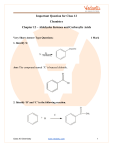 Important Question for Class 12 Chemistry Chapter 12 – Aldehydes Ketones and Carboxylic Acids Very Short Answer Type Questions: 1 Mark 1. Identify X: Ans: The compound named ‘X’ is benzoyl chloride. 2. Identify ‘B’ and ‘C’ in the following reaction. Class XII Chemistry www.vedantu.com 1 Ans: The following reaction shows the conversion of benzene to acetophenone. The compound ‘B’ is acetyl chloride (CH3COCl) and the compound ‘C’ is anhydrous aluminium chloride (AlCl3 ) . 3. Arrange the following compounds in the increasing order of their boiling points: CH3CH2CH2CH3 , CH3OCH2CH3 , CH3CH 2CHO, CH3COCH3 , CH3CH 2CH2OH Ans: The increasing order of boiling points in the compounds is: CH3CH2CH2CH3 CH3OCH2CH3 CH3COCH3 CH3CH2CHO CH3CH2CH2OH 4. Propanal is more reactive than propanone. Give reason. Ans: Due to the presence of alkyl groups on both sides of the carbonyl carbon, propanone is sterically more hindered than propanal, making it less reactive to nucleophilic attack. Both methyl groups have an electron-releasing tendency due to the -I effect. This is the reason why propanal is more reactive than propanone. 5. According to the reactions: Class XII Chemistry www.vedantu.com 2 Observe the reactions and state why the compound A is oxidized whereas compound B is not oxidized by KMnO4 ? Ans: In the first reaction the side chain oxidation takes place due to the presence of an alpha hydrogen on the ethyl side chain, that it why it gets converted to an acid. In the second reaction, there is not alpha hydrogen present in the aryl alkane side chain, so no reaction will take place. 6. Which among the following is the strongest acid? Ans: Benzoic acid (C6 H5COOH) is the strongest acid amongst the given acids. As OCH3 is an electron donating ring and NO2 is an electron withdrawing group which can disrupt the resonance on the benzene ring causing it to be less acidic. 7. Identify the reagent used in the following conversion. Ans: The reagent used in the given conversion is hydrazine (H2 NNH2 ) . Class XII Chemistry www.vedantu.com 3 8. Fluorine is more electronegative than Chlorine even then P-Fluorobenzoic acid is weaker acid than P-Chlorobenzoic acid. State the plausible reason for this. Ans: Both fluorine and chlorine are implicated in the I and M effects with the benzene ring (owing to the presence of lone electron pairs). While the I effect tends to increase acidic strength, the M effect tends to decrease it. Because fluorine is more electronegative than chlorine, it has a higher I effect. However, as compared to chlorine, it has a larger M effect (opposing factor). This could be due to the fact that the 2p orbitals of carbon and fluorine are similar in size, whereas the carbon and chlorine atoms' orbitals are not. As a result, p fluorobenzoic acid is less potent than p chlorobenzoic acid. 9. Identify A and B in the following reaction. Ans: The reaction will be: Short Answer Type Questions: 2 Mark 10. For the reaction: Class XII Chemistry www.vedantu.com 4 The position of equilibrium lies largely on the right hand side for most aldehydes and to the left hand side for most ketones. Find out the reason. Ans: For most crystalline aldehyde compounds, the position of SOH proton transfer SO , Na the equilibrium is predominantly to ONa OH the right hand busulphite addition side, and to the left for most ketones due to steric considerations. The hydrogensulphite addition product being water soluble it is changed back to its original state when a dilute mineral acid or alkali is added to it. 11. Identify the following naming reactions and write the reagents used: Ans: In the above given reaction, acetaldehyde is converted to ethane. It is a Wolff – Kishner reduction and the reagents used are hydrazine (NH2 NH2 ) and potassium hydroxide (KOH) . The above reaction is a conversion of acetone to propane and this reaction is called as Clemmensen’s reduction using the reagent as Zn/Hg/HCl . 12. Aldol condensation of a ketone in the presence of a dilute alkali gives 4Hydroxy – 4 – methylpentan – 2 – one. Write the structure of the ketone and its IUPAC name. Ans: The reaction is given as: Class XII Chemistry www.vedantu.com 5 The ketone in the above reaction is acetone and its IUPAC name is propan-2-one. 13. Which among the following compounds give Cannizzaro reaction and state the reason? Ans: Cannizaro reaction is given by aldehydes and not by ketones. It is given by the compounds having an alpha hydrogen bonded to the carbonyl carbon. So, amongst the above given compounds, acetaldehyde (CH3CHO) undergoes cannizzaro reaction. Benzaldehyde and acetone does not undergo cannizzaro reaction. 14. Predict the products of the following reactions: Ans: The reaction of cyclopentanone with hydroxyl amine in acidic conditions forms cyclopentanone oxime. Class XII Chemistry www.vedantu.com 6 Ans: When an , unsaturated aldehyde reacts with semicarbazide, (H2 NCONHNH2 ) , it forms semicarbazone as a product. 15. The decreasing order of acidity of a few carboxylic acids is given below: C6 H5COOH C6 H5CH2COOH CH3COOH CH3CH2COOH Explain the plausible reason for the order of acidity followed. Ans: The overall power to remove electrons from the atoms linked to the carboxyl group is known to change the strength of carboxylic acids. The acid will be stronger if the substituent group has greater electron-withdrawing capability. The electron-releasing group reduces the acidic intensity. The release of protons is hampered as a result. C6 H5 is a powerful withdrawing , therefore C6 H5COOH is a stronger acid than others. The CH3 group has a lesser electron-withdrawing power than CH 2 group. So, CH3COOH is a weaker acid as compared to C6H5CH2COOH . Similarly, CH3CH2COOH is weaker than CH3COOH and C6H5CH2COOH . Class XII Chemistry www.vedantu.com 7 16. An organic compound A, molecular formula C9 H10O forms 2,4-DNP derivative, reduces Tollens reagent and undergoes Cannizzaro reaction. On vigorous oxidation, 