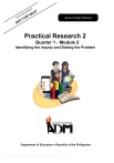 Senior High School Practical Research 2 Quarter 1 - Module 2 Identifying the Inquiry and Stating the Problem Department of Education ● Republic of the Philippines Practical Research 2- Grade 12 Alternative Delivery Mode Quarter 1 – Module 2 Identifying the Inquiry and Stating the Problem First Edition, 2020 Republic Act 8293, section 176 states that: No copyright shall subsist in any work of the Government of the Philippines. However, prior approval of the government agency or office wherein the work is created shall be necessary for exploitation of such work for profit. Such agency or office may, among other things, impose as a condition the payment of royalty. Borrowed materials (i.e., songs, stories, poems, pictures, photos, brand names, trademarks, etc.) included in this book are owned by their respective copyright holders. Every effort has been exerted to locate and seek permission to use these materials from their respective copyright owners. The publisher and authors do not represent nor claim ownership over them. Published by the Department of Education – Division of Cagayan de Oro Schools Division Superintendent: Dr. Cherry Mae L. Limbaco, CESO V Development Team of the Module Author/s: Rochelle A. Luzano, Ph.D. Kim Charies L. Okit Ma. Doris P. Napone Maria Eleonor C. Bañares Reviewers: Joel D. Potane, PhD Warren I. Luzano, PhD Illustrator and Layout Artist: Ley Krystal C. Jayoma Management Team Chairperson: Cherry Mae L. Limbaco, PhD, CESO V Schools Division Superintendent Co-Chairpersons: Alicia E. Anghay, PhD, CESE Assistant Schools Division Superintendent Members: Lorebina C. Carrasco, OIC-CID Chief Ray O. Maghuyop, EPS-Math Joel D. Potane, LRMS Manager Lanie O. Signo, Librarian II Gemma Pajayon, PDO II Printed in the Philippines by Department of Education – Division of Cagayan de Oro City Office Address: Fr. William F. Masterson Ave., Upper Balulang, Cagayan de Oro Telefax: (08822)855-0048 E-mail Address: cagayandeoro.city@deped.gov.ph Senior High School Practical Research 2 Quarter 1- Module 2 Identifying the Inquiry and Stating the Problem This instructional material was collaboratively developed and reviewed by educators from public institutions. We encourage teachers and other education stakeholders to email their feedback, comments, and recommendations to the Department of Education at action@ deped.gov.ph. We value your feedback and recommendations. Department of Education ● Republic of the Philippines This page is intentionally blank . Table of Contents What This Module is About ................................................................................................................... i What I Need to Know .............................................................................................................................. ii How to Learn from this Module ...........................................................................................................iii Icons of this Module ...............................................................................................................................iii What I Know ........................................................................................................................................... iv Lesson 1: Designing Research Topic ............................................................................................1 What’s In ........................................................................................................................1 What I Need to Know..................................................................................................1 What’s New – Topics that Interests Me! ................................................................2 What’s New – Tell Me About Your Problems! ......................................................2 What Is It – Steps in Developing Research Topic...............................................2 What’s More – Let’s Go Online ................................................................................4 What I Have Learned..................................................................................................4 What I Can Do ..............................................................................................................5 Lesson 2: Research Title ............................................................................................................................ 7 What’s In ........................................................................................................................7 What I Need to Know..................................................................................................7 What’s New – True or False .................................................................................. ..7 What Is It – Basic Guidelines in Making Research Title ................................. ..8 What’s More ..................................................................................................................9 What I Have Learned..................................................................................................9 What I Can Do ..............................................................................................................10 Additional Activity ........................................................................................................10 Lesson 3: Background of Research................................................................................................. 11 What’s In ........................................................................................................................11 What I Need to Know..................................................................................................11 What’s New – Expand Your Vocabulary ........................................................... ..11 What Is It – Background of the Study......................