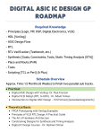 DIGITAL ASIC IC DESIGN GP ROADMAP Required Knowledge - Principles [Logic, MP, DSP, Digital Electronics, VLSI] - HDL [Verilog] - ASIC Design Flow - RTL - RTL Verification (Testbench, etc.) - Synthesis [Goals, Constraints, Tools, Static Timing Analysis (STA)] - Place and Route (PnR) - Tools - Scripting [TCL or Perl] (A Plus) Schedule Overview Approx. Time: 1.5 Months (6 Weeks) to finish two parallel sub tracks. • Practical: • Digital ASIC Design with Verilog- Dr. Paul Franzon • Digital VLSI Design (RTL to GDS) - Dr. Adam Teman • Introduction to Digital ASIC Design - VLSI School [Quizzes&Assignments] • Theoretical Basis: • • • • • FPGA Prototyping with Verilog Examples Principles of VLSI RTL Design: A Practical Guide The Art of Hardware Architecture Constraining Designs for Synthesis and Timing Analysis Digital IC Design Courses - Dr. Hesham Omran Sources • Important before Starting: • Digital Design Career Overview https://gofile.io/d/OFFpE8 • ASIC vs FPGA Comparison http://www.signoffsemi.com/asic-vs-fpga// • Digital ASIC IC Design Flow https://prezi.com/view/fjnKPHNDRw9jC5Bihzeh/ • ModelSim Tutorials [ModelSim PE Student Edition] https://www.mentor.com/company/higher_ed/modelsim-student-edition https://www.youtube.com/watch?v=9mpRF6bAY1g https://www.youtube.com/watch?v=t4LcbG5tnHY&t=307s • Videos Playlists: • Digital ASIC Design with Verilog - Dr. Paul Franzon https://www.youtube.com/playlist?list=PLfGJEQLQIDBN0VsXQ68_FEYyqcym8CTDN • Digital VLSI Design (RTL to GDS) - Dr. Adam Teman http://www.eng.biu.ac.il/temanad/digital-vlsi-design/ https://www.youtube.com/playlist?list=PLZU5hLL_713x0_AV_rVbay0pWmED7992G • Introduction to Digital ASIC Design - VLSI School https://vlsi-school.thinkific.com/courses/101 • Digital IC Design Courses - Dr. Hesham Omran https://www.youtube.com/playlist?list=PLMSBalys69yzvAKErDt7tT7O-iIKPlOCP https://www.youtube.com/playlist?list=PLMSBalys69yxoIjeZ2Q3fxs69cGCU14B1 https://www.youtube.com/playlist?list=PLMSBalys69yw1tSoF42QW9jbbC0-UeCAy • Textbooks: • FPGA Prototyping by Verilog Examples https://drive.google.com/file/d/1MplwouwD9kBATaWpdpEskm0p_bOR84PJ/view?usp=sharing • Principles of VLSI RTL Design: A Practical Guide https://drive.google.com/file/d/1WZL6uToBzi5Fex-g_OQIMvkYHOxCyZxM/view?usp=sharing • The Art of Hardware https://drive.google.com/file/d/16Y2_6JcJX_qwsHLnZz-p3Ut68k0PSU7k/view?usp=sharing • Constraining Designs for Synthesis and Timing Analysis https://drive.google.com/file/d/1GcLNzbxiZwvyCZKdSJdeMwso8G8_p3Ia/view?usp=sharing • Practicing on Projects: • FPGA 4 Students - Verilog Projects https://www.fpga4student.com/p/verilog-project.html?m=1 • ASIC World - Verilog Projects http://www.asic-world.com/verilog/index.html Schedule (Week by Week) • Week 1 Day Tasks • Introduction to Digital ASIC Design - VLSI School Weeks 1 & 2 - Course Introduction & Verilog Basics 1 • FPGA Prototyping with Verilog Examples Chapter 1: Gate-level Combinational Circuit • Introduction to Digital ASIC Design - VLSI School Week 3 - Combinational Logic 2 • FPGA Prototyping with Verilog Examples Chapter 3: RT-level Combinational Circuit - Sections 3.1:3.5 • Introduction to Digital ASIC Design - VLSI School Week 4 - Sequential Logic 3 • FPGA Prototyping with Verilog Examples Chapter 3: RT-level Combinational Circuit - Sections 3.6:3.8 • Introduction to Digital ASIC Design - VLSI School Week 5 - Finite State Machines 4 • FPGA Prototyping with Verilog Examples Chapter 3: RT-level Combinational Circuit - Sections 3.9.1:3.9.4 • Introduction to Digital ASIC Design - VLSI School Week 6 - Testbenches 5 • FPGA Prototyping with Verilog Examples Chapter 4: Regular Sequential Circuit - Sections 4.1:4.2 • Introduction to Digital ASIC Design - VLSI School Week 7 - Digital VLSI Flow 6 • FPGA Prototyping with Verilog Examples Chapter 4: Regular Sequential Circuit - Sections 4.3:4.4 • Week 2 Day Tasks • Introduction to Digital ASIC Design - VLSI School Week 8 - Introduction to Synthesis 1 • FPGA Prototyping with Verilog Examples Chapter 4: Regular Sequential Circuit - Section 4.5.1 • Introduction to Digital ASIC Design - VLSI School Week 9 - Course Project 2 • FPGA Prototyping with Verilog Examples Chapter 4: Regular Sequential Circuit - Sections 4.5.2: 4.5.3 • Introduction to Digital ASIC Design - VLSI School Week 10 - Practice Test 3 • FPGA Prototyping with Verilog Examples Chapter 5: FSM - Sections 5.1:5.2 4 • FPGA Prototyping with Verilog Examples 5 • FPGA Prototyping with Verilog Examples 6 Chapter 5: FSM - Sections 5.3.1:5.3.2 Chapter 7: Selected Topics of Verilog - Sections 7.1:7.5 • Week 3 Day Tasks 1 • Principles of VLSI RTL Design: A Practical Guide 2 • Principles of VLSI RTL Design: A Practical Guide 3 • Principles of VLSI RTL Design: A Practical Guide 4 • Principles of VLSI RTL Design: A Practical Guide 5 • Principles of VLSI RTL Design: A Practical Guide 6 • The Art of Hardware Architecture Chapter 1: Introduction to VLSI RTL Designs Chapter 2: Ensuring RTL Intent - Sections 2.1:2.7 Chapter 3: Timing Analysis - Sections 3.1:3.3 Chapter 3: Timing Analysis - Sections 3.4:3.8 Chapter 3: Timing Analysis - Sections 3.9:3.13 Chapter 1: The World of Metastability • Week 4 Day Tasks 1 • Principles of VLSI RTL Design: A Practical Guide 2 • Principles of VLSI RTL Design: A Practical Guide 3 • Principles of VLSI RTL Design: A Practical Guide 4 • Principles of VLSI RTL Design: A Practical Guide 5 • Principles of VLSI RTL Design: A Practical Guide 6 • Principles of VLSI RTL Design: A Practical Guide Chapter 4: Clock Domain Crossing (CDC) - Sections 4.1:4.9 Chapter 5: Power - Sections 5.1:5.7 Chapter 5: Power - Sections 5.8:5.13 Chapter 6: Design for Test (DFT) Chapter 7: Timing Exceptions Chapter 8: Congestion • Week 5 Day Tasks 1 • Digital ASIC Design with Verilog - Dr. Paul Franzon 2 • Digital ASIC Design with Verilog - Dr. Paul Franzon 3 • Digital ASIC 