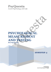 PsyQuesta Learn Psychology with Afa PSYCHOLOGICAL MEASUREMENT AND TESTING B.Sc Psychology SEMESTER -3 PsyQuesta Learn Psychology with Afa MODULE- 1 INTRODUCTION TO MEASUREMENT AND SCALING TECHNIQUES A. DEFINITION OF MEASUREMENT “Assignments of numerals according to rules.” - Tyler “Measurement consists of rules for assigning numbers to object in such a way as to represent quantities of attributes.” - Nunnally Measurement is the assignment of scores of individuals so that the scores represent some characteristics of the individuals. Psychological measurement can be achieved in a wide variety of ways, including self- report, behavioural and physiological measures. B. SCALES OF MEASUREMENT It is the way that numbers are assigned determine scale of measurement. Each scale of measurement represents a particular property or set of properties of the abstract number system. C. LEVELS OF MEASUREMENTS 1. Nominal scale Lowest level of measurement Numbers are used to name, identify or classify persons, objects or groups Nominal scales are really not scales and their only purpose is to name objects Here, members of any two groups are never equivalent but all members of any one group are always equivalent. Mathematical operations like addition, subtraction, multiplication and division are not possible Admissible statistical operations: counting or frequency, percentage, proportion, mode and coefficient of contingency. Drawback: this scale is most elementary and simple 2. Ordinal scale Second level of measurement where there is property of magnitude but not of equal interval or an absolute zero. Numbers denote the rank order of the objects or individuals. Here numbers are arranged from highest to lowest or lowest to highest. This measure reflects which person is larger or smaller, heavier or lighter, brighter or duller etc. PsyQuesta Learn Psychology with Afa E.g., socioeconomic status of people. Every member of upper class is higher in social prestige than every member of middle or lower classes. Likewise, every member of middle class is higher in social prestige than that of lower class. Permissible statistical operations: median, percentile, rank correlation coefficient + all those are permissible for nominal scale. Drawback: ordinal measures are not absolute quantities nor do they convey that the distance between the different rank values are equal. This is because they are not equal interval measurements nor do they incorporate absolute zero. there is no way to ascertain whether a person has any of the characteristics being measured. 3. Interval scale Third level of measurement Includes all the characteristics of nominal and ordinal scale The salient feature of this scale that numerically equal distances in the scale indicate equal distances in the properties of the objects being measured. Or we can say the unit of measurement is constant and equal This scale does not have an absolute zero rather than the zero point which is arbitrary, i.e., the zero point does not tell the real absence of the property being measured. Permissible statistical operations: AM (arithmetic mean), SD (standard deviation), Pearson R, t-test, F-test and other statistics based upon them. Drawback: coefficient of variation cannot be applied. 4. Ratio scale Highest level of measurement Has all the properties of nominal, ordinal and interval scales plus absolute zero point Salient feature of this scale: ratio of any two numbers is independent of the unit of measurement Anything that can be measured from absolute zero can be measured within a ratio scale. E.g., measures of high, weight, length, width etc. Here, the zero point is not arbitrary, but true. All statistical operations including coefficient of variation can be used. In social sciences like psychology and sociology, we frequently encounter with interval measurement because most of the data obtained from measurement are such that we assume an equal unit of measurement and arbitrary zero point. PsyQuesta Learn Psychology with Afa D. PROPERTIES OF LEVELS OF MEASUREMENT 1. Identity Assignment of numbers to respondent’s response and these numbers are just for the sake of identification. These numbers can’t be used for mathematical operations. E.g., roll number of students in a class. 2. Magnitude Property of “moreness”. Any scale is said to have the property of magnitude if it can be said that a particular instance of the attributes represents more, less or equal amounts of the given quantity that does another instance. E.g., height and weight of students in a class. 3. Equal interval A scale has the property of equal interval if the difference between any two points at any place on the scale has the same meaning as the difference between two other points that differ by the same number of scale units. E.g., difference between 4kg and 6kg on a weight measuring scale represent the same quantity as the difference between 14 kg and 16 kg, i.e., exactly 2 kg. Psychological tests rarely have the property of equal interval. For e.g., the difference between IQ 50 & 60 does not mean the difference between IQ 110 & 120, although each of these differ by 10 points. 4. Absolute zero An absolute zero is said to exist when nothing of the property being measured exist (temperature on 0 is not absolute zero as it still has some effect and we can’t say no temperature). It is very difficult or impossible for a psychological measurement to define zero. PsyQuesta Learn Psychology with Afa DISTINCTION BETWEEN PSYCHOLOGICAL MEASUREMENT AND PHYSICAL MEASUREMENT. PHYSICAL MEASUREMENT PSYCHOLOGICAL MEASUREMENT 1. Unit of measurement is fixedand constant throughout the measurement 1. Unit of measurement not fixed and varies throughout the measurement 2. There is a true zero point 2. There is an arbitrary zero point 3. More accurate and predictable 3. Less accurate and predicable 4. Measurement is direct 5. Entire quantity can be measured 4. Measurement is indirect 5. Entire quanti