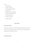 outline 1) Research Design 2) Population of the Study 3) Sample and Sampling Technique 4) Instrumentation 5) Reliability of the Research Instrument 6) validity of the Research Instrument 7) Data collection procedure 8) Method of Data Analysis 9) Ethical consideration Research Design What is Research Design? Research design is the framework of research methods and techniques chosen by a researcher to conduct a study. The design allows researchers to sharpen the research methods suitable for the subject matter and set up their studies for success. Types of Research Design 1 A researcher must clearly understand the various research design types to select which model to implement for a study. Like research itself, the design of your analysis can be broadly classified into quantitative and qualitative. Qualitative research Qualitative research is a process of naturalistic inquiry that seeks an in-depth understanding of social phenomena within their natural setting. Qualitative research relies on data obtained by the researcher from first-hand observation, interviews, questionnaires (on which participants write descriptively), focus groups, and participant-observation, recordings made in natural settings, documents, case studies, and artifacts. The data are generally non-numerical. Qualitative methods include: 1) Ethnography research: This is used to understand the culture of a group, community or organization through participation and close observation 2) Grounded Theory research: This is a qualitative method that enables you to study a particular phenomenon or process and discover new theories that are based on the collection and analysis of real world data ... 3) Discourse Analysis: discourse studies, is an approach to the analysis of written, vocal, or sign language use, or any significant semiotic event. Discourse analysis is a research method for studying written or spoken language in relation to its social context. It aims to understand how language is used in real life situations. When you do discourse analysis, you might focus on: The purposes and effects of different types of language. 2 4) Interpretative Phenomenological Analysis: is a qualitative approach which aims to provide detailed examinations of personal lived experience. It is use to explore in detail how participants are making sense of their personal and social world. 5) Descriptive phenomenological approach : This is better suited to examining the experiences of family caregivers of patients with advanced head and neck cancer Quantitative research Quantitative research is a research strategy that focuses on quantifying the collection and analysis of data. It is for cases where statistical conclusions to collect actionable insights are essential. Numbers provide a better perspective for making critical business decisions. Quantitative research methods are necessary for the growth of any organization. Insights drawn from complex numerical data and analysis prove to be highly effective when making decisions about the business’s future. You can further break down the types of research design into categories which are: 1. Descriptive: In a descriptive composition, a researcher is solely interested in describing the situation or case under their research study. It is a theory-based design method created by gathering, analyzing, and presenting collected data. This allows a researcher to provide insights into the why and how of research. Descriptive design helps others better understand the need for the research. If the problem statement is not clear, you can conduct exploratory research. 3 2. Experimental: Experimental research establishes a relationship between the cause and effect of a situation. It is a causal design where one observes the impact caused by the independent variable on the dependent variable. For example, one monitors the influence of an independent variable such as a price on a dependent variable such as customer satisfaction or brand loyalty. It is an efficient research method as it contributes to solving a problem. The independent variables are manipulated to monitor the change it has on the dependent variable. Social sciences often use it to observe human behavior by analyzing two groups. Researchers can have participants change their actions and study how the people around them react to understand social psychology better. 3. Correlational research: Correlational research is a non-experimental research technique. It helps researchers establish a relationship between two closely connected variables. There is no assumption while evaluating a relationship between two other variables, and statistical analysis techniques calculate the relationship between them. This type of research requires two different groups. A correlation coefficient determines the correlation between two variables whose values range between -1 and +1. If the correlation coefficient is towards +1, it indicates a positive relationship between the variables, and -1 means a negative relationship between the two variables. 4. Diagnostic research: In diagnostic design, the researcher is looking to evaluate the underlying cause of a specific topic or phenomenon. This method helps one learn more about the factors that create troublesome situations. 4 5. Explanatory research: Explanatory design uses a researcher’s ideas and thoughts on a subject to further explore their theories. The study explains unexplored aspects of a subject and details the research questions’ what, how, and why. Sample and Sampling Technique Sampling is related with the selection of a subset of individuals from within a population to estimate the characteristics of whole population. i.e Sampling is a process in statistical analysis where researchers take a predetermined number of observations from a larger population Sampling Techniques The following points need to be considered in selection of individuals. a. Investigations may be carried out on an entire group or a r