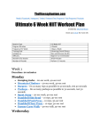 Thefitnessphantom.com Reddit | Facebook | Instagram | Twitter | Pinterest |Free Programs | Paid Programs | Products Ultimate 6 Week HIIT Workout Plan Created by: Murshid Akram Check out article for more info HIIT Workout Plan Description Routine Type Program Duration Frequency Per Week Training Goal Suitable For Difficulty Duration of a Session Number of Rounds Full Body HIIT 6 Weeks 3 Days a Week Enhancing Overall Fitness Men and Women (16-40) Beginner to Intermediate 20-30 minutes Perform 2-3 rounds Week 1 Duration: 20 minutes Monday • • • • • • • • • Jumping Jacks – 20-sec work, 40-sec rest Mountain Climbers – 20-sec work, 40-sec rest Burpees – Do as many reps as possible in 30 seconds, rest 30 seconds Pushups – Do as many pushups as possible in 30 seconds, rest 30 seconds Squat Jump – 20-sec work, 40-sec rest Dumbbell Side Bend – 10 reps, 30-sec rest Dumbbell Push Press – 10 reps, 30-sec rest Dumbbell Floor Press – 10 reps, 30-sec rest Farmer Carry Walk – 30-sec walk, 30-sec rest Wednesday Mountain Climbing: 20-sec work, 40-sec rest Burpees: 10 reps at 85-90% of your maximum heart rate, 40-sec rest Jumping Split Lunges: 10 reps, 40-sec rest Sumo Squats: 10 reps, 40-sec rest Shoulder Tap: 20-sec work, 40-sec rest Crunches: 20-sec work, 40-sec rest High Knees: 20-sec work, 40-sec rest Russian Twist: 20-sec work, 40-sec rest Leg Raises: 10 reps, 40-sec rest Mountain Climber: 20-sec work, 40-sec rest Friday Jumping Jack: 20-sec work, 40-sec rest Pushups: 10 reps, 40-sec rest Burpees: 10 reps, 40-sec rest Squat Jump: 10 reps, 40-sec rest Dumbbell Side Bend: 10 reps, 30-sec rest Dumbbell Swings: 10 reps, 40-sec rest Dumbbell Push Press – 10 reps, 30-sec rest 10-min Core Workout Week 2 Monday • • • • • • • • • • • Jump Squat – 30 seconds, 30-sec rest Mountain Climbers – 30 seconds, 30-sec rest Lateral Run – 30 seconds, 30-sec rest Pushups – 30 seconds, 30-sec rest Burpees – 30 seconds, 45-sec rest Crunches – 30 seconds, 30-sec rest Jump Split Squat – 30 seconds, 30-sec rest Leg Raises – 30 seconds, 30-sec rest Dumbbell Swings: 10 reps, 30-sec rest Dumbbell Squat to Overhead Press: 10 reps, 30-sec rest Dumbbell Woodchop: 10 reps, 30-sec rest Wednesday Round 1 Burpee: 10 reps, 30-sec rest Pushups: 10 reps, 30-sec rest Jump Squat: 10 reps, 30-sec rest Dumbbell Rowing: 10 reps, 30-sec rest Dumbbell Floor Press: 10 reps, 30-sec rest Round 2 15-min Core Workout Friday Jump Squats: 30 seconds, 30-sec rest Crunches: 30 seconds, 30-sec rest Burpee: 10 reps, 30-sec rest Pushups: 10 reps, 30-sec rest Squat Pulses Jump: 30 seconds, 30-sec rest Shoulder Tap: 30 seconds, 30-sec rest Mountain Climbing: 30 seconds, 30-sec rest Russian Twist: 30 seconds, 30-sec rest Reverse Crunches: 30 seconds, 30-sec rest Split Jump Squat: 30 seconds, 30-sec rest Week 3 Monday Jump Squat: 30 seconds, 30-sec rest Mountain Climbers: 30 seconds, 30-sec rest Pushups: 10 reps, 30-sec rest Burpees: 10 reps, 30-sec rest Crunches: 10 reps, 30-sec rest Jump Split Squat: 10 reps, 30-sec rest Leg Raises: 30 seconds, 30-sec rest Dumbbell Side Bend: 10 reps, 30-sec rest Dumbbell Swings: 30 seconds, 30-sec rest Dumbbell Carry Walk: 30 seconds, 30-sec rest Wednesday Burpees: 10 reps, 30-sec rest Mountain Climber: 30 seconds, 30-sec rest Squats: 10 reps, 30-sec rest Pushups: 10 reps, 30-sec rest Crunches: 30 seconds, 30-sec rest Jump Squat: 10 reps, 30-sec rest Flutter Kicks: 30 seconds, 30-sec rest Jumping Jacks: 30 seconds, 30-sec rest Dumbbell Push Press: 10 reps, 30-sec rest Dumbbell Step-ups: 10 reps, 30-sec rest Friday Jump Squats: 30 seconds work, 30-sec rest Mountain Climbing: 30 seconds work, 30-sec rest High Knees: 30 seconds work, 30-sec rest Pushups: 30 seconds work, 30-sec rest Lateral Lunges: 30 seconds work, 30-sec rest Shoulder Tap: 30 seconds work, 30-sec rest Crunches: 30 seconds work, 30-sec rest Squats: 30 seconds work, 30-sec rest Flutter Kicks: 30 seconds work, 30-sec rest Pushup to Row: 30 seconds work, 30-sec rest Week 4 Monday Jumping Split Squat: 30 seconds work, 30-sec rest Mountain Climbers: 30 seconds work, 30-sec rest Burpees: 10 reps, 30-sec rest Crunches: 30 seconds work, 30-sec rest Sumo Squat: 30 seconds work, 30-sec rest Leg Raise: 30 seconds work, 30-sec rest Squat Pulses Jump: 30 seconds work, 30-sec rest Dumbell Squat to Overhead Press: 10 reps, 30-sec rest Dumbbell Squat Swing: 10 reps, 30-sec rest Dumbbell Farmers Carry Walk: 10 reps, 30-sec rest Wednesday Jumping Jacks: 30 seconds work, 30-sec rest High Knees: 30 seconds work, 30-sec rest Shoulder Tap: 30 seconds work, 30-sec rest Squat Thrust: 30 seconds work, 30-sec rest Pushups: 30 seconds work, 30-sec rest Mountain Climbing: 30 seconds work, 30-sec rest Crunches: 30 seconds work, 30-sec rest Leg Raises: 30 seconds work, 30-sec rest Dumbbell Thruster: 30 seconds work, 30-sec rest Dumbbell Squat to Swing: 30 seconds work, 30-sec rest Friday Jump Squat: 30 seconds work, 30-sec rest Mountain Climbers: 30 seconds work, 30-sec rest Burpees: 10 reps, 30-sec rest Crunches – 30 seconds work, 30-sec rest Jump Split Squat: 30 seconds work, 30-sec rest Leg Raise: 30 seconds work, 30-sec rest Dumbell Squat to Overhead Press: 10 reps, 30-sec rest Dumbbell Squat Swing: 10 reps, 30-sec rest Dumbbell Farmers Carry Walk: 10 reps, 30-sec rest Dumbbell Step-ups: 10 reps, 30-sec rest Week 5 Monday Squats: 30 seconds work, 30-sec rest Pushups: 30 seconds work, 30-sec rest Crunches: 30 seconds work, 30-sec rest Burpee – 10 reps, 30-sec rest Flutter Kicks: 30 seconds work, 30-sec rest Jumping Split Squat: 30 seconds work, 30-sec rest V ups: 30 seconds work, 30-sec rest Dumbbell Side Bend: 30 seconds work, 30-sec rest Dumbbell Push Press: 10 reps, 30-sec rest Farmer Carry Walk: 10 reps, 30-sec rest Wednesday Round 1 • • • • • Mountain Climbing: 30 seconds work, 30-sec rest Burpees: 10 reps, 30-sec rest Squats: 30 seconds work, 30-sec rest Pushups: 30 seconds work, 30-sec rest Jum