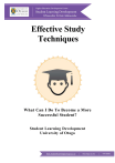 Effective Study Techniques What Can I Do To Become a More Successful Student? Student Learning Development University of Otago hedc.studentlearning@otago.ac.nz | sld.otago.ac.nz | 479 8801 This booklet is an introduction to some of the skills and strategies that will help you successfully complete your studies at Otago. Based on an original booklet developed by Pauline Brook and Carol Hunter for Student Learning Development at the University of Otago. Version 1.1 Revised 2016 Introduction The intention of this guide is to help you to be a more effective learner in time management, note-taking, reading, and preparing for exams. During your first year at university, in particular, you may be finding out what kind of learner you are. It might be necessary for you to explore and experiment with different ways of learning and working with material to see what works for you. In fact, you may find that you use different learning strategies for different papers to process academic information so that you understand and remember it. Everyone has a different way of learning and there’s no one right way for everyone or for every paper you’re studying. However, the crucial element is that you’re actively engaged in the process by thinking about information from various angles rather than solely the way it’s been presented in lectures. This approach will set you up well for being a critical thinker and for preparing effectively for assignments, tests and exams. The more strategies you bring to study, the better will be your understanding, retention and recall. This Guide introduces a series of techniques to help you to foster deep learning which requires active engagement with the material, whereas surface learning is where you have only a superficial understanding of the information, and have difficulty explaining and applying it to other concepts or contexts. By engaging in a deep approach not only will your learning be more effective but there’s a greater likelihood that you’ll enhance your learning experience and enjoyment at university. Remember that active engagement is paramount to effective learning. Time management Underpinning any effective study strategy is time management, a skill that can be learnt. Students sometimes have a cluster of assignments or tests during certain periods of the semester so it’s imperative to be organized. Being so means that you’re more likely to be an effective learner, you’ll enjoy your time at university more, and your stress levels will be minimised. The sooner you equip yourself with good time management strategies, the more effective you’ll be with your study because having a plan focuses your mind. Remember that friends, leisure and sport are important for a healthy life and that a balance between work and other activities will help you to stay motivated. Good time management skills are also an asset in your personal life and in your future profession. If you find one topic or paper harder than others, then obviously you’ll need to devote extra time to it. Remember to consider how much learning happens in class, labs and tutorials versus how much work you’re expected to do by yourself. It’s also important to know the learning objectives for each of your papers and the topics within them to guide and structure your study and the amount of time you spend on it. Every week at university is different in terms of workload, so you need to take a flexible approach to accommodate changing priorities or circumstances. A time plan is a guide only, so don’t panic if there are disruptions to it some weeks. Setting goals Identifying goals is particularly important to avoid procrastination and help you to remain focused and motivated. Be clear about what you want to achieve at university and work out some short-term, medium-term and long-term goals. Make sure that these goals are realistic and achievable because doing so means you’re more likely to attain them. You may be unclear about which profession you’re aiming for but you obviously want to pass your exams. Setting priorities Know your priorities for the semester, for the week and for the day. This knowledge will help you to have a clear idea of what tasks need to be achieved. However, having too many high priorities could have negative consequences. Attending lectures, tutorials, and labs and meeting assignment deadlines are top priorities, but balance these commitments by making time for social and leisure. Making plans Making plans for the semester, the week and the day involves knowing exactly what tasks are coming up and taking the steps required to achieve them. A wall planner, a weekly planner and a diary are necessary for you to plan appropriately. Semester plan Have a written plan which factors in dates for assignments and tests for the whole semester. Doing so means there are no nasty surprises regarding assessments and you can see the “lie of the land” for the semester, including periods that may be particularly busy because of a cluster of assessments or tests. • This plan should include dates for assignments, tests, oral presentations, and lab reports. • Be specific about the information you include in your time plan—e.g. HIST 105 Essay 20% — so that you know the weightings and you can prioritise tasks and plan accordingly. • Use different coloured pens for different subjects to make tracking your assignments easier. • Mark in assignment deadlines and work out the time you’ll need to complete each one. • Ask yourself what steps you need to take to prepare for them. For example, if an • Essay is due in three weeks’ time, decide approximately how long you’ll spend on research, planning, writing, and editing. • Note these tasks and dates for completing them in your diary or on a wall planner. Use the value of the assignment (e.g. 15%, 30%) as a guide to how long you should spend on it. • Put the plan in a prominent place such as in the front of