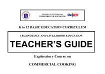 Republic of the Philippines DEPARTMENT OF EDCUATION K to 12 BASIC EDUCATION CURRICULUM TECHNOLOGY AND LIVELIHOOD EDUCATION TEACHER’S GUIDE Exploratory Course on COMMERCIAL COOKING K to 12 TECHNOLOGY AND LIVELIHOOD EDUCATION HOME ECONOMICS –COMMERCIAL COOKING (Exploratory) TABLE OF CONTENTS Introduction........................................................................................................................................................................................................ 3 Background Information The Overall Goal of the K to 12 Curriculum ............................................................................................................................................. 3 The Conceptual Framework of the Teaching of TLE ................................................................................................................................ 3 The TLE Exploratory Courses ................................................................................................................................................................. 5 Time Allotment …………………………………………………………………………………………………………………………………………6 The Learning Modules and Lessons .................................................................................................................................................................. 6 New Feature of the Teaching of TLE ................................................................................................................................................................. 6 About the Learning Module Design of the Module............................................................................................................................................................................... 7 Parts of the Lesson ................................................................................................................................................................................. 8 Reflection ........................................................................................................................................................................................................ 12 Curriculum Guide............................................................................................................................................................................................. 13 *TWG on K to 12 Curriculum Guide – version January 31, 2012 2 K to 12 TECHNOLOGY AND LIVELIHOOD EDUCATION HOME ECONOMICS –COMMERCIAL COOKING (Exploratory) Teacher’s Guide for TLE Exploratory Course on Commercial Cooking Introduction This Teacher’s Guide is intended for you, the TLE teacher, who teaches any of the more than 24 TLE exploratory courses in the Grades 7 and 8 of the K to 12 curriculum. To ensure that you teach the TLE exploratory courses the way they were intended to be taught, you must see the big picture of the K to 12 curriculum and the teaching of TLE. Some background information is necessary. Background Information 1. The Overall Goal of the K to 12 Curriculum The K to 12 Curriculum has as its overarching goal the holistic development of every Filipino learner with 21stcentury skills who is adequately prepared for work, entrepreneurship, middle level skills development and higher education. The overarching goal of the K to 12 curriculum, tells you that the teaching of TLE plays a very important role in the realization of the overall goal of the curriculum. Whether or not the K to 12 graduate is skilled and ready for work, entrepreneurship and middle skills development depend to a great extent on how effectively you taught TLE. 2. The Conceptual Framework of the Teaching of TLE Below is a schematic diagram of Technology and Livelihood Education (TLE) framework in general secondary schools. This should guide you in the teaching of the TLE exploratory courses. *TWG on K to 12 Curriculum Guide – version January 31, 2012 3 K to 12 TECHNOLOGY AND LIVELIHOOD EDUCATION HOME ECONOMICS –COMMERCIAL COOKING (Exploratory) Figure 1.TLE Framework *TWG on K to 12 Curriculum Guide – version January 31, 2012 4 K to 12 TECHNOLOGY AND LIVELIHOOD EDUCATION HOME ECONOMICS –COMMERCIAL COOKING (Exploratory) The diagram shows that Technology and Livelihood Education encompasses the field of Home Economics, Industrial Arts, Agri-Fishery Arts and ICT. The 24 TLE courses can be categorized under any of these fields. TLE is geared towards the development of technological proficiency and is anchored on knowledge and information, entrepreneurial concepts, process and delivery, work values and life skills. K to 12 TLE is one that… a. is built on adequate mastery of knowledge and information, skills and processes, acquisition of right work values and life skills; b. equips students with skills for lifelong learning; and c. is founded on cognitive, behavioral or psychomotor and affective dimensions of human development. The diagram likewise shows that entrepreneurial concepts also form part of the foundation of quality TLE. It is expected that your TLE students, after using the Learning Module on Entrepreneurship, imbibe the entrepreneurial spirit and consequently set up their own businesses in the areas of Agri-Fishery Arts, Industrial Arts, Home Economics, and Information and Communication Technology. TLE by its nature is dominantly a skill subject and so you must engage your students in an experiential, contextualized, and authentic teachinglearning process. It is a subject where your students learn best by doing. It is integrative in approach. For instance, it integrates entrepreneurship with all the areas of TLE. It integrates concepts, skills and values. 3. The TLE Exploratory Courses TLE in Grades 7 and 8 are exploratory in nature. Your school will choose at least 4 from the list of 24 courses for which 23 Learning Modu