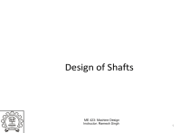 Design of Shafts ME 423: Machine Design Instructor: Ramesh Singh 1 Introduction • Torque and Power Transmission • Most of rotary prime movers either motors or turbines use shaft to transfer the power • Bearings are required for support • Shaft failure analysis is critical ME 423: Machine Design Instructor: Ramesh Singh 2 Shaft Design • Material Selection (usually steel, unless you have good reasons) • Geometric Layout (fit power transmission equipment, gears, pulleys) • Failure strength – Static strength – Fatigue strength • Shaft deflection – – – – Bending deflection Torsional deflection Slope at bearings and shaft-supported elements Shear deflection due to transverse loading of short shafts • Critical speeds at natural frequencies ME 423: Machine Design Instructor: Ramesh Singh 3 Shaft Materials • Deflection primarily controlled by geometry, not material • Strain controlled by geometry but material has a role in stress • Strength, Yield or UTS is a material property. Cold drawn steel typical for d< 3 in. • HR steel common for larger sizes. Should be machined all over. • Low production quantities: Machining • High production quantities: Forming ME 423: Machine Design Instructor: Ramesh Singh 4 Shaft Layout • Shafts need to accommodate bearings, gears and pulleys which should be specified • Shaft Layout – Axial layout of components – Supporting axial loads (bearings) – Providing for torque transmission (gearing/sprockets) – Assembly and Disassembly(repair & adjustment) ME 423: Machine Design Instructor: Ramesh Singh 5 Axial Layout of Components 7–2 a shaft n to support and wo gears and two Solution uses an on, three shaft ey and keyway, and housing locates the their outer rings the thrust loads. an-shaft n. (d) Solution uses ngs, a straightt, locating collars, ws for collars, fan an itself. The fan ports the sleeve (a) (b) Fan (c) (d) The geometric configuration of a shaft to be designed is often simply a revision of existing models in which a limited number of changes must be made. If there is no ME 423: Machine Design existing design to use as a starter, then the determination of the shaft layout may have Instructor: Ramesh Singh many solutions. This problem is illustrated by the two examples of Fig. 7–2. 6In Fig. 7–2a a geared countershaft is to be supported by two bearings. In Fig. 7–2c a This design represents good practice for the situation in which one or more torquetransfer elements must be mounted outboard. (Source: Redrawn from material furnished by The Timken Company.) Supporting Axial Load • Axial loads must be supported through a bearing to the frame • Generally best for only one bearing to carry axial load to shoulder bud29281_ch07_358-408.qxd 12/8/09 12:52PM Page 364 ntt 203:MHDQ196:bud29281:0073529281:bud29281_pagefiles: 364 Mechanical Engineering Design Figure 7–3 Tapered roller bearings used in a mowing machine spindle. This design represents good practice for the situation in which one or more torquetransfer elements must be mounted outboard. (Source: Redrawn from material furnished by The Timken Company.) Figure 7–4 A bevel-gear drive in which both pinion and gear are straddle-mounted. (Source: Redrawn from material furnished by Gleason Machine Division.) • Pins Figure 7–4 A bevel-gear drive in which both pinion and gear are straddle-mounted. (Source: Redrawn from material furnished by Gleason Machine Division.) • Press or shrink fits • Tapered fits ME 423: Machine Design Instructor: Ramesh Singh In addition to transmitting the torque, many of these devic the torque exceeds acceptable operating limits, protecting more Details regarding hardware components such as keys, p addressed in detail in Sec. 7–7. One of the most effective an transmitting moderate to high levels of torque is through a key 7 the shaft and gear. Keyed components generally have a slip fit o Torque Transmission • Common means of transferring torque to shaft – – – – – – Keys Splines Setscrews Pins Press or shrink fits Tapered fits • Keys are one of the most effective◦ – Slip fit of component onto shaft for easy assembly – Positive angular orientation of component – Can design the key to be weakest link to fail in case of overload ME 423: Machine Design Instructor: Ramesh Singh 8 Shaft Design for Stresses • Stresses are only evaluated at critical location • Critical locations are usually – – – – On the outer surface Where the bending moment is large Where the torque is present Where stress concentrations exist ME 423: Machine Design Instructor: Ramesh Singh 9 Bending, torsion, and axial stresses may be present in both midrange and alternating ing magnitudes. components. For analysis, it is simple enough to combine the different types of stresses into alternating and midrange von Mises stresses, as shown in Sec. 6–14, p. 317. Shaft Stresses It is sometimes convenient to customize the equations specifically for shaft applicaBending, and are axial stresses may be present in both midrange and alternating tions.torsion, Axial loads usually comparatively very small at critical locations where components. For torsion analysis, it is simple enough combine thefollowing differentequations. types ofThe stresses bending and dominate, so they will betoleft out of the Standard equations can customized for shafts into •alternating and stress midrange von and Mises stresses, as 6–14, p. 317. fluctuating stresses due to bending torsion are be given byshown in Sec. Shaft Stresses It is sometimes convenient to customize the equations specifically for shaft applica• Axial loads are σgenerally only bending and(7–1) torsion Ma c small so M mc Kf σmvery = K fsmall at critical locations tions. Axial loads are usually comparatively where a = I I bending be and considered torsion dominate, so they will be left out of the following equations. The Ta c Tm c fluctuating stresses due to bending τ = Kand 