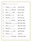 Name____________________________ 1. I have a __ __ __ hat. (red, the, fun) 2. My __ __ __ has a tail. (arm, let, dog) 3. I can __ __ __ fast! (tan, run, let) 4. Do you like __ __? (do, hi, me) 5. How are __ __ __? (fun, hat, you) 6. __ __ __ __ with me. (play, door, look) 7. Where is my __ __ __ __? (tall, door, book) 8. Can I __ __ __ __? (some, fall, come) 9. Close the __ __ __ __. (took, door, ball) 10. Can you __ __ __ me? (and, fan, see) 11. Let me __ __! (hi, go, it) 12. __ __ __ __ at the dog. (find, snow, look) Name____________________________ 1. Play with ______. (to, hi, me) 2. _____ to your room. (of, go, in) 3. I like ______. (tan, run, red) 4. Do you like _______? (look, blue, come) 5. ______ me come too. (fun, hat, let) 6. Where are ______? (can, and, you) 7. Where ______ you go? (sad, out, did) 8. Let’s ________ now. (some, fall, read) 9. Close the _________. (took, book, ball) 10. I am so _________. (and, hot, see) 11. Let me _________. (say, try, and) 12. Time for __________. (end, bed, let) Name____________________________ 1. The sky is_________. (brown, green, blue) 2. The moon is________. (green, blue, white) 3. The grass is _________. (green, orange, red) 4. Stop signs are _________. (green, blue, red) 5. Wood is _____________. (purple, brown, blue) 6. Fire is ___________ (green, blue, orange) 7. My teeth are ________. (red, green, white) 8. A duck is __________. (purple, blue, yellow) 9. A plum is _________. (yellow, purple, blue) 10. My dog is _________. (orange, purple, black) 11. Car tires are _________. (purple, black, green) 12. Cheese is __________. (black, purple, orange) http://specialed.about.com Name____________________________ 1. My friend is ______. (fun, can, will) 2. Do you like _________? (and, meet, dogs) 3. I like ______. (run, in, milk) 4. What is your ________? (look, name, come) 5. I like to __________. (fun, sing, let) 6. My ________ is on my head. (can, and, hat) 7. Where is your ________? (sad, out, dad) 8. Let’s __________outside. (some, fall, play) 9. Come over __________. (took, here, ball) 10. I can walk _________. (and, fast, see) 11. It is _____________. (say, Friday, the) 12. Cookies are ___________. (good, bed, let) Name____________________________ Circle the star. 1. Circle the ninth star. * * * * * * * * * * 2. Circle the seventh star. * * * * * * * * * * 3. Circle the sixth star. * * * * * * * * * * 4. Circle the eighth star. * * * * * * * * * * 5. Circle the forth star. * * * * * * * * * * 6. Circle the tenth star. * * * * * * * * * * 7. Circle the third star. * * * * * * * * * * 8. Circle the first star. * * * * * * * * * * 9. Circle the second star. * * * * * * * * * * 10. Circle the first star. * * * * * * * * * * 11. Circle the fifth star. * * * * * * * * * * 12. Circle the ninth star. * * * * * * * * * * http://specialed.about.com Name____________________________ 1. My hat is ______. (fun, blue, will) 2. Call Jane _______ Tim. (and, meet, at) 3. Put the book ______. (sad, down, milk) 4. Can you ______ Caleb? (look, name, find) 5. The ball is __________. (hers, the, and) 6. I can __________ up. (can, and, jump) 7. I have a ____________sister. (at, out, little) 8. Let’s __________outside. (some, fall, play) 9. _______ at my cat. (took, look, ball) 10. It is ________ mine. (and, not, see) 11. She __________ hi to me. (say, said, eat) 12. Pick it _________. (good, up, let) http://specialed.about.com Name____________________________ 1. Can we _______ go? (call, all, fall) 2. I ________ here now. (and, am, at) 3. _______ you coming? (sad, our, are) 4. I _______ a cookie. (look, ate, find) 5. He __________to see me. (came, the, and) 6. Who is it ___________? (can, but, from) 7. Did you ________ a book? (at, out, get) 8. He ________ my toy. (as, has, find) 9. I _________ read my book. (took, must, ball) 10. I _________ you. (and, not, like) 11. Come here ___________! (say, said, now) 12. My hat is _________. (new, up, let) http://specialed.about.com Name____________________________ 1. Two comes ___________ one. (call, after, fall) 2. He fell _____________. (and, am, again) 3. I don’t have _________. (any, our, are) 4. Give me ____________ card. (look, every, find) 5. My mom is _____________. (came, pretty, fly) 6. __________ the door. (can, open, from) 7. I am ________ now. (at, going, get) 8. Do you _________ him? (as, no, know) 9. My dad is ____________. (took, must, old) 10. My ball is _________. (and, not, round) 11. Bring your friend _________. (say, said, over) 12. Give ____________ to Jeff. http://specialed.about.com (new, some, let) Name____________________________ 1. 2. 3. 4. 5. 6. 7. 8. 9. 10. 11. 12. I ______________do my homework. (could, some, always, before) Will you read that poem _____________. (going, from, again, once) I _____________ you like reading. (no, know, could, once) Let’s see if you can get everything ____________. (write, right, always, their, those) I did not get any ___________ last ___________. (found, goes, sleep, sound, night, would, very) My Dad ___________ me clean my room. (because, make, made, right) Sam _____________ ___________ balls. (because, both, found, wash, upon, work) Jim sure can ______________ a good story! (right, always, write, some) Clean your room ______________ you go outside. (because, found, those, before) Tell me ____________colour to use. (would, your, which, very) This ___________ is too hard! (when, work, any, pull) _________________ games were lots of fun! (these, those, many, there) http://specialed.about.com Name____________________________ 1. __________________brush your teeth before you go to bed. (does, before, always, many pull) 2. I write with my ________________hand. (made, pull, right, always) 3. _________________ colour do you like the best? (never, wish, which, upon) 4. My brother _________________my bed for me. (make, beside, made, don’t) 5. _____________time does the show start? (where, what, because, when) 6. Where is ________________ book? (what, y