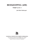 BEEKEEPING (650) NSQF Level 4 (Job Role: Beekeeper) NATIONAL INSTITUTE OF OPEN SCHOOLING (An autonomous organisation under MHRD, Govt. of India) A-24-25, Institutional Area, Sector-62, NOIDA-201309 (U.P.) Website: www.nios.ac.in, Toll Free No. 18001809393 COURSE TEAM ADVISORY COMMITTEE Prof. C. B. Sharma Chairman NIOS, NOIDA, U.P. Dr Rajesh Kumar Director, Vocational NIOS, NOIDA, U.P. Dr Mamta Srivastava Deputy Director (Vocational) NIOS, NOIDA, U.P. CURRICULUM COMMITTEE Dr Mayank Kumar Rai Professor & Head, Krishi Vigyan Kendra, Gautum Buddha Nagar, U.P. Dr R.P. Singh Associate Prof., Dept. of Entomology, NDUA&T Faizabad, U.P. Mr Mukesh Sharma Beekeeper & Advisor, Natural Rural & Agriculture Resource Development Institute, Hapur, U.P. Dr D. K. Rana Subject Matter Specialist (Plant Protection), Krishi Vigyan Kendra, Ujwa New Delhi Ms. Seema, Manager Agriculture Sector Skill Council, Gurugram, U.P. Dr Neelima Pant Academic Officer (Agriculture) NIOS, NOIDA, U.P. LESSON WRITERS Dr S. R. Koteswara Rao Professor and Head, Department of Entomology, S.V. Agricultural College Tirupati , A.P. Dr Mayank Kumar Rai Professor & Head, Krishi Vigyan Kendra, Gautum Buddha Nagar, U.P. Dr R.P. Singh Associate Prof., Dept. of Entomology, Narendra Dev University of Agriculture & Technology, Faizabad, U.P. Dr N. Nagaraja Assistant Professor (Zoology/ Apiculture) UGC-Human Resource Development Centre, Bangalore University, Bangalore, Karnataka EDITORS Dr. Sunita Yadav Assistant Scientist Department of Entomology College of Agriculture CCS Haryana Agricultural University Hisar, Haryana PROOF READER Dr Neelima Pant Academic Officer (Agriculture) NIOS, Noida, U.P. COURSE COORDINATOR Dr Neelima Pant Academic Officer (Agriculture) NIOS, Noida, U.P. GRAPHICS/DTP M/S Sri Krishna Graphics Delhi Dr Shankarganesh Scientist (Entomology) Division of Entomology ICAR-CICR, Regional Station Maruthamalai Road Coimbatore, T.N. A Word With You Dear Learner, Welcome to the National Institute of Open Schooling (NIOS)! By enrolling with this Institution, you have become part of the family of the world’s largest Open Schooling System. As a learner of the NIOS Vocational Programme, I am confident that you will enjoy studying and will benefit from this very unique system of learning. The course “Beekeeping” (NSQF compliant level 4), comprising of theory and practical components and is intended to provide you self-confidence and a new avenue to the future. This programme is designated for the youths of rural and semi urban areas like you, who are willing to make their career in the beekeeping sector. After completing this course you will acquire all the competencies to carry out beekeeping operations right from understanding bee biology and behaviour to harvesting and processing of products. After completing this course you may either work independently or may work in a beekeeping farm. We are confident that this course will prove to be beneficial to you. We look forward to any comments and suggestions from you for further improvement. Sincere efforts have been made to present the matter in a very simple manner for your easy understanding. Since this is a practical oriented subject you will have to depend on the Study Centres also for getting empowered in the Beekeeping Techniques. We wish you all the best in your future career. Course Team National Institute of Open Schooling (NIOS) How to use the Study Material Congratulation! You have accepted the challenge to be a self-learner. NIOS is with you at every step and has developed the material in Beekeeping with the help of a team of experts, keeping you in mind. A format supporting independent learning has been followed. If you follow the instructions given, then you will be able to get the best out of this material. The relevant icons used in the material will guide you. These icons have been explained below for your convenience. Title: will give a clear indication of the contents within. Do read it. Introduction: This will introduce you to the lesson linking it to the previous one. Objectives: These are statements that explain what you are expected to learn from the lesson. The objectives will also help you to check what you have learnt after you have gone through the lesson. Do read them. Notes: Each page carries empty space in the side margins, for you to write important points or make notes. Intext Questions: Very short answer self check questions are asked after every section, the answers to which are given at the end of the lesson. These will help you to check your progress. Do solve them. Successful completion will allow you to decide whether to proceed further or go back and learn again. What You Have Learnt: This is the summary of the main points of the lesson. It will help in recapitulation and revision. You are welcome to add your own points to it also. Terminal Exercise: These are long and short questions that provide an opportunity to practice for a clear understanding of the whole topic. Answers: These will help you to know how correctly you have answered the questions. www Web site: These websites provide extended learning. Necessary information has been included in the content and you may refer to these for more information. CONTENTS 1. Introduction to beekeeping ................................................................................................................. 1 2. The world of honey bees .................................................................................................................... 9 3. Beekeeping equipments .................................................................................................................... 27 4. Apiary site selection ........................................................................................................................ 41 5. Apiary management ......................................................................................................................... 49 6. Pests