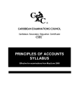 CARIBBEAN EXAMINATIONS COUNCIL Caribbean Secondary Education Certificate CSEC ® PRINCIPLES OF ACCOUNTS SYLLABUS Effective for examinations from May/June 2008 CXC 10/G/SYLL 06 Published by the Caribbean Examinations Council All rights reserved. No part of this publication may be reproduced, stored in a retrieval system, or transmitted in any form, or by any means electronic, photocopying, recording or otherwise without prior permission of the author or publisher. Correspondence related to the syllabus should be addressed to: The Pro-Registrar Caribbean Examinations Council Caenwood Centre 37 Arnold Road, Kingston 5, Jamaica, W.I. Telephone: (876) 630-5200 Facsimile Number: (876) 967-4972 E-mail address: cxcwzo@cxc.org Website: www.cxc.org Copyright © 2006, by Caribbean Examinations Council The Garrison, St Michael BB14038, Barbados CXC 10/G/SYLL 06 ii Contents RATIONALE....................................................................................................................................................1 AIMS .................................................................................................................................................................1 GENERAL OBJECTIVES ...............................................................................................................................1 - 2 ORGANIZATION OF THE SYLLABUS .................................................................................................. 2 SUGGESTED TIME-TABLE ALLOCATION ...............................................................................................3 CERTIFICATION AND DEFINITION OF PROFILE DIMENSIONS......................................................3 FORMAT OF THE EXAMINATIONS .........................................................................................................4 - 5 SECTION 1 – INTRODUCTION TO PRINCIPLES OF ACCOUNTS ...................................................6 - 7 SECTION 2 – THE CLASSIFIED BALANCE SHEET .............................................................................. 8 SECTION 3 – BOOKS OF ORIGINAL ENTRY .........................................................................................9 - 10 SECTION 4 – LEDGERS AND THE TRIAL BALANCE...........................................................................11 -12 SECTION 5 – THE PREPARATION AND ANALYSIS OF FINANCIAL STATEMENTS OF THE SOLE-TRADER ....................................................................................................13 - 14 SECTION 6 – END OF PERIOD ADJUSTMENTS ....................................................................................15 - 16 SECTION 7 – CONTROL SYSTEMS ...........................................................................................................17 - 18 SECTION 8 – INCOMPLETE RECORDS...................................................................................................19 SECTION 9 – ACCOUNTING FOR PARTNERSHIPS.............................................................................20 - 21 SECTION 10 – ACCOUNTING FOR CORPORATIONS (Limited Liability Companies)....................22 - 23 SECTION 11 – ACCOUNTING FOR CO-OPERATIVE SOCIETIES ....................................................24 SECTION 12 – ACCOUNTING FOR NON-TRADING (NON PROFIT) ORGANIZATIONS..........25 SECTION 13 – MANUFACTURING ACCOUNTS ..................................................................................26 CXC 10/G/SYLL 06 SECTION 14 – PAYROLL ACCOUNTING................................................................................................27 GUIDELINES FOR THE CONDUCT OF THE SCHOOL-BASED ASSESSMENT IN PRINCIPLES OF ACCOUNTS .............................................................................................................28 – 32 GUIDELINES FOR THE ALTERNATIVE TO THE SCHOOL-BASED ASSESSMENT.......................33 REGULATIONS FOR PRIVATE CANDIDATES .......................................................................................34 REGULATIONS FOR RESIT CANDIDATES .............................................................................................34 REGULATIONS FOR THE JANUARY SITTING ......................................................................................34 The Principles of Business syllabus (CXC 10/0/SYLL 96) was revised in 2006 for first examination in 2008. Teaching is expected to commence on the revised syllabus in September 2006. First Published in 1978 Revised in 1990, 1998, 2006 and 2013 Please check the website, www.cxc.org for updates on CXC’s syllabuses. CXC 10/G/SYLL 06 Principles of Accounts Syllabus ◆RATIONALE Accounting is the financial information system that provides relevant information to those who manage or use economic resources or engage in other economic activity. Principles of Accounts is a course of study that provides an introduction to the principles and techniques that accountants employ in measuring, processing, evaluating and communicating information about the financial performance and position of a business. This course in Principles of Accounts helps students to develop an understanding of a range of theoretical and practical techniques used in accounting. It helps to develop skills that should enable them to participate more effectively and responsibly in today’s business environment, to improve the management of personal financial activities, such as, budgeting, savings and investment. In addition, this course prepares students for post-secondary and professional studies in accounting. The syllabus also seeks to instill tenets of the Ideal Caribbean as articulated by the CARICOM Caribbean Education Task Force (CTF) and adopted by the CARICOM Heads of Government at their 18th Summit. To this end the syllabus contains objectives and content intended to nurture and improve students’ multiple literacy skills, as well as their management, economic and entrepreneurial skills and